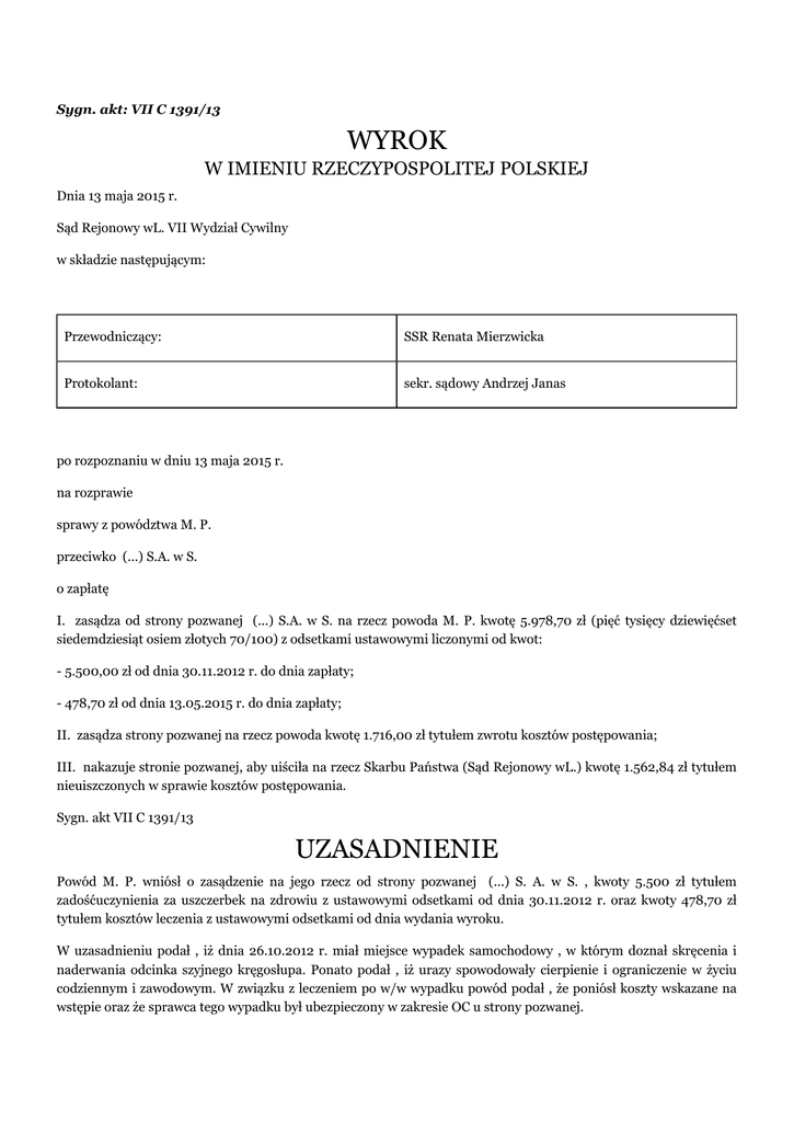 Sygn. akt: VII C 1391/13 WYROK W IMIENIU RZECZYPOSPOLITEJ POLSKIEJ Dnia 13 maja 2015 r. Sąd Rejonowy wL. VII Wydział Cywilny w składzie następującym: Przewodniczący: SSR Renata Mierzwicka Protokolant: sekr. sądowy Andrzej Janas po rozpoznaniu w dniu 13 maja 2015 r. na rozprawie sprawy z powództwa M. P. przeciwko (...) S.A. w S. o zapłatę I. zasądza od strony pozwanej (...) S.A. w S. na rzecz powoda M. P. kwotę 5.978,70 zł (pięć tysięcy dziewięćset siedemdziesiąt osiem złotych 70/100) z odsetkami ustawowymi liczonymi od kwot: - 5.500,00 zł od dnia 30.11.2012 r. do dnia zapłaty; - 478,70 zł od dnia 13.05.2015 r. do dnia zapłaty; II. zasądza strony pozwanej na rzecz powoda kwotę 1.716,00 zł tytułem zwrotu kosztów postępowania; III. nakazuje stronie pozwanej, aby uiściła na rzecz Skarbu Państwa (Sąd Rejonowy wL.) kwotę 1.562,84 zł tytułem nieuiszczonych w sprawie kosztów postępowania. Sygn. akt VII C 1391/13 UZASADNIENIE Powód M. P. wniósł o zasądzenie na jego rzecz od strony pozwanej (...) S. A. w S. , kwoty 5.500 zł tytułem zadośćuczynienia za uszczerbek na zdrowiu z ustawowymi odsetkami od dnia 30.11.2012 r. oraz kwoty 478,70 zł tytułem kosztów leczenia z ustawowymi odsetkami od dnia wydania wyroku. W uzasadnieniu podał , iż dnia 26.10.2012 r. miał miejsce wypadek samochodowy , w którym doznał skręcenia i naderwania odcinka szyjnego kręgosłupa. Ponato podał , iż urazy spowodowały cierpienie i ograniczenie w życiu codziennym i zawodowym. W związku z leczeniem po w/w wypadku powód podał , że poniósł koszty wskazane na wstępie oraz że sprawca tego wypadku był ubezpieczony w zakresie OC u strony pozwanej. Strona pozwana (...) S. A. w S. wniosła o oddalenie powództwa w całości podnosząc , iż wypłaciła powodowi kwotę 2.500 zł i żądanie ponad tą kwotę jest wygórowane. Nadto zarzuciła , że paragon nie stanowi dowodu na to że to powód poniósł koszty leczenia oraz że miał on możliwość leczenia w ramach NFZ. Sąd ustalił następujący stan faktyczny: W dniu 26.10.2012 r. powód uczestniczył w zdarzeniu drogowym , którego sprawca ubezpieczony był w zakresie OC u strony pozwanej. Strona pozwana dnia 27.11.2012 r. wypłaciła powodowi kwotę 2.500 zł tytułem zadośćuczynienia (bezsporne). W następstwie w/w zdarzenia powód doznał skręcenia i naderwania odcinka szyjnego kręgosłupa. Po wypadku powód miał ograniczoną ruchomość kręgosłupa szyjnego ze wzmożeniem napięcia mięśni przykręgosłupowych. Powód przez okres 3 tygodni nosił miękki kołnierz ortopedyczny , zażywał leki przeciwbólowe i uczestniczył w rehabilitacji .Obecnie w związku ze zdarzeniem nie stwierdza się u niego uszczerbku na zdrowiu. Powód odczuwał ból i cierpienie w związku z doznanymi urazami , nie był w stanie w pełni funkcjonować samodzielnie w życiu codziennym , przebywał na zwolnieniu lekarskim do 30.11.2012 r. Do chwili obecnej odczuwa w niewielkim stopniu zaburzenia stresowe pourazowe , nie wymagające leczenia. Powód poniósł koszt rehabilitacji w kwocie 400 zł oraz leków w kwocie 115,70 zł. Dowód : kserokopie faktur oraz rachunek z dnia 01.03.2012 r. K-9-13 :opinia biegłej J. W. i S. L. K-48-53 i 75-77 :kserokopia zwolnień lekarskich K-93-94 :zeznania powoda K-96 :opinia biegłych K. B. i B. K. K-138-141 Sąd zważył, co następuje: Powództwo zasługuje na uwzględnienie w całości. Bezsporne jest , że w dniu 26.10.2012 r. powód uczestniczył w zdarzeniu drogowym , którego sprawca ubezpieczony był w zakresie OC u strony pozwanej oraz ze strona pozwana dnia 27.11.2012 r. wypłaciła powodowi kwotę 2.500 zł tytułem zadośćuczynienia. Natomiast sporna była wysokość zadośćuczynienia należnego powodowi oraz okoliczność możliwości korzystania z leczenia w ramach NFZ a nie prywatnego oraz okoliczność poniesienia przez powoda kosztów leczenia w kwocie wskazanej w pozwie. Na podstawie opinii biegłych i przesłuchania powoda Sąd ustalił, jakie skutki na zdrowiu powoda wywarło przedmiotowe zdarzenie. Powód doznał skręcenia i naderwania odcinka szyjnego kręgosłupa , co powodowało ograniczoną ruchomość kręgosłupa szyjnego ze wzmożeniem napięcia mięśni przykręgosłupowych. Z tego powodu powód przez okres 3 tygodni nosił miękki kołnierz ortopedyczny , zażywał leki przeciwbólowe i uczestniczył w rehabilitacji a do dnia 30.11.2012 r. przebywał na zwolnieniu lekarskim. Do chwili obecnej powód odczuwa w niewielkim stopniu zaburzenia stresowe pourazowe , nie wymagające leczenia. Jak wynika z kserokopii i oryginałów faktur oraz rachunku z dnia 01.03.2012 r. powód poniósł koszty rehabilitacji w kwocie 400 zł a koszty leków i kołnierza w łącznej kwocie 115,70 zł. Przedłożone faktury i rachunek są imienne i zdaniem Sadu nie ma wątpliwości (jak zarzucała strona pozwana) że koszty te poniósł powód. Natomiast okolicznością powszechnie znana i nie wymagająca dowodu jest kilkumiesięczna konieczność oczekiwania na rehabilitacje w ramach NFZ , które na marginesie należy zauważyć jest także leczeniem na koszt powoda , z jego ubezpieczenia. Tak więc strona pozwana jest zobowiązana do zwrócenia tych kosztów powodowi. W ocenie Sądu powód także słusznie zakwestionował wysokość wypłaconego jemu zadośćuczynienia a kwota wskazana w pozwie wraz z kwotą już wypłaconą nie jest wygórowana i jest adekwatna do doznanego uszczerbku na zdrowiu. Zgodnie z art. 445 § 1 KC w zw. z art. 444 KC w razie uszkodzenia ciała lub wywołania rozstroju zdrowia naprawienie szkody obejmuje wszelkie wynikłe z tego powodu koszty. Sąd może przyznać nadto poszkodowanemu odpowiednią sumę tytułem zadośćuczynienia pieniężnego za doznaną krzywdę. Chodzi tu o krzywdę ujmowaną jako cierpienie fizyczne (ból i inne dolegliwości), cierpienia psychiczne, ujemne uczucia przeżywane w związku z cierpieniami fizycznymi lub następstwami usz