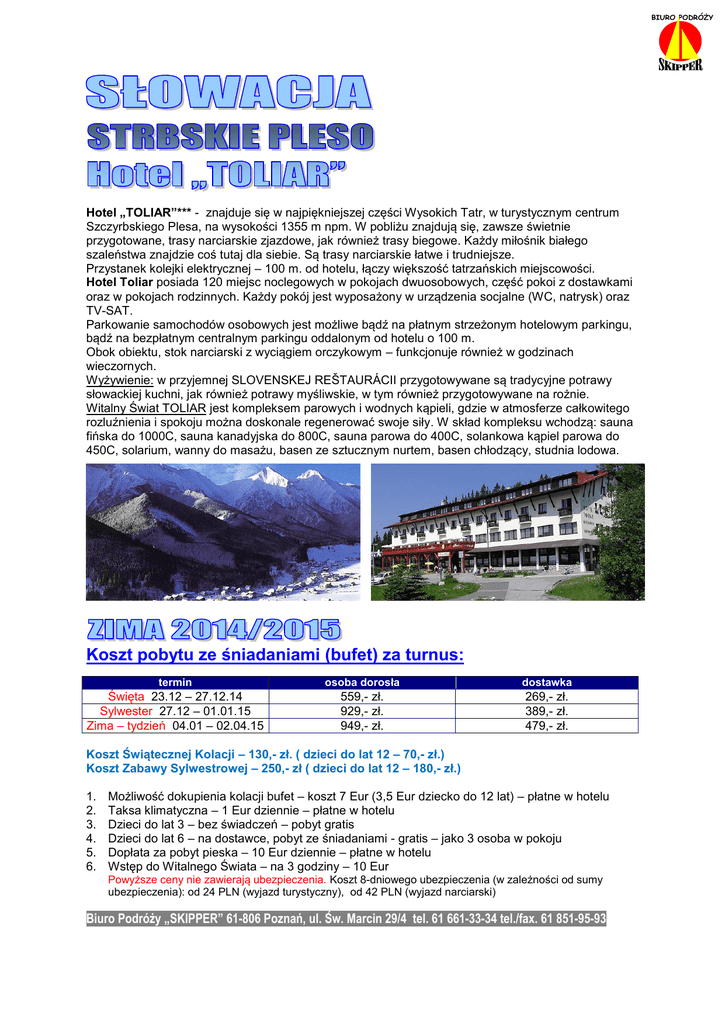 BIURO PODRÓŻY Hotel „TOLIAR”*** - znajduje się w najpiękniejszej części Wysokich Tatr, w turystycznym centrum Szczyrbskiego Plesa, na wysokości 1355 m npm. W pobliżu znajdują się, zawsze świetnie przygotowane, trasy narciarskie zjazdowe, jak również trasy biegowe. Każdy miłośnik białego szaleństwa znajdzie coś tutaj dla siebie. Są trasy narciarskie łatwe i trudniejsze. Przystanek kolejki elektrycznej – 100 m. od hotelu, łączy większość tatrzańskich miejscowości. Hotel Toliar posiada 120 miejsc noclegowych w pokojach dwuosobowych, część pokoi z dostawkami oraz w pokojach rodzinnych. Każdy pokój jest wyposażony w urządzenia socjalne (WC, natrysk) oraz TV-SAT. Parkowanie samochodów osobowych jest możliwe bądź na płatnym strzeżonym hotelowym parkingu, bądź na bezpłatnym centralnym parkingu oddalonym od hotelu o 100 m. Obok obiektu, stok narciarski z wyciągiem orczykowym – funkcjonuje również w godzinach wieczornych. Wyżywienie: w przyjemnej SLOVENSKEJ REŠTAURÁCII przygotowywane są tradycyjne potrawy słowackiej kuchni, jak również potrawy myśliwskie, w tym również przygotowywane na rożnie. Witalny Świat TOLIAR jest kompleksem parowych i wodnych kąpieli, gdzie w atmosferze całkowitego rozluźnienia i spokoju można doskonale regenerować swoje siły. W skład kompleksu wchodzą: sauna fińska do 1000C, sauna kanadyjska do 800C, sauna parowa do 400C, solankowa kąpiel parowa do 450C, solarium, wanny do masażu, basen ze sztucznym nurtem, basen chłodzący, studnia lodowa. Koszt pobytu ze śniadaniami (bufet) za turnus: termin osoba dorosła dostawka Święta 23.12 – 27.12.14 Sylwester 27.12 – 01.01.15 Zima – tydzień 04.01 – 02.04.15 559,- zł. 929,- zł. 949,- zł. 269,- zł. 389,- zł. 479,- zł. Koszt Świątecznej Kolacji – 130,- zł. ( dzieci do lat 12 – 70,- zł.) Koszt Zabawy Sylwestrowej – 250,- zł ( dzieci do lat 12 – 180,- zł.) 1. 2. 3. 4. 5. 6. Możliwość dokupienia kolacji bufet – koszt 7 Eur (3,5 Eur dziecko do 12 lat) – płatne w hotelu Taksa klimatyczna – 1 Eur dziennie – płatne w hotelu Dzieci do lat 3 – bez świadczeń – pobyt gratis Dzieci do lat 6 – na dostawce, pobyt ze śniadaniami - gratis – jako 3 osoba w pokoju Dopłata za pobyt pieska – 10 Eur dziennie – płatne w hotelu Wstęp do Witalnego Świata – na 3 godziny – 10 Eur Powyższe ceny nie zawierają ubezpieczenia. Koszt 8-dniowego ubezpieczenia (w zależności od sumy ubezpieczenia): od 24 PLN (wyjazd turystyczny), od 42 PLN (wyjazd narciarski) Biuro Podróży „SKIPPER” 61-806 Poznań, ul. Św. Marcin 29/4 tel. 61 661-33-34 tel./fax. 61 851-95-93