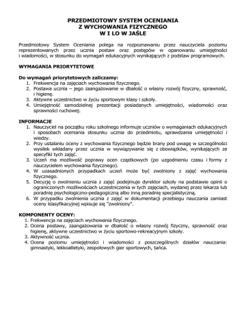 PRZEDMIOTOWY SYSTEM OCENIANIA Z WYCHOWANIA FIZYCZNEGO W I LO W JAŚLE Przedmiotowy System Oceniania polega na rozpoznawaniu przez nauczyciela poziomu reprezentowanych przez ucznia postaw oraz postępów w opanowaniu umiejętności i wiadomości, w stosunku do wymagań edukacyjnych wynikających z podstaw programowych. WYMAGANIA PRIORYTETOWE Do wymagań priorytetowych zaliczamy: 1. Frekwencja na zajęciach wychowania fizycznego. 2. Postawa ucznia – jego zaangażowanie w dbałość o własny rozwój fizyczny, sprawność, i higienę. 3. Aktywne uczestnictwo w życiu sportowym klasy i szkoły. 4. Umiejętność samodzielnej prezentacji posiadanych umiejętności, wiadomości oraz sprawności ruchowej. INFORMACJE 1. Nauczyciel na początku roku szkolnego informuje uczniów o wymaganiach edukacyjnych i sposobach oceniania stosunku ucznia do przedmiotu, sprawdzania umiejętności i wiedzy. 2. Przy ustalaniu oceny z wychowania fizycznego będzie brany pod uwagę w szczególności wysiłek wkładany przez ucznia w wywiązywanie się z obowiązków, wynikających ze specyfiki tych zajęć. 3. Uczeń ma możliwość poprawy ocen cząstkowych (po uzgodnieniu czasu i formy z nauczycielem wychowania fizycznego). 4. W uzasadnionych przypadkach uczeń może być zwolniony z zajęć wychowania fizycznego. 5. Decyzję o zwolnieniu ucznia z zajęć podejmuje dyrektor szkoły na podstawie opinii o ograniczonych możliwościach uczestniczenia w tych zajęciach, wydanej przez lekarza lub poradnię psychologiczno-pedagogiczną albo inną poradnię specjalistyczną. 6. W przypadku zwolnienia ucznia z zajęć w dokumentacji przebiegu nauczania zamiast oceny klasyfikacyjnej wpisuje się "zwolniony". KOMPONENTY OCENY: 1. Frekwencja na zajęciach wychowania fizycznego. 2. Ocena postawy, zaangażowania w dbałość o własny rozwój fizyczny, sprawność oraz higienę, aktywne uczestnictwo w życiu sportowo-rekreacyjnym szkoły. 3. Aktywność ucznia. 4. Ocena poziomu umiejętności i wiadomości z poszczególnych działów nauczania: gimnastyki, lekkoatletyki, zespołowych gier sportowych, tańca. KRYTERIA OCENIANIA Z WYCHOWANIA FIZYCZNEGO W I LO W JAŚLE OCENA CELUJACA 1. Celująca frekwencja - uczestnictwo we wszystkich zajęciach w semestrze. 2. Celująca postawa - stosunek ucznia do przedmiotu nie budzi żadnych zastrzeżeń, uczeń: posiada właściwy strój sportowy obowiązujący na zajęciach (odpowiednia koszulka, spodenki, obuwie sportowe ustalone wcześniej z nauczycielem WF), zawsze ćwiczy i jest przygotowany do zajęć (zawsze ma strój sportowy), * nigdy nie spóźnia się na zajęcia, zawsze przestrzega warunków higieniczno-zdrowotnych, jest wzorem na zajęciach wychowania fizycznego w szkole i środowisku propagując zdrowy styl życia, jest zdyscyplinowany, ambitny, koleżeński. 3. Celująca aktywność – uczeń: systematycznie reprezentuje szkołę w zawodach międzyszkolnych, wykazuje znajomość metodyki prowadzenia zajęć sportowo – rekreacyjnych, w tym umiejętność prowadzenia fragmentów lekcji wychowania fizycznego. 4. Otrzymał oceny celujące i bardzo dobre ze sprawdzianów umiejętności i widomości. OCENA BARDZO DOBRA 1. Bardzo dobra frekwencja - możliwość opuszczenia 1 (jednej) lekcji w semestrze (przez opuszczoną lekcję rozumieć należy nieobecność nieusprawiedliwioną), 2. Bardzo dobra postawa - stosunek ucznia do przedmiotu nie budzi zastrzeżeń: posiada właściwy strój sportowy obowiązujący na zajęciach (odpowiednia koszulka, spodenki, obuwie sportowe ustalone wcześniej z nauczycielem WF), dopuszcza się 1 (jeden) brak stroju na semestr (mimo obecności brak uczestnictwa w zajęciach), * dopuszcza się 2 (dwa) spóźnienia na zajęcia (przez spóźnienie należy rozumieć nieobecność na lekcji do 10 minut od dzwonka rozpoczynającego lekcję), przestrzega warunków higieniczno-zdrowotnych, zdyscyplinowany, ambitny, koleżeński. 3. Bardzo dobra aktywność – uczeń wykazuje znajomość metodyki prowadzenia zajęć sportowo – rekreacyjnych, w tym umiejętność prowadzenia fragmentów lekcji wychowania fizycznego. 4. Otrzymał oceny co najmniej bardzo dobre i dobre ze sprawdzianów umiejętności i widomości. OCENA DOBRA 1. Dobra frekwencja - możliwość opuszczenia 2 (dwóch) lekcji w semestrze (przez opuszczoną lekcję rozumieć należy nieobecność nieusprawiedliwioną), 2. Dobra postawa - stosunek ucznia do przedmiotu nie budzi zastrzeżeń: posiada właściwy strój sportowy obowiązujący na zajęciach (odpowiednia koszulka, spodenki, obuwie sportowe ustalone wcześniej z nauczycielem WF), dopuszcza się 2 (dwa) braki stroju na semestr (mimo obecności brak uczestnictwa w zajęciach), * dopuszcza się 3 (trzy) spóźnienia na zajęcia (przez spóźnienie należy rozumieć nieobecność na lekcji do 10 minut od dzwonka rozpoczynającego lekcję), przestrzega warunków higieniczno-zdrowotnych, zdyscyplinowany, koleżeński. 3. Dobra aktywność - postawa ucznia i jego stosunek do kultury fizycznej nie budzi większych zastrzeżeń. Wykazuje dość dobre postępy w osobistym usprawnieniu. Nie bierze udziału w pozalekcyjnych zajęciach sportowych. Potrafi wykorzystać posiadane umiejętności przy pomocy nauczyciela. 4. Otrzymał oceny co najmniej dobre i dostateczne ze sprawdzianów umiejętności i widomości. OCENA DOSTATECZNA 1. Dostateczna frekwencja - możliwość opuszczenia 3 (trzech) lekcji w semestrze (przez opuszczoną lekcję rozumieć należy nieobecność nieusprawiedliwioną), 2. Dostateczna postawa - stosunek ucznia do przedmiotu budzi pewne zastrzeżenia: nie zawsze posiada właściwy strój sportowy obowiązujący na zajęciach (odpowiednia koszulka, spodenki, obuwie sportowe ustalone wcześniej z nauczycielem WF), dopuszcza się 3 (trzy) braki stroju na semestr (mimo obecności brak uczestnictwa w zajęciach), * dopuszcza się 4 (cztery) spóźnienia na zajęcia (przez spóźnienie należy rozumieć nieobecność na lekcji 
