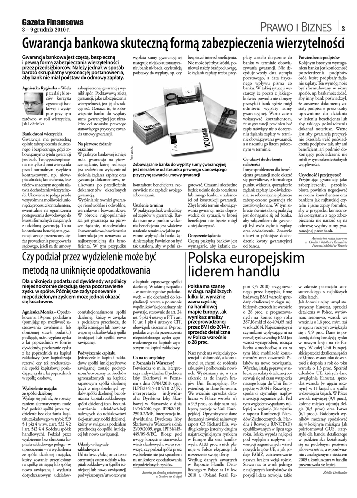 3 3 – 9 grudnia 2010 r. Gwarancja bankowa skuteczną formą zabezpieczenia wierzytelności Gwarancja bankowa jest częstą, bezpieczną i pewną formą zabezpieczania wierzytelności przez przedsiębiorców. Należy jednak w sposób bardzo skrupulatny wykonać jej postanowienia, aby bank nie miał podstaw do odmowy zapłaty. Bank chroni wierzyciela Gwarancja ma powszechną opinię zabezpieczenia skutecznego i bezpiecznego, gdyż zobowiązanym z tytułu gwarancji jest bank. Ten typ zabezpieczenia nie tylko chroni wierzyciela przed normalnym ryzykiem kontraktowym, np. niewypłacalnością kontrahenta, lecz także w znacznym stopniu ułatwia dochodzenie wierzytelności. Ułatwienie to polega przede wszystkim na możliwości uniknięcia procesu z kontrahentem, ewentualnie na ograniczeniu postępowania dowodowego do kwestii formalnych związanych z udzieloną gwarancją. To na kontrahenta beneficjenta gwarancji zostaje przerzucony ciężar prowadzenia postępowania sądowego, jeżeli na tle umowy zabezpieczonej gwarancją wynikł spór. Podstawową zaletą gwarancji, jako zabezpieczenia wierzytelności, jest jej abstrakcyjność. Oznacza to, że zobowiązanie banku do wypłaty sumy gwarancyjnej jest niezależne od stosunku prawnego stanowiącego przyczynę zawarcia umowy gwarancji. Na pierwsze żądanie oraz inne W praktyce bankowej istnieje m.in. gwarancja na pierwsze żądanie, której realizacja jest uzależniona wyłącznie od złożenia żądania zapłaty, oraz gwarancja dokumentowa, realizowana po przedłożeniu dokumentów określonych gwarancją. Wyróżnia się również gwarancje nieodwołalne i odwołalne, warunkowe i bezwarunkowe. W obrocie najpopularniejsza jest gwarancja na pierwsze żądanie, nieodwołalna i bezwarunkowa, bowiem taka konstrukcja jest uznawana za najkorzystniejszą dla beneficjenta. W tym przypadku Zobowiązanie banku do wypłaty sumy gwarancyjnej jest niezależne od stosunku prawnego stanowiącego przyczynę zawarcia umowy gwarancji kontrahent beneficjenta rzeczywiście nie zapłacił swojego zobowiązania. Ustalenie terminu W praktyce jednak wiele zależy od zapisów w gwarancji. Bardzo istotne z punktu widzenia beneficjenta jest właściwe ustalenie terminu, w jakim powinno wpłynąć do banku żądanie zapłaty. Powinien on być tak ustalony, aby w pełni za- Czy podział przez wydzielenie może być metodą na uniknięcie opodatkowania Dla uniknięcia podatku od dywidendy wspólnicy niejednokrotnie decydują się na pozostawienie zysku w spółce. Późniejsze zadysponowanie niepodzielonym zyskiem może jednak okazać się kosztowne. Agnieszka Morska – Opodatkowaniu -proc. podatkiem (pomijając np. możliwość zastosowania zwolnienia lub obniżonej stawki podatku) podlegają m.in. wypłata zysku z lat poprzednich w formie dywidendy, przekazanie zysku z lat poprzednich na kapitał zakładowy (tzw. kapitalizacja rezerw) czy też przekształcenie spółki kapitałowej posiadającej zyski z lat poprzednich w spółkę osobową. Wydzielenie majątku ze spółki dzielonej Wydaje się jednak, że rozwiązaniem alternatywnym może być podział spółki przez wydzielenie bez obniżania kapitału zakładowego (w trybie § pkt w zw. z art. § i art. § Kodeksu spółek handlowych). Podział przez wydzielenie bez obniżania kapitału zakładowego polega – w uproszczeniu – na wydzieleniu ze spółki dzielonej majątku, który zostanie przeniesiony na spółkę istniejącą lub spółkę nowo zawiązaną, i wydaniu dotychczasowym udziałow- bezpieczał interes beneficjenta. Nie może być zbyt krótki, ponieważ należy brać pod uwagę, że żądanie zapłaty trzeba przy- fot.: sxc.hu Agnieszka Rygielska – Wielu przedsiębiorców korzysta z gwarancji bankowej i występuje przy tym zarówno w roli wierzyciela, jak i dłużnika. wypłata sumy gwarancyjnej następuje niejako automatycznie, bank nie bada, czy istnieją podstawy do wypłaty, np. czy com/akcjonariuszom spółki dzielonej, którzy w związku z podziałem przechodzą do spółki istniejącej lub nowo zawiązanej udziałów/akcji spółki istniejącej lub spółki nowo zawiązanej. Podwyższenie kapitału Jednocześnie kapitał zakładowy spółki istniejącej/nowo zawiązanej zostaje podwyższony/utworzony ze środków zgromadzonych na kapitale zapasowym spółki dzielonej (czyli z niepodzielonych zysków spółki dzielonej) bez obniżania kapitału zakładowego spółki dzielonej (tzn. bez unicestwiania udziałów/akcji należących do udziałowców/ akcjonariuszy spółki dzielonej, którzy w związku z podziałem przechodzą do spółki istniejącej lub nowo zawiązanej). Udziały w kapitale zakładowym Udziałowcy/akcjonariusze otrzymują zatem udziały w kapitale zakładowym (spółki istniejącej lub nowo zawiązanej) podwyższonym/utworzonym z kapitału zapasowego spółki dzielonej. W takim przypadku – w ocenie organów podatkowych – nie dochodzi do kapitalizacji rezerw, a po stronie wspólników/akcjonariuszy nie powstaje, stosownie do art. ust. pkt ustawy o PIT i art. ust. pkt ustawy o CIT, obowiązek uiszczenia -proc. podatku z tytułu przeznaczenia niepodzielonego zysku zgromadzonego na kapitale zapasowym na kapitał zakładowy. Co na to urzędnicy z Poznania i z Warszawy? Potwierdza to m.in. interpretacja indywidualna Dyrektora Izby Skarbowej w Poznaniu z dnia //, sygn. ILPB/-/-/JK; interpretacja indywidualna Dyrektora Izby Skarbowej w Warszawie z dnia //, sygn. IPPB//-/MK, interpretacja indywidualna Dyrektora Izby Skarbowej w Warszawie z dnia //, sygn. IPPB//-/EC. Biorąc pod uwagę korzystne stanowiska władz skarbowych, warto rozważyć, czy podział spółki przez wydzielenie nie jest sposobem na uniknięcie opodatkowania niepodzielonych zysków. Autorka jest doradcą podatkowym w Sendero tax & legal gotować. Czasami niezbędne będzie udanie się do notariusza lub innego banku, w zależności od konstrukcji gwarancji. Zbyt krótki termin obowiązywania gwarancji może doprowad