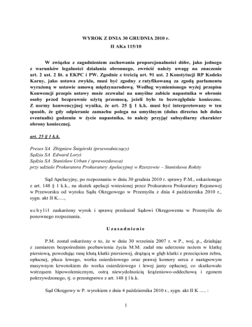 WYROK Z DNIA 30 GRUDNIA 2010 r. II AKa 115/10 W związku z zagadnieniem zachowania proporcjonalności dóbr, jako jednego z warunków legalności działania obronnego, zwrócić należy uwagę na znaczenie art. 2 ust. 2 lit. a EKPC i PW. Zgodnie z treścią art. 91 ust. 2 Konstytucji RP Kodeks Karny, jako ustawa zwykła, musi być zgodny z ratyfikowaną za zgodą parlamentu wyrażoną w ustawie umową międzynarodową. Według wymienionego wyżej przepisu Konwencji przepis ustawy może zezwalać na umyślne zabicie napastnika w obronie osoby przed bezprawnie użytą przemocą, jeżeli było to bezwzględnie konieczne. Z normy konwencyjnej wynika, że art. 25 § 1 k.k. musi być interpretowany w ten sposób, że gdy odpieranie zamachu polega na umyślnym (dolus directus lub dolus eventualis) godzeniu w życie napastnika, to należy przyjąć subsydiarny charakter obrony koniecznej. art. 25 § 1 k.k. Prezes SA Zbigniew Śnigórski (przewodniczący) Sędzia SA Edward Loryś Sędzia SA Stanisław Urban ( sprawozdawca) przy udziale Prokuratora Prokuratury Apelacyjnej w Rzeszowie – Stanisława Rokity Sąd Apelacyjny, po rozpoznaniu w dniu 30 grudnia 2010 r. sprawy P.M., oskarżonego z art. 148 § 1 k.k., na skutek apelacji wniesionej przez Prokuratora Prokuratury Rejonowej w Przeworsku od wyroku Sądu Okręgowego w Przemyślu z dnia 4 października 2010 r., sygn. akt II K....., u c h y l i ł zaskarżony wyrok i sprawę przekazał Sądowi Okręgowemu w Przemyślu do ponownego rozpoznania. U za sa dnienie P.M. został oskarżony o to, że w dniu 30 września 2007 r. w P., woj. p., działając z zamiarem bezpośrednim pozbawienia życia M.M. zadał mu uderzenie nożem w klatkę piersiową, powodując ranę kłutą klatki piersiowej, drążącą w głąb klatki z przecięciem żebra, opłucnej, płuca lewego, worka osierdziowego oraz prawej komory serca z następowym masywnym krwotokiem do worka osierdziowego i lewej jamy opłucnej, co skutkowało wstrząsem hipowolemicznym, ostrą niewydolnością krążeniowo-oddechową i zgonem pokrzywdzonego, tj. o przestępstwo z art. 148 § l k.k. Sąd Okręgowy w P. wyrokiem z dnia 4 października 2010 r., sygn. akt II K ..... : 1 I. na zasadzie art. l § 3 k.k. i art. 25 § l k.k. w zw. z art. 414 § l k.p.k. uniewinnił oskarżonego P.M. od zarzutu popełnienia przestępstwa z art. 148 § l k.k.; II. na zasadzie art. 632 pkt 2 k.p.k. kosztami postępowania sądowego obciążył Skarb Państwa ; III. na zasadzie art. 618 § l pkt 11 k.p.k. i § 19 w zw. z § 14 ust. l pkt 2 i ust. 2 pkt 5 i § 16 oraz § 2 ust. 1-2 rozporządzenia Ministra Sprawiedliwości z dnia 28 września 2002 r. w sprawie opłat za czynności adwokackie oraz zasad ponoszenia przez Skarb Państwa kosztów nieopłaconej pomocy prawnej udzielonej z urzędu zasądził od Skarbu Państwa na rzecz adw. M.L. – Kancelaria Adwokacka w P. kwotę 1 024,80 złotych z tytułu udziału obrońcy z urzędu przed Sądem I instancji. Powyższy wyrok zaskarżył w całości na niekorzyść oskarżonego prokurator Prokuratury Rejonowej w P., zarzucając obrazę przepisów postępowania mającą wpływ na treść orzeczenia, w tym: 1. art. 366 k.p.k. w zw. z art. 167 k.p.k. oraz art. 442 § 3 k.p.k. i art. 442 § 2 k.p.k. poprzez nieprzeprowadzenie na rozprawie dowodu z przesłuchania świadka W.B., bezpośrednio na rozprawie oraz nieujawnienie na rozprawie jego zeznań złożonych w toku postępowania przygotowawczego i sądowego pomimo, że przeprowadzenie tego dowodu według wytycznych Sądu Apelacyjnego zawartych w wyroku z dnia 25 marca 2010 roku było niezbędne z uwagi na posiadane przez świadka ważne informacje dotyczące wzajemnych relacji pomiędzy oskarżonym, pokrzywdzonym i innymi członkami rodziny oraz faktów poprzedzających bezpośrednio zajście z dnia 30 września 2007 r. – przez co wszystkie istotne okoliczności sprawy nie zostały wyjaśnione, 2. art. 7 k.p.k. i art. 410 i polegającą na przekroczeniu zasady swobodnej oceny dowodów co do oceny wyjaśnień oskarżonego oraz oparcie ustaleń faktycznych nie na całokształcie okoliczności ujawnionych w toku rozprawy głównej, a jedynie na ich części, poprzez: a) uznanie za wiarygodne w całości wyjaśnień oskarżonego, w sytuacji kiedy bez logicznego uzasadnienia przedstawił on zwłaszcza na ostatniej rozprawie nowe okoliczności dotyczące agresywnego zachowania się wobec niego pokrzywdzonego, przy jednoczesnej wewnętrznej niespójności tych wyjaśnień i sprzecznościach z zeznaniami świadków J.M., T.G., K.W., które również sąd w całości ocenił jako wiarygodne, b) oparcie ustaleń faktycznych o istnieniu wszystkich okoliczności uzasadniających obronę konieczną jedynie na tej części ustaleń, które przedstawił w wyjaśnieniach oskarżony, przy równoczesnym pominięciu tych istotnych ustaleń, z których wynikał wzajemny charakter gróźb, jak i całego konfliktu pomiędzy oskarżonym a pokrzywdzonym, oraz pominięcie ustaleń dotyczących zachowania się oskarżonego po ugodzeniu brata nożem, podczas gdy mają one istotne znaczenie dla oceny zaistnienia przesłanek określonych w art. 25 § 1 i 2 k.k., precyzyjnego określenia granic obrony koniecznej, a jednocześnie wynikają z wiarygodnych w ocenie Sądu zeznań świadków J. M., T.G., K.W. 3. obrazę art. 424 § l k.p.k. w zw. z art. 442 § 3 k.p.k., poprzez: 2 a) sprzeczność w treści uzasadnienia – której Sąd nie wyjaśnił – polegającą na jednoczesnym przyjęciu w oparciu o wiarygodne zdaniem Sądu wyjaśnienia oskarżonego, że nie chciał i nie miał on zamiaru zabić brata, a noża użył w celu obrony przed dalszą napaścią ze strony pokrzywdzonego i równoczesnym ustaleniu, że zachowanie P.M. świadczy, iż działał on w zamiarze ewentualnym pozbawienia życia swojego brata przewidując, że dokonując uderzenia nożem w klatkę piersiową może w ten sposób pozbawić go życia i ze skutkiem takim się godził, b) br