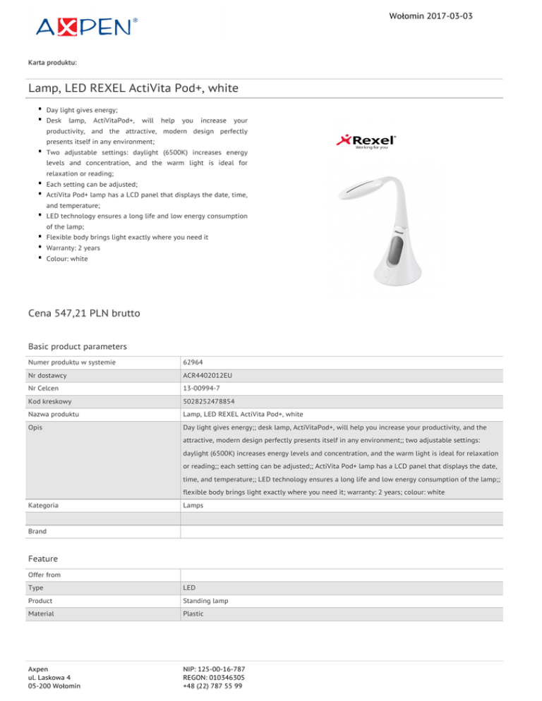 Wołomin 2017-03-03 Karta produktu: Lamp, LED REXEL ActiVita Pod+, white Day light gives energy; Desk lamp, ActiVitaPod+, will help you increase your productivity, and the attractive, modern design perfectly presents itself in any environment; Two adjustable settings: daylight (6500K) increases energy levels and concentration, and the warm light is ideal for relaxation or reading; Each setting can be adjusted; ActiVita Pod+ lamp has a LCD panel that displays the date, time, and temperature; LED technology ensures a long life and low energy consumption of the lamp; Flexible body brings light exactly where you need it Warranty: 2 years Colour: white Cena 547,21 PLN brutto Basic product parameters Numer produktu w systemie 62964 Nr dostawcy ACR4402012EU Nr Celcen 13-00994-7 Kod kreskowy 5028252478854 Nazwa produktu Lamp, LED REXEL ActiVita Pod+, white Opis Day light gives energy;; desk lamp, ActiVitaPod+, will help you increase your productivity, and the attractive, modern design perfectly presents itself in any environment;; two adjustable settings: daylight (6500K) increases energy levels and concentration, and the warm light is ideal for relaxation or reading;; each setting can be adjusted;; ActiVita Pod+ lamp has a LCD panel that displays the date, time, and temperature;; LED technology ensures a long life and low energy consumption of the lamp;; flexible body brings light exactly where you need it; warranty: 2 years; colour: white Kategoria Lamps Brand Feature Offer from Type LED Product Standing lamp Material Plastic Axpen ul. Laskowa 4 05-200 Wołomin NIP: 125-00-16-787 REGON: 010346305 +48 (22) 787 55 99 Wołomin 2017-03-03 Karta katalogowa produktu cd. Lamp, LED REXEL ActiVita Pod+, white Procurement vocabulary CPV 31521100-5 Certifications Warranty 2 Hit Standard New product New Colour Colour White Pozostałe zdjęcia produktu Serdecznie zapraszamy do współpracy Axpen zespół. Axpen ul. Laskowa 4 05-200 Wołomin NIP: 125-00-16-787 REGON: 010346305 +48 (22) 787 55 99