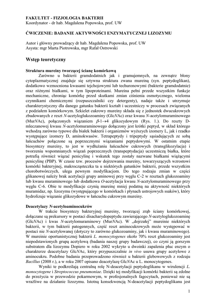 FAKULTET - FIZJOLOGIA BAKTERII Koordynator - dr hab. Magdalena Popowska, prof. UW ĆWICZENIE: BADANIE AKTYWNOŚCI ENZYMATYCZNEJ LIZOZYMU Autor i główny prowadzący dr hab. Magdalena Popowska, prof. UW Asysta: mgr Marta Piotrowska, mgr Rafał Ostrowski Wstęp teoretyczny Struktura mureiny tworzącej ścianę komórkową Zarówno u bakterii gramdodatnich jak i gramujemnych, na zewnątrz błony cytoplazmatycznej znajduje się sztywna struktura zwana mureiną (syn. peptydoglikan), dodatkowo wzmocniona kwasami tejchojowymi lub techuronowymi (bakterie gramdodatnie) oraz różnymi białkami, w tym lipoproteinami. Mureina pełni przede wszystkim funkcje mechaniczne, chroniąc komórkę przed skutkami zmian ciśnienia osmotycznego, wieloma czynnikami chemicznymi (rozpuszczalniki czy detergenty), nadaje także i utrzymuje charakterystyczny dla danego gatunku bakterii kształt i uczestniczy w procesach związanych z podziałem komórkowym. Szkielet cukrowy mureiny składa się z jednostek dwucukrowych zbudowanych z reszt N-acetyloglukozoaminy (GlcNAc) oraz kwasu N-acetylomuraminowego (MurNAc), połączonych wiązaniem -14 glikozydowym (Rys. 1.). Do reszty Dmleczanowej kwasu N-acetylomuraminowego dołączony jest krótki peptyd, w skład którego wchodzą zarówno typowe dla białek bakterii i organizmów wyższych izomery L, jak i rzadko występujące izomery D, aminokwasów. Tetrapeptydy i tripeptydy sąsiadujących ze sobą łańcuchów połączone są poprzecznymi wiązaniami peptydowymi. W ostatnim etapie biosyntezy mureiny, to jest w wydłużaniu łańcuchów cukrowych (transglikozylacja) i tworzeniu wspomnianych wiązań poprzecznych (transpeptydacja) uczestniczą białka, które potrafią również wiązać penicylinę i wskutek tego zostały nazwane białkami wiążącymi penicylinę (PBP). W czasie tzw. procesów dojrzewania mureiny, towarzyszących wzrostowi komórki bakteryjnej, makrocząsteczka ta u niektórych gatunków bakterii, przede wszystkim chorobotwórczych, ulega pewnym modyfikacjom. Do tego rodzaju zmian w części glikanowej należy brak acetylacji grupy aminowej przy węglu C-2 w resztach glukozoaminy lub kwasu muraminowego lub dodatkowa O-acetylacja kwasu N-acetylomuraminowego przy węglu C-6. Obie te modyfikacje czynią mureinę mniej podatną na aktywność niektórych muramidaz, np. lizozymu (występującego w komórkach i płynach ustrojowych ssaków), który hydrolizuje wiązanie glikozydowe w łańcuchu cukrowym mureiny. Deacetylazy N-acetyloaminocukrów W trakcie biosyntezy bakteryjnej mureiny, tworzącej zrąb ściany komórkowej, dołączane są prekursory w postaci disacharydopeptydu zawierającego N-acetyloglukozoaminę (GlcNAc) i kwas N-acetylomuraminowy (MurNAc). W „dojrzałej” mureinie niektórych bakterii, w tym bakterii patogennych, część reszt aminocukrowych może występować w postaci nie N-acetylowanej (dotyczy to zarówno glukozoaminy, jak i kwasu muraminowego). W mureinie oportunistycznej bakterii L. monocytogenes około 70% reszt glukozoaminy jest niepodstawionych grupą acetylową (badania naszej grupy badawczej), co czyni ją gorszym substratem dla lizozymu Dopiero w roku 2002 wykryto u dwoinki zapalenia płuc enzym o charakterze deacetylazy GlcNAc, który przypuszczalnie in vivo usuwa grupy acetylowe z aminocukru. Podobne badania przeprowadzono również u bakterii glebowowych z rodzaju Bacillus (2008 r.), a w roku 2007 opisano deacetylazę GlcNAc u L. monocytogenes. Wyniki te podkreślają centralną rolę N-deacetylacji peptydoglikanu w wirulencji L. monocytogene i Streptococcus pneumoniae. Dzięki tej modyfikacji komórki bakterii są zdolne do przeżycia w przewodzie pokarmowym, w profesjonalnych fagocytach, ponieważ nie są wrażliwe na działanie lizozymu. Istotną konsekwencją N-deacetylacji peptydoglikanu jest 1 zwiększenie przeżywalności bakterii w pierwszych, a także późnychj etapach procesu infekcji. Lizozym Enzym o właściwościach muramidazy, zdolny do hydrolizy wiązań -14 glikozydowych pomiędzy N-acetyloglukozoaminą (GlcNAc) oraz kwasem N-acetylomuraminowymo (MurNAc). Lizozym występuje w niektórych komórkach i płynach ustrojowych człowieka oraz zwierząt i stanowi bardzo istotną pierwszą barierę dla bakterii. Największe jego ilości można znaleźć we łzach oraz w białku jaja kurzego. G N-acetylmuramic acid (MurNAc) O CH2OH O H H OH H H LD-C DD-C O H H H CH2OH O H H OH H O H NH O H C CH3 C O C O CH 3 H N H C CH3 L-alanine C O T H N HOOC C H CH2 D-glutamic acid CH2 C O O H N C OH O meso-DAP H C (CH2)3 CH C O NH C H N D-alanine H3C C H C O H N D-alanine H3C C H COOH N -Acetylglucosamine A CH2OH O H H O NH C O CH 3 H O H NH C O CH 3 N-Acetylglucosamine (GlcNAc) E CH 3 C H D-alanine NH O C O C OH H C (CH2)3 CH O H N NH C meso-DAP C O CH2 CH2 D-glutamic acid HOOC C H H N C O H3C C H A L-alanine H N C O G H3C C H MurNAc T GlcNAc MurNAc Rysunek 1. Struktura mureiny (peptydoglikanu) Escherichia coli Wykonanie ćwiczenia Izolacja lizozymu z jaja kurzego oraz oznaczanie jego stężenia 1. Umyć dokładnie detergentem świeże jajko kurze, 2. Po rozbiciu jajka należy przelać białko do cylindra o objętości 50 ml w celu odczytania objętości, odczytaną wartość zanotować, 3. Białko kurze rozcieńczyć 1:1000 w buforze fosforanowym o pH=7,,4 2 4. Przygotować roztwór lizozymu krystalicznego (Serva) w stężeniu 1 mg/ml, a następnie wykonać szereg rozcieńczeń: 100, 10, 5 g/ml w probówkach typu Eppendorf. Przygotowanie hodowli Micrococcus lysodeikticus 1. Bakterie Micrococcus lysodeikticus zebrać z szalek i materiał z każdej szalki zawiesić w 4 ml buforu fosforanowego o pH=7,4. (UWAGA! Na poprzednich ćwiczeniach (2 dni wcześniej) rozsiać na szalki z agarem odżywczym Micrococcus lysodeikticus). 2. Tak przygotowana zawiesina będzie wykorzystana do oznaczenia aktywności lizozymu wg podanej poniżej tabeli. OZNACZANIE AKTYWNOŚCI ENZYMATYCZNEJ LIZOZYMU 1. Przygotować szereg probówek do oznacze