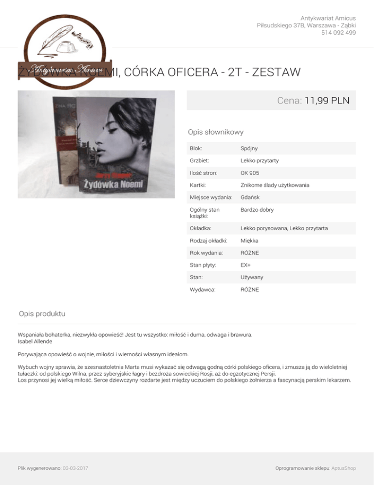 Antykwariat Amicus Piłsudskiego 37B, Warszawa - Ząbki 514 092 499 ŻYDÓWKA NOEMI, CÓRKA OFICERA - 2T - ZESTAW Cena: 11,99 PLN Opis słownikowy Blok: Spójny Grzbiet: Lekko przytarty Ilość stron: OK 905 Kartki: Znikome ślady użytkowania Miejsce wydania: Gdańsk Ogólny stan książki: Bardzo dobry Okładka: Lekko porysowana, Lekko przytarta Rodzaj okładki: Miękka Rok wydania: RÓŻNE Stan płyty: EX+ Stan: Używany Wydawca: RÓŻNE Opis produktu Wspaniała bohaterka, niezwykła opowieść! Jest tu wszystko: miłość i duma, odwaga i brawura. Isabel Allende Porywająca opowieść o wojnie, miłości i wierności własnym ideałom. Wybuch wojny sprawia, że szesnastoletnia Marta musi wykazać się odwagą godną córki polskiego oficera, i zmusza ją do wieloletniej tułaczki: od polskiego Wilna, przez syberyjskie łagry i bezdroża sowieckiej Rosji, aż do egzotycznej Persji. Los przynosi jej wielką miłość. Serce dziewczyny rozdarte jest między uczuciem do polskiego żołnierza a fascynacją perskim lekarzem. Plik wygenerowano: 03-03-2017 Oprogramowanie sklepu: AptusShop Antykwariat Amicus Piłsudskiego 37B, Warszawa - Ząbki 514 092 499 Galeria Plik wygenerowano: 03-03-2017 Powered by TCPDF (www.tcpdf.org) Oprogramowanie sklepu: AptusShop