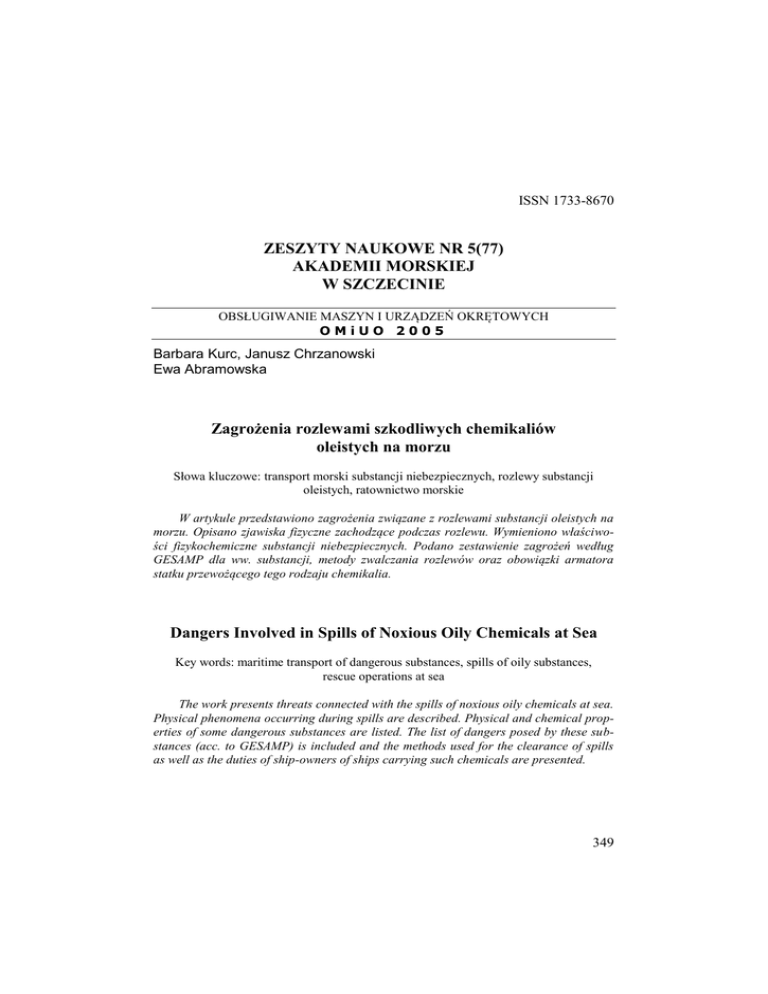 ISSN 1733-8670 ZESZYTY NAUKOWE NR 5(77) AKADEMII MORSKIEJ W SZCZECINIE OBSŁUGIWANIE MASZYN I URZĄDZEŃ OKRĘTOWYCH OMiUO 2005 Barbara Kurc, Janusz Chrzanowski Ewa Abramowska Zagrożenia rozlewami szkodliwych chemikaliów oleistych na morzu Słowa kluczowe: transport morski substancji niebezpiecznych, rozlewy substancji oleistych, ratownictwo morskie W artykule przedstawiono zagrożenia związane z rozlewami substancji oleistych na morzu. Opisano zjawiska fizyczne zachodzące podczas rozlewu. Wymieniono właściwości fizykochemiczne substancji niebezpiecznych. Podano zestawienie zagrożeń według GESAMP dla ww. substancji, metody zwalczania rozlewów oraz obowiązki armatora statku przewożącego tego rodzaju chemikalia. Dangers Involved in Spills of Noxious Oily Chemicals at Sea Key words: maritime transport of dangerous substances, spills of oily substances, rescue operations at sea The work presents threats connected with the spills of noxious oily chemicals at sea. Physical phenomena occurring during spills are described. Physical and chemical properties of some dangerous substances are listed. The list of dangers posed by these substances (acc. to GESAMP) is included and the methods used for the clearance of spills as well as the duties of ship-owners of ships carrying such chemicals are presented. 349 Barbara Kurc, Janusz Chrzanowski, Ewa Abramowska Wstęp Najbardziej zagrożone rozlewami olejowymi i chemikaliami są rejony portowe i drogi morskie zbiornikowców. Tor wodny Szczecin – Świnoujście jest wyjątkowo cennym regionem pod względem fizyko-geograficznym, a jego ochrona zalecana jest Dyrektywą Rady Europy. Wokół tego toru wodnego znajdują się obiekty przyrodnicze o najwyższych walorach [1]. Poważnym zagrożeniem dla tej cennej przyrody jest transport chemikaliów szkodliwych i niebezpiecznych, w opakowaniach lub przewożonych luzem [10]. Ze wzrostem przewozów ropy naftowej i innych ładunków niebezpiecznych zwiększa się ilość i tonaż statków, a wraz z tym prawdopodobieństwo wypadków i katastrof przebiegających z uwolnieniem tych substancji. Konieczne jest więc szczegółowe uregulowanie działalności morskiej przepisami prawnymi, normami technicznymi i jakościowymi, które mają na celu ochronę zdrowia i życia ludzkiego oraz ekosystemów wodnych [4]. Rozmiary wyrządzanych szkód ekologicznych, problemy z wypłatą rekompensat, koszty przywrócenia środowiska morskiego do pierwotnego stanu stały się nowymi, trudnymi do rozwiązania zagadnieniami. Zgromadzenie Ogólne IMO w Londynie w dniu 4 listopada 1993 roku uchwaliło rezolucję A. 741(18), która wprowadziła Międzynarodowy kodeks zarządzania bezpieczną eksploatacją statków i zapobieganiem zanieczyszczaniu (nowy IX rozdział konwencji SOLAS 74/78) [7]. Konwencje międzynarodowe narzucają ograniczoną objętość zbiorników ładunkowych celem zmniejszenia potencjalnego wycieku oraz zalecają stosowanie niezależnych systemów przepływu ładunku do i z każdego zbiornika. Podwyższa to koszt budowy chemikaliowców, ale zwiększa bezpieczeństwo życia i poprawia bezpieczeństwo ekologiczne. Wprowadzenie bardzo ostrych kryteriów projektowania, budowy, eksploatacji i kontroli chemikaliowców, ropowców i produktowców wymaga od konstruktorów, armatorów i załogi stosowania specjalistycznej wiedzy [6]. 1. Naturalne procesy zachodzące podczas rozlewów chemikaliów oleistych Najwyższy stopień zagrożenia na wodach znajdujących się pod jurysdykcją Urzędu Morskiego w Szczecinie występuje na stanowiskach: przeładunku paliw – MPH Szczecin (produkty ropopochodne), rozładunku chemikaliów – Zakłady Chemiczne „Police” (kwas siarkowy, amoniak), przeładunku paliw – MPH Świnoujście (produkty ropopochodne). Występują tam zagrożenia typu: kolizja, wejście na mieliznę, rozlew, wybuch, pożar, skażenie chemiczne. 350 Zagrożenia rozlewami szkodliwych chemikaliów oleistych na morzu Produkty przerobu ropy naftowej trwale zanieczyszczające środowisko morskie to przede wszystkim benzyny, nafty, oleje napędowe, opałowe, smarowe ciężkie i lekkie, parafiny i asfalty. W przypadku rozlewów substancje te mogą odparowywać, ulegać biodegradacji albo pozostawać w wodzie bardzo długo, czasami nawet latami. Olej i chemikalia wprowadzone do środowiska morskiego podlegają różnym fizycznym, chemicznym i biologicznym procesom i przemianom, a mianowicie: rozprzestrzenianiu, odparowywaniu, rozpuszczaniu i dyspersji w wodzie, emulgowaniu, sedymentacji, fotochemicznemu utlenianiu oraz mikrobiologicznej degradacji [2]. Chemikalia w środowisku morskim oddziałują toksycznie na organizmy żywe i charakteryzują się różną, często długotrwałą bioakumulacją. Na sposób i czas zwalczania rozlewów ma wpływ rodzaj substancji, ilość, grubość rozlanej warstwy, temperatura rozlanej substancji i otoczenia, gęstość, temperatura płynności, lepkość, ciepło parowania, prężność par, temperatura wrzenia i krzepnięcia oraz granice wybuchowości par substancji z powietrzem. Duże znaczenie mają stan morza, prędkość wiatru, pływy i prądy morskie. Jednym z procesów zachodzących po rozlewie jest rozpościeranie – zjawisko będące wynikiem dynamicznej równowagi między siłami grawitacji, bezwładności, tarcia, lepkości i napięcia powierzchniowego [12]. Pierwszym widocznym skutkiem rozlewu oleistych substancji szkodliwych na wodzie jest powstawanie plam. W praktyce rozpływ olejowy na morzu formuje się w długie pasy rozdzielone czystą wodą lub wodą pokrytą cienkim filmem olejowym. Na podstawie optycznego wyglądu rozlewu można określić grubość powłoki oraz oszacować ilość rozlanej substancji. W tabeli 1 podano przybliżone grubości oraz objętość rozlewów w zależności od barwy plamy olejowej. Tabela 1 Kalkulacja wielkości rozlewu w zależności od barwy plamy olejowej [12] Calculation of spill size based on its colour on water Grubo