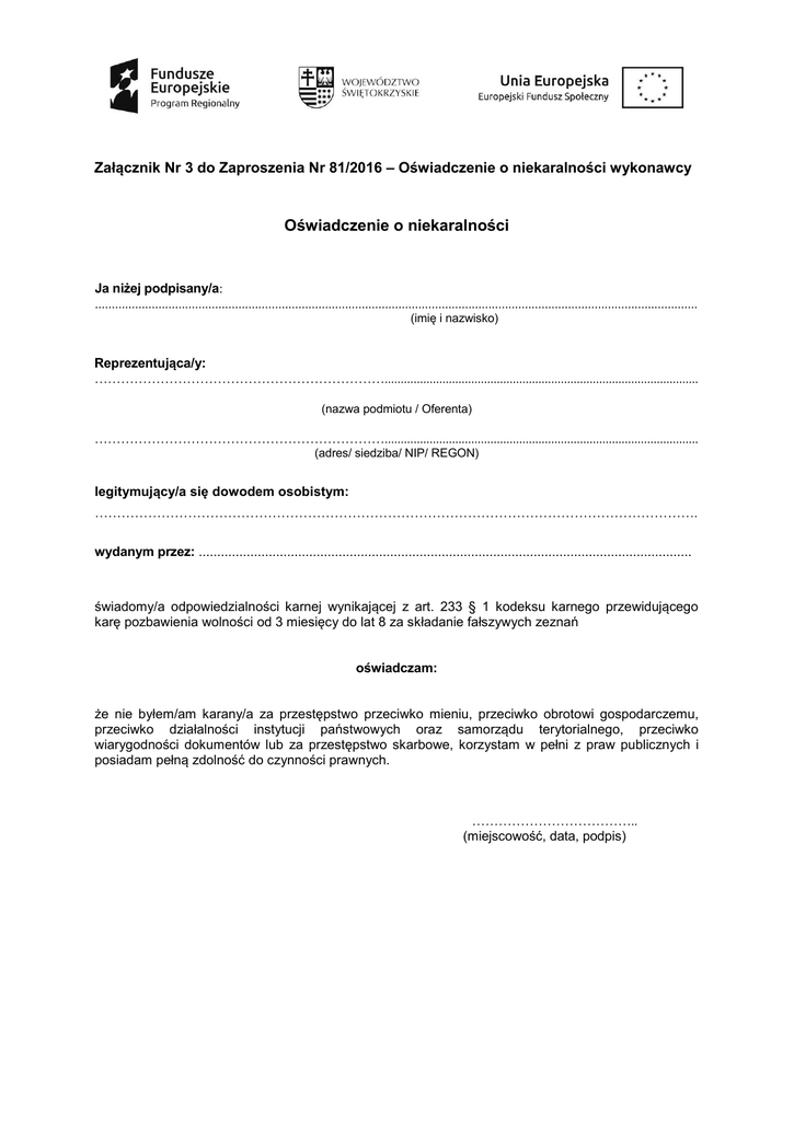 Załącznik Nr 3 do Zaproszenia Nr 81/2016 – Oświadczenie o niekaralności wykonawcy Oświadczenie o niekaralności Ja niżej podpisany/a: ..................................................................................................................................................................................... (imię i nazwisko) Reprezentująca/y: ………………………………………………………….................................................................................................. (nazwa podmiotu / Oferenta) ………………………………………………………….................................................................................................. (adres/ siedziba/ NIP/ REGON) legitymujący/a się dowodem osobistym: ………………………………………………………………………………………………………………………. wydanym przez: ...................................................................................................................................... świadomy/a odpowiedzialności karnej wynikającej z art. 233 § 1 kodeksu karnego przewidującego karę pozbawienia wolności od 3 miesięcy do lat 8 za składanie fałszywych zeznań oświadczam: że nie byłem/am karany/a za przestępstwo przeciwko mieniu, przeciwko obrotowi gospodarczemu, przeciwko działalności instytucji państwowych oraz samorządu terytorialnego, przeciwko wiarygodności dokumentów lub za przestępstwo skarbowe, korzystam w pełni z praw publicznych i posiadam pełną zdolność do czynności prawnych. ……………………………….. (miejscowość, data, podpis)