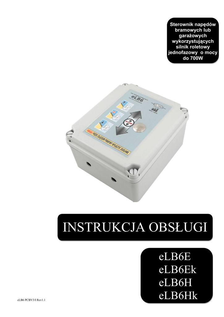 Sterownik napędów bramowych lub garażowych wykorzystujących silnik roletowy jednofazowy o mocy do 700W INSTRUKCJA OBSŁUGI eLB6 PCBV3/I Rev1.1 eLB6E eLB6Ek eLB6H eLB6Hk OZNACZENIE 1.0.0-E-NF B6:3.0.1/1.0.0 1.1.0-H-NF B6:3.0.1/3.0.0 1.3.0-E-NF B6:3.0.2/2.0.0 1.4.0-H-NF B6:3.0.2/4.0.0 UWAGI Wersja eLB6E Wersja eLB6H Wersja eLB6Ek Wersja eLB6Hk Przed montażem i pierwszym użyciem sterownika zapoznaj się dokładnie z instrukcją obsługi i zachowaj ją na wypadek konieczności użycia w przyszłości. Zgodnie z postanowieniami Dyrektywy Maszynowej 2006/42/WE oświadcza się, że produkt nie może zostać oddany do eksploatacji, aż do momentu, gdy maszyna finalna, do której jest wbudowany lub której jest podzespołem, uzyska oświadczenie o zgodności z dyrektywami oraz odpowiednimi przepisami, które maszyna finalna musi spełniać. Zalecenia i środki ostrożności dotyczące bezpieczeństwa. Przed przystąpieniem do montażu oraz użyciem napędu należy uważnie przeczytać wszystkie ostrzeżenia i zasady bezpieczeństwa. Nieprawidłowa instalacja i nieprzestrzeganie norm zawartych w instrukcji może spowodować poważne wypadki. Wszystkie prace instalacyjne powinny być wykonywane zgodnie z obowiązującymi przepisami i normami. Instalację sterownika mogą wykonywać tylko wykwalifikowane osoby z odpowiednimi uprawnieniami. Instalację należy przeprowadzić z zachowaniem podstawowej ochrony przed wyładowaniami ESD. Podczas montażu należy zachować szczególną ostrożność! Sterownik wykorzystuje napięcie 230Vac (zagrażające życiu i zdrowiu). Instalacja elektryczna musi być zabezpieczona wyłącznikiem różnicowo-prądowym 30mA. Brama musi spełniać wymogi norm EN 12604, EN 12605 i DIN EN 13241-1. Montaż napędu bramy musi być wykonany zgodnie z normami (EN 12453, EN 12445 i EN 12635). Wszystkie prace związane z poprawnym funkcjonowaniem urządzenia (podłączenie, rozruch, eksploatacja) muszą być przeprowadzane zgodnie z obowiązującymi przepisami w zakresie eksploatacji urządzeń elektrycznych- oraz zgodnie z przepisami BHP. Nie należy podłączać napędu do zasilania wcześniej niż podano to w instrukcji, nie stosowanie się do tego zalecenia może grozić porażeniem prądem. Przed przystąpieniem do instalacji należy sprawdzić stan mechaniczny bramy: nie powinna się nadmiernie kołysać, powinna się poruszać łatwo i płynnie. Brama musi spełniać obowiązujące normy. Przed przystąpieniem do instalacji należy usunąć niepotrzebne linki i zabezpieczyć wyposażenie, np. zamki. Podczas montażu w pobliżu bramy nie mogą znajdować się dzieci, osoby niepełnosprawne i pojazdy mechaniczne. Wszystkie stałe elementy kontrolne powinny być ulokowane w pobliżu bramy, ale z dala od ruchomych elementów i poza zasięgiem osób postronnych. Przed naprawą lub usunięciem jakichkolwiek części bramy, należy odłączyć zasilanie. Dzieci i osoby niepełnosprawne umysłowo nie mogą samodzielnie sterować bramą. Nie wolno stosować świetlówek jako sygnalizacji świetlnej. Uwagi bezpieczeństwa! Niedozwolone jest przechodzenie lub przejeżdżanie pod poruszającą się bramą. Niedozwolone jest podnoszenie lub przesuwanie za pomocą bramy przedmiotów lub osób. Nadajnik sterujący należy chronić przed dziećmi, gdyż mogą użyć go do zabawy. Bramę wolno uruchomić tylko wtedy, gdy cała strefa ruchu bramy jest dobrze widoczna i wolna od przeszkód. Przy uruchomieniu bramy należy uważać na inne osoby, zwierzęta domowe, znajdujące się w zasięgu jej działania. Napęd bramy wolno użytkować tylko wtedy, gdy wszyscy użytkownicy zostali poinstruowani na temat jego funkcjonowania i obsługi. eLB6E/eLB6Ek/eLB6H/eLB6Hk Strona 2 Niedostosowanie się do powyższych wskazówek może doprowadzić do poważnych skaleczeń lub zniszczenia sprzętu. Producent nie ponosi odpowiedzialności za szkody i zakłócenia w pracy wynikające z nieprzestrzegania niniejszej instrukcji montażu i obsługi. Niniejszego produktu można używać wyłącznie zgodnie z jego przeznaczeniem. Producent wyrobu nie ponosi odpowiedzialności za szkody spowodowane niewłaściwym lub niedbałym użytkowaniem. Zgodnie z obowiązującymi przepisami dotyczącymi utylizacji niepotrzebnego sprzętu przez użytkowników prywatnych w Unii Europejskiej przedmiotu zawierającego taki symbol NIE WOLNO wyrzucać wraz z innymi śmieciami. W tym przypadku użytkownik jest odpowiedzialny za odpowiednią utylizację przez dostarczenie urządzenia do wyznaczonego punktu, lub producenta który zajmie się jego dalszą utylizacją. Osobne zbieranie i przetwarzanie wtórne niepotrzebnych urządzeń ułatwia ochronę środowiska naturalnego i zapewnia, że utylizacja odbywa się w sposób chroniący zdrowie człowieka i środowisko. Uwaga ta dotyczy także zużytych baterii i akumulatorów. Sterownik eLB6 dla silników roletowych jednofazowych o mocy do 700W 1. Przeznaczenie eLB6 to sterownik dla napędów bramowych i garażowych wykorzystujący silnik roletowy rewersyjny jednofazowy z wbudowanymi krańcówkami zasilany napięciem 230Vac. Doskonale nadaje się do pracy ciągłej. Można zastosować go na parkingach osiedlowych, posesjach prywatnych i w firmach. Zalety sterownika: Sterowanie za pomocą nadajników (do 34) na częstotliwość 433,92MHz z kodem dynamicznie zmiennym Keeloq. Sterowanie na przycisk dzwonkowy. Sterowanie manipulatorem zewnętrznym lub umieszczonym na obudowie (Opcjonalnie). Funkcja automatycznego zamknięcia. Funkcja osiedlowa. Możliwość instalacji bariery podczerwieni. Możliwość instalacji listwy optycznej (1kHz). Wcześniejsze auto-zamknięcie bramy po przejechaniu bariery podczerwieni. Sygnalizacja świetlna ruchu bramy lub załączanie oświetlenia z opóźnionym wyłączeniem. Funkcja testowania fotokomórek zwiększająca bezpieczeństwo. Prosta procedura instalacji i programowania. Dostępne wersje: eLB6H,eLB6E - wersje z 1-przyciskiem sterowania sekwe