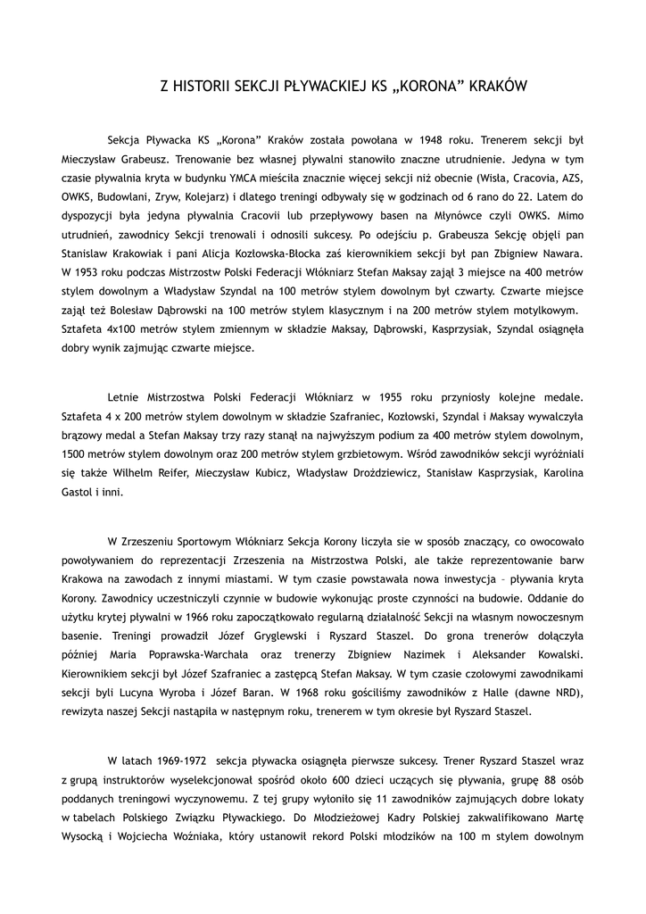 Z HISTORII SEKCJI PŁYWACKIEJ KS „KORONA” KRAKÓW Sekcja Pływacka KS „Korona” Kraków została powołana w 1948 roku. Trenerem sekcji był Mieczysław Grabeusz. Trenowanie bez własnej pływalni stanowiło znaczne utrudnienie. Jedyna w tym czasie pływalnia kryta w budynku YMCA mieściła znacznie więcej sekcji niż obecnie (Wisła, Cracovia, AZS, OWKS, Budowlani, Zryw, Kolejarz) i dlatego treningi odbywały się w godzinach od 6 rano do 22. Latem do dyspozycji była jedyna pływalnia Cracovii lub przepływowy basen na Młynówce czyli OWKS. Mimo utrudnień, zawodnicy Sekcji trenowali i odnosili sukcesy. Po odejściu p. Grabeusza Sekcję objęli pan Stanislaw Krakowiak i pani Alicja Kozłowska-Błocka zaś kierownikiem sekcji był pan Zbigniew Nawara. W 1953 roku podczas Mistrzostw Polski Federacji Włókniarz Stefan Maksay zajął 3 miejsce na 400 metrów stylem dowolnym a Władysław Szyndal na 100 metrów stylem dowolnym był czwarty. Czwarte miejsce zajął też Bolesław Dąbrowski na 100 metrów stylem klasycznym i na 200 metrów stylem motylkowym. Sztafeta 4x100 metrów stylem zmiennym w składzie Maksay, Dąbrowski, Kasprzysiak, Szyndal osiągnęła dobry wynik zajmując czwarte miejsce. Letnie Mistrzostwa Polski Federacji Włókniarz w 1955 roku przyniosły kolejne medale. Sztafeta 4 x 200 metrów stylem dowolnym w składzie Szafraniec, Kozłowski, Szyndal i Maksay wywalczyła brązowy medal a Stefan Maksay trzy razy stanął na najwyższym podium za 400 metrów stylem dowolnym, 1500 metrów stylem dowolnym oraz 200 metrów stylem grzbietowym. Wśród zawodników sekcji wyróżniali się także Wilhelm Reifer, Mieczysław Kubicz, Władysław Drożdziewicz, Stanisław Kasprzysiak, Karolina Gastol i inni. W Zrzeszeniu Sportowym Włókniarz Sekcja Korony liczyła sie w sposób znaczący, co owocowało powoływaniem do reprezentacji Zrzeszenia na Mistrzostwa Polski, ale także reprezentowanie barw Krakowa na zawodach z innymi miastami. W tym czasie powstawała nowa inwestycja – pływania kryta Korony. Zawodnicy uczestniczyli czynnie w budowie wykonując proste czynności na budowie. Oddanie do użytku krytej pływalni w 1966 roku zapoczątkowało regularną działalność Sekcji na własnym nowoczesnym basenie. Treningi prowadził Józef Gryglewski i Ryszard Staszel. Do grona trenerów dołączyła później Maria Poprawska-Warchała oraz trenerzy Zbigniew Nazimek i Aleksander Kowalski. Kierownikiem sekcji był Józef Szafraniec a zastępcą Stefan Maksay. W tym czasie czołowymi zawodnikami sekcji byli Lucyna Wyroba i Józef Baran. W 1968 roku gościliśmy zawodników z Halle (dawne NRD), rewizyta naszej Sekcji nastąpiła w następnym roku, trenerem w tym okresie był Ryszard Staszel. W latach 1969-1972 sekcja pływacka osiągnęła pierwsze sukcesy. Trener Ryszard Staszel wraz z grupą instruktorów wyselekcjonował spośród około 600 dzieci uczących się pływania, grupę 88 osób poddanych treningowi wyczynowemu. Z tej grupy wyłoniło się 11 zawodników zajmujących dobre lokaty w tabelach Polskiego Związku Pływackiego. Do Młodzieżowej Kadry Polskiej zakwalifikowano Martę Wysocką i Wojciecha Woźniaka, który ustanowił rekord Polski młodzików na 100 m stylem dowolnym z wynikiem 59,8 sek. W Młodzieżowych Mistrzostwach Polski w 1972 roku pływacy „Korony” zdobyli pięć medali (2 złote, 2 srebrne, 1 brązowy). Na 153 członków sekcji w latach 1973-1975, klasy zawodnicze od młodzieżowej do mi-strzowskiej posiadało 45 pływaków. Sekcja uczestniczyła w zawodach pływackich lokalnych, okręgowych i ogólnopolskich, a także w imprezach międzynarodowych z zawodnikami NRD, Czechosłowacji, ZSSR. Największe sukcesy w pływaniu odnosiła 15-letnia Marta Wysocka, która w latach 1972-1975 ustanowiła 16 rekordów Polski juniorów oraz dwa rekordy w klasie seniorskiej. Nie można pominąć sukcesów Wojciecha Woźniaka, który na Mistrzostwach Polski Seniorów w roku 1973 zdobył brązowy medal. Do wybijających się zawodników sekcji należeli też Małgorzata Derwisz, Mirosław Drobniak, Mirosława Pieczara, Robert Sosin, Jacek Strugałło i Barbara Żurek. Dzięki współpracy trenerów, Marka Bobulskiego, Ryszarda Staszela i Andrzeja Szarzyńskiego z kierownictwem Szkoły Podstawowej Nr 29 utworzono klasę sportową, grupującą młodzież uprawiającą pływanie a uczęszczającą do różnych szkół w dzielnicy. W latach 1975-1978 została wymieniona cała kadra trenerska. Sekcję poprowadzili Janusz Grandys, Andrzej Harasimowicz (kierownik zespołu trenerskiego), Wiesława Korczowska i Marek Więcek. Praca sekcji opierała się o młodzież wywodzącą się ze Szkół Podstawowych Nr 23, 25, 26, 28 i 29. Wśród wyróżniających się pływaczek i pływaków „Korony”, których wyniki odnotowane były wśród dwudziestu najlepszych w Polsce w swoich kategoriach wiekowych wymienić należy: Genowefę Filipek, Dorotę Galias, Ewę Knuplerz, Wojciecha Łaptasia, Roberta Palusińskiego i Waldemara Piszczka. W 1978 roku dochodzi do kolejnej rewolucji pokoleniowej wśród pływackiej Korony. Odchodzi większość starszych zawodników a odbudowę sekcji rozpoczyna trener Marek Więcek opierając się na grupie rocznikowej 1968 i młodsi. To z tej grupy wywodzą się zawodnicy tacy jak Małgorzata Wasio, Bożena Liszko, Monika Adamczyk, Marta Jucha, Krzysztof Liszkowski, Mirosław Woźniak, Jacek Dubert, Marcin Szczurek. W roku 1981 Krzysztof Liszkowski startuje w Reprezentacji Polski na zawodach Pucharu Przyjaźni w Oświęcimiu. W korespondencyjnych Mistrzostwach Polski Juniorów Mirosław Woźniak zajmuje dwa trzecie miejsca. Z godnych podkreślenia wyników jakie osiągnęli zawodnicy „Korony” w roku 1981 wymienić należy sukcesy pływaków na Mistrzostwach Polski juniorów w Kędzierzynie-Koźlu. Małgorzata Wasio na tych zawodach zdobyła srebrny medal na 200 m i brązowy medal na 100 m stylem zmiennym a Krzysztof Liszkowski zdobył 