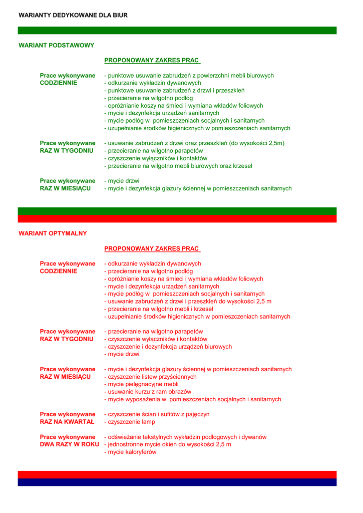 WARIANTY DEDYKOWANE DLA BIUR WARIANT PODSTAWOWY PROPONOWANY ZAKRES PRAC Prace wykonywane CODZIENNIE - punktowe usuwanie zabrudzeń z powierzchni mebli biurowych - odkurzanie wykładzin dywanowych - punktowe usuwanie zabrudzeń z drzwi i przeszkleń - przecieranie na wilgotno podłóg - opróżnianie koszy na śmieci i wymiana wkładów foliowych - mycie i dezynfekcja urządzeń sanitarnych - mycie podłóg w pomieszczeniach socjalnych i sanitarnych - uzupełnianie środków higienicznych w pomieszczeniach sanitarnych Prace wykonywane RAZ W TYGODNIU - usuwanie zabrudzeń z drzwi oraz przeszkleń (do wysokości 2,5m) - przecieranie na wilgotno parapetów - czyszczenie wyłączników i kontaktów - przecieranie na wilgotno mebli biurowych oraz krzeseł Prace wykonywane RAZ W MIESIĄCU - mycie drzwi - mycie i dezynfekcja glazury ściennej w pomieszczeniach sanitarnych WARIANT OPTYMALNY PROPONOWANY ZAKRES PRAC Prace wykonywane CODZIENNIE - odkurzanie wykładzin dywanowych - przecieranie na wilgotno podłóg - opróżnianie koszy na śmieci i wymiana wkładów foliowych - mycie i dezynfekcja urządzeń sanitarnych - mycie podłóg w pomieszczeniach socjalnych i sanitarnych - usuwanie zabrudzeń z drzwi i przeszkleń do wysokości 2,5 m - przecieranie na wilgotno mebli i krzeseł - uzupełnianie środków higienicznych w pomieszczeniach sanitarnych Prace wykonywane RAZ W TYGODNIU - przecieranie na wilgotno parapetów - czyszczenie wyłączników i kontaktów - czyszczenie i dezynfekcja urządzeń biurowych - mycie drzwi Prace wykonywane RAZ W MIESIĄCU - mycie i dezynfekcja glazury ściennej w pomieszczeniach sanitarnych - czyszczenie listew przyściennych - mycie pielęgnacyjne mebli - usuwanie kurzu z ram obrazów - mycie wyposażenia w pomieszczeniach socjalnych i sanitarnych Prace wykonywane RAZ NA KWARTAŁ - czyszczenie ścian i sufitów z pajęczyn - czyszczenie lamp Prace wykonywane - odświeżanie tekstylnych wykładzin podłogowych i dywanów DWA RAZY W ROKU - jednostronne mycie okien do wysokości 2,5 m - mycie kaloryferów WARIANT LUKSUSOWY PROPONOWANY ZAKRES PRAC Prace wykonywane CODZIENNIE - odkurzanie wykładzin dywanowych - przecieranie na wilgotno podłóg - opróżnianie koszy na śmieci i wymiana wkładów foliowych - mycie i dezynfekcja urządzeń sanitarnych - mycie podłóg w pomieszczeniach socjalnych i sanitarnych - usuwanie zabrudzeń z drzwi i przeszkleń do wysokości 2,5 m - przecieranie na wilgotno mebli, krzeseł i foteli - mycie luster - odkurzanie wycieraczek w strefie wejścia - neutralizacja zapachów w sanitariatach - punktowe usuwanie zabrudzeń z wykładzin tekstylnych i dywanów - uzupełnianie środków higienicznych w pomieszczeniach sanitarnych Prace wykonywane RAZ W TYGODNIU - czyszczenie wyłączników i kontaktów - czyszczenie i dezynfekcja urządzeń biurowych - mycie drzwi - mycie parapetów - mycie i dezynfekcja koszy na śmieci - mycie i dezynfekcja klamek - czyszczenie i polerowanie luster - czyszczenie glazury ściennej w pomieszczeniach sanitarnych - czyszczenie i polerowanie armatury - czyszczenie poręczy schodowych oraz powierzchni chromowanych Prace wykonywane RAZ W MIESIĄCU - mycie i dezynfekcja glazury ściennej w pomieszczeniach sanitarnych - czyszczenie listew przyściennych - mycie pielęgnacyjne mebli - usuwanie kurzu z ram obrazów - mycie wyposażenia w pomieszczeniach socjalnych i sanitarnych - polerowanie podłogi wraz z uzupełnieniem warstw powłoki polimerowej - usuwanie kurzu z elementów dekoracyjnych Prace wykonywane RAZ NA KWARTAŁ - czyszczenie ścian i sufitów z pajęczyn - czyszczenie lamp - odkurzanie żaluzji - mycie kaloryferów - czyszczenie kratek wentylacyjnych Prace wykonywane - odświeżanie tekstylnych wykładzin podłogowych i dywanów DWA RAZY W ROKU - mycie okien