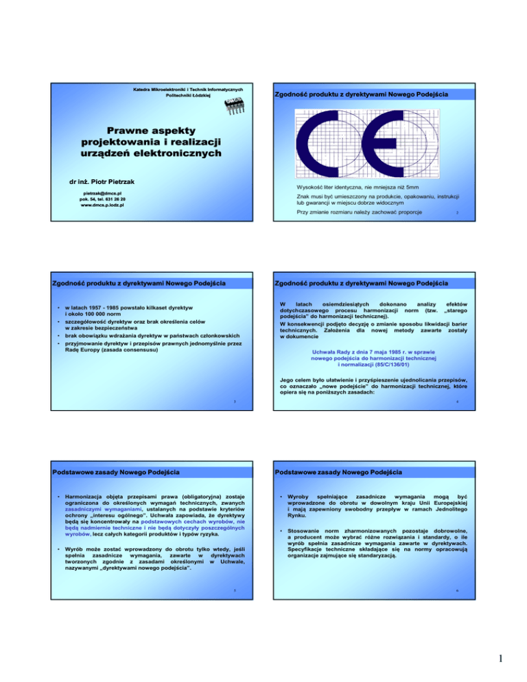 Katedra Mikroelektroniki i Technik Informatycznych Politechniki Łódzkiej Zgodność produktu z dyrektywami Nowego Podejścia Prawne aspekty projektowania i realizacji urządzeń elektronicznych dr inż. Piotr Pietrzak Wysokość liter identyczna, nie mniejsza niż 5mm [email protected] pok. 54, tel. 631 26 20 www.dmcs.p.lodz.pl Znak musi być umieszczony na produkcie, opakowaniu, instrukcji lub gwarancji w miejscu dobrze widocznym Przy zmianie rozmiaru należy zachować proporcje Zgodność produktu z dyrektywami Nowego Podejścia • • • • 2 Zgodność produktu z dyrektywami Nowego Podejścia W latach osiemdziesiątych dokonano analizy dotychczasowego procesu harmonizacji norm (tzw. podejścia” do harmonizacji technicznej). w latach 1957 - 1985 powstało kilkaset dyrektyw i około 100 000 norm szczegółowość dyrektyw oraz brak określenia celów w zakresie bezpieczeństwa brak obowiązku wdrażania dyrektyw w państwach członkowskich przyjmowanie dyrektyw i przepisów prawnych jednomyślnie przez Radę Europy (zasada consensusu) efektów „starego W konsekwencji podjęto decyzję o zmianie sposobu likwidacji barier technicznych. Założenia dla nowej metody zawarte zostały w dokumencie Uchwała Rady z dnia 7 maja 1985 r. w sprawie nowego podejścia do harmonizacji technicznej i normalizacji (85/C/136/01) Jego celem było ułatwienie i przyśpieszenie ujednolicania przepisów, co oznaczało „nowe podejście” do harmonizacji technicznej, które opiera się na poniższych zasadach: 3 Podstawowe zasady Nowego Podejścia • • 4 Podstawowe zasady Nowego Podejścia Harmonizacja objęta przepisami prawa (obligatoryjna) zostaje ograniczona do określonych wymagań technicznych, zwanych zasadniczymi wymaganiami, ustalanych na podstawie kryteriów ochrony „interesu ogólnego”. Uchwała zapowiada, że dyrektywy będą się koncentrowały na podstawowych cechach wyrobów, nie będą nadmiernie techniczne i nie będą dotyczyły poszczególnych wyrobów, lecz całych kategorii produktów i typów ryzyka. Wyrób może zostać wprowadzony do obrotu tylko wtedy, jeśli spełnia zasadnicze wymagania, zawarte w dyrektywach tworzonych zgodnie z zasadami określonymi w Uchwale, nazywanymi „dyrektywami nowego podejścia”. 5 • Wyroby spełniające zasadnicze wymagania mogą być wprowadzone do obrotu w dowolnym kraju Unii Europejskiej i mają zapewniony swobodny przepływ w ramach Jednolitego Rynku. • Stosowanie norm zharmonizowanych pozostaje dobrowolne, a producent może wybrać różne rozwiązania i standardy, o ile wyrób spełnia zasadnicze wymagania zawarte w dyrektywach. Specyfikacje techniczne składające się na normy opracowują organizacje zajmujące się standaryzacją. 6 1 Podstawowe zasady Nowego Podejścia • Globalne podejście do badań i certyfikacji Wyroby spełniające normy zharmonizowane korzystają z domniemania zgodności z zasadniczymi wymaganiami. Oznacza to, że dotychczas opracowane normy pozostały ważne w nowym systemie, ale poddano je weryfikacji. Jeżeli uzyskały status „normy zharmonizowanej”, to ich zastosowanie powoduje domniemanie zgodności z dyrektywą. W żadnym wypadku korzystanie z nich nie jest jednak obowiązkowe. Istotny element likwidacji barier w handlu na Jednolitym Rynku stanowiło opracowanie kryteriów wiarygodnej oceny zgodności wyrobów z wymaganiami zasadniczymi, czyli określenie trybu oceny zgodności. Zagadnienia te określa Uchwała Rady z dnia 21 grudnia 1989 r. w sprawie globalnego podejścia do badań i certyfikacji (90/C 10/01) 7 Globalne podejście do badań i certyfikacji 8 Globalne podejście do badań i certyfikacji • Wskazuje na konieczność wypracowania jednolitej i wiarygodnej oceny zgodności wyrobów, która pozwoli na stworzenie systemu uznawania badań (oceny wyrobu) przeprowadzonych w innym kraju Unii Europejskiej • Nakłada na normy zharmonizowane definiowanie sposobów wypełniania wymagań dyrektyw • Zgodnie z dyrektywą właściwe organy krajowe odpowiadają za ochronę bezpieczeństwa lub innych obszarów dyrektyw • Wskazuje na konieczność opracowania procedur kwestionowania zgodności produktu, wskazywania jego uchybień lub niedociągnięć norm zharmonizowanych • Ustalono wytyczne dla wyznaczania jednostek uczestniczących w ocenie i warunków ich działania. Dokument podkreśla konieczność wprowadzenia we wszystkich Państwach Członkowskich systemów weryfikacji kompetencji, zapewniających profesjonalizm jednostek uczestniczących w ocenie zgodności • Zaleca się wzajemne uznania w dziedzinie badań i certyfikacji nieuregulowanych ogólnie • Dąży się programowo do minimalizacji różnic między strukturami w różnych krajach członkowskich (jednostki notyfikujące, akredytowane, inspekcyjne, laboratoria testujące itp.) 9 Globalne podejście do badań i certyfikacji • 10 Konsekwencje Nowego i Globalnego Podejścia Wymagania podstawowe Propozycja modułów oceny zgodności – różne moduły dla różnych stanów rozwoju produktu – różne moduły dla różnych technik oceny zgodności • • zdefiniowane w dyrektywie i pełne jeden produkt – kilka dyrektyw • brak wymagań w dyrektywie – legislacja krajowa – zdefiniowanie kryteriów stosowania tychże modułów Swobodny transfer towarów – wyznaczenie i notyfikowanie (ogłoszenie) jednostek mogących uczestniczyć w tym procesie • produkt ze znakiem CE nie może być poddawany restrykcjom – stosowanie jednolitego systemu znakowania 11 12 2 Konsekwencje Nowego i Globalnego Podejścia Konsekwencje Nowego i Globalnego Podejścia Założenie zgodności Potwierdzenie zgodności • • • zgodnie z normami zharmonizowanymi zgodnie z dokumentacją przedstawioną przez producenta Klauzula ochronna • • jeśli produkt oznakowany CE nie spełnia wymagań to dane państwo informuje Komisję po pozytywnej weryfikacji postępowanie wykonuje się nakazowo w całej Unii przed wprowadzeniem do obrotu 