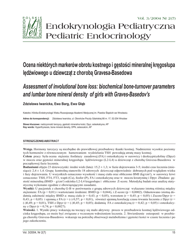 Vol. 3/2004 Nr 2(7) Endokrynologia Pediatryczna Pediatric Endocrinology Ocena niektórych markerów obrotu kostnego i gęstości mineralnej kręgosłupa lędźwiowego u dziewcząt z chorobą Gravesa-Basedowa Assessment of involutional bone loss: biochemical bone-turnover parameters and lumbar bone mineral density of girls with Graves-Basedov’s Zdzisława Iwanicka, Ewa Barg, Ewa Głąb Katedra i Klinika Endokrynologii Wieku Rozwojowego Akademii Medycznej im. Piastów Śląskich we Wrocławiu Adres do korespondencji: Zdzisława Iwanicka, ul. Obrońców Poczty Gdańskiej 66 m. 17, 52-204 Wrocław Słowa kluczowe: nadczynność tarczycy, gęstość mineralna kości, Dpyr, osteokalcyna, AP Key words: Hyperthyreosis, bone mineral density, DPN, osteocalcin, AP STRESZCZENIE/ STRESZCZENIE/ABSTRACT Wstęp. Hormony tarczycy są niezbędne do prawidłowej przebudowy tkanki kostnej. Nadmiernie wysokie poziomy tych hormonów z równoczesnym hamowaniem wydzielania TSH powodują utratę masy kostnej. Celem pracy była ocena stężenia: fosfatazy zasadowej (FA) i osteokalcyny w surowicy i deoksypirydoliny (Dpyr) w moczu oraz gęstości mineralnej kręgosłupa lędźwiowego (L2-L4) u dziewcząt z chorobą Gravesa-Basedowa w początkowej fazie leczenia. Badaniami objęto 23 dziewczynki: średni wiek (lata): 15,2 ± 1,3; w fazie dojrzewania 3-5; średni czas leczenia (miesiące): 2,4 ± 1,4. Grupę kontrolną stanowiło 18 zdrowych dziewcząt odpowiednio dobranych pod względem wieku i fazy dojrzewania. U wszystkich oznaczono wysokość i masę ciała oraz obliczono BMI (kg/cm2), w surowicy krwi oznaczono: TSH, FT4, FT3, wapń (Ca), fosfor (P), FA i osteokalcynę oraz w moczu kreatyninę i Dpyr. Zbadano gęstość mineralną (BMD – g/cm2) odcinka L2-L4 kręgosłupa i obliczono Z-score. Metodykę badań oraz analizę statystyczną wykonano zgodnie z obowiązującymi zasadami. Wyniki: U pacjentek z chorobą G-B w porównaniu z grupą zdrowych dziewcząt wykazano istotną różnicę między stężeniem: FA (p = 0,01) i wartościami średnimi: BMD (p = 0,044), i Z-score (p = 0,0002). Odnotowano istotną dodatnią zależność między BMD a: masą ciała (r = 0,43; p < 0,05), wzrostem (r = 0,45; p < 0,05) i Zscore/Dpyr (r = 0,43; p < 0,05) i ujemną z FA (r = (-) 0,57; p < 0,01), również ujemną korelację czasu trwania leczenia z Dpyr (r = (-)0,49; p = 0,01), TSH z Dpyr (r = (-)0,45; p < 0,05); dodatnią FA z osteokalcyną (r = 0,42; p < 0,05) i osteokalcyny z Dpyr (r = 0,74; p < 0,0027). Wnioski. 1. Wyniki pracy wskazują na toczący się mało aktywny proces w przebudowie kostnej lędźwiowego odcinka kręgosłupa, co może być związane z wczesnym wdrożeniem leczenia. 2. Stwierdzenie osteopenii w przebiegu choroby Gravesa-Basedowa wskazuje na potrzebę obserwacji metabolizmu i gęstości kości w czasie leczenia i po jego zakończeniu. Vol. 3/2004, Nr 2(7) 15 Praca oryginalna Endokrynol. Ped., 3/2004;2(7):15-20 Introduction. Thyroid hormones are essential for normal bone turnover. Excessively high levels of thyroid hormones and TSH suppression cause bone loss. The aim of the study was the evaluation of serum alkaline phosphatase (AP) and osteocalcin and urine deoxypyridinoline (DPD) and lumbar spine bone mineral density (BMD) in girls with Graves-Basedov disease in the initial phase of the therapy. Patients and methods. We studied 23 girls: mean age (years): 15.2 ± 1.3; puberty stadium 3-5; therapy duration (months) 2.4 ± 1.4. The control group were 18 healthy girls matched for age and puberty stadium. Body height and weight, BMI (kg/cm2), serum: TSH, FT-3, FT-4, AP, osteocalcin and 24-hours’ urine creatinine and DPN were estimated in each examined girl. BMB of lumbar spine L2–L4, Z-score were measured in each case. Results: Patients with Graves-Basedov disease differed significantly in AP (p = 0.01) concentration and BMD (p = 0.044) and Z-score (p = 0.0002) compared to healthy individuals. There was also significant correlation between BMD and body weight (r = 0.43; p < 0.05), height (r = 0.45; p < 0.05) and Zscor/DPN (r = 0.43; p < 0.05) negative with AP (r = (-)0.57; p < 0.01); negative correlation of therapy duration and DPN (r = (-)0.49; p < 0.05) and TSH with DPN (r = (-)0.45; p < 0.05) positive correlation between AP and osteocalcin (r = 0.42; p < 0.05), osteocalcin and DPN (r = 0.74; p < 0.0027. Conclusions: 1. The results of our study indicate that the suppression of bone turnover process can be a consequence of early treatment of the disease. 2 .Incidence of osteopenia in our patients with Graves- Basedov disease indicates the necessity of observation of bone metabolism and mineral density during therapy and onwards. Wstęp Hormony tarczycy są niezbędne do prawidłowego wzrastania, dojrzewania i metabolizmu kości [1, 2]. Mechanizm oddziaływania hormonów tarczycy na proces mineralizacji szkieletu nie został dokładnie określony. Przypuszcza się, że w odpowiedzi osteoklastów na FT3 pośredniczą rozpuszczalne cytokiny wydzielane przez osteoblasty [3, 4]. W nadczynności tarczycy zwiększa się obrót kostny: procesy kościotworzenia i resorbcji kości ulegają uaktywnieniu, przeważa aktywność procesu resorbcji. Zmiany metabolizmu powodują zmniejszenie masy kostnej [4]. Nieleczona nadczynność tarczycy może być przyczyną osteoporozy [1]. Mora i wsp. [5] wykazali, że normalizacja stężenia hormonów tarczycy pod wpływem leczenia nadczynności tarczycy u dzieci wpływa na szybkie zahamowanie resorbcji kości, podczas gdy nasilony proces formacji utrzymuje się dłużej. Przewaga kościotworzenia w tym okresie może korzystnie wpływać na gęstość mineralną kości. Grant i wsp. [6] zaobserwowali jednak, że przebycie nadczynności tarczycy stwarza ryzyko osteoporozy w późniejszym okresie życia. Pacjenci i metody Badano 23 dziewczynki z chorobą Gravesa-Basedowa w fazie dojrzewania 3-5 wg Tannera, w wieku (średnia ±) 15,2 ± 1,4 lat, czas leczenia 2,4 ± 1,4 mie