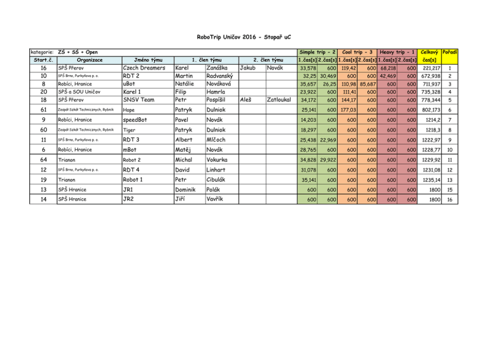 RoboTrip Uničov 2016 - Stopař uC kategorie: ZŠ + SŠ + Open Start.č. Simple trip - 2 Organizace Jméno týmu 1. člen týmu SPŠ Přerov Czech Dreamers RDT 2 uBot Karel 1 SNSV Team Karel Martin Natálie Filip Petr Zanáška Radvanský Nováková Hamrla Pospíšil Zespół Szkół Technicznych, Rybnik Hope Patryk Robíci, Hranice speedBot 60 Zespół Szkół Technicznych, Rybnik 11 6 16 10 8 20 18 SPŠ Přerov SPŠ Brno, Purkyňova p. o. Robíci, Hranice 2. člen týmu Jakub Novák Cool trip - 3 Heavy trip - 1 1.čas[s] 2.čas[s] 1.čas[s] 2.čas[s] 1.čas[s] 2.čas[s] 33,578 Celkový Pořadí čas[s] 600 119,42 600 68,218 600 221,217 1 32,25 30,469 600 600 42,469 600 672,938 2 600 600 711,937 3 35,657 26,25 23,922 600 111,41 600 600 600 735,328 4 34,172 600 144,17 600 600 600 778,344 5 Dulniok 25,141 600 177,03 600 600 600 802,173 6 Pavel Novák 14,203 600 600 600 600 600 1214,2 7 Tiger Patryk Dulniok 18,297 600 600 600 600 600 1218,3 8 SPŠ Brno, Purkyňova p. o. RDT 3 Albert Mlčoch 25,438 22,969 600 600 600 600 1222,97 9 Robíci, Hranice mBot Matěj Novák 28,765 600 600 600 600 600 1228,77 10 64 Trianon Robot 2 Michal Vokurka 34,828 29,922 600 600 600 600 1229,92 11 12 SPŠ Brno, Purkyňova p. o. RDT 4 David Linhart 31,078 600 600 600 600 600 1231,08 12 19 Trianon Robot 1 Petr Cibulák 35,141 600 600 600 600 600 1235,14 13 13 SPŠ Hranice JR1 Dominik Polák 600 600 600 600 600 600 1800 15 14 SPŠ Hranice JR2 Jiří Vavřík 600 600 600 600 600 600 1800 16 61 9 SPŠ a SOU Uničov Aleš Zatloukal 110,98 85,687 RoboTrip Uničov 2016 - Stopař Lego kategorie: ZŠ Start.č. 25 23 29 24 27 30 28 21 26 Simple trip - 2 Organizace ZŠ Pionýrů, Uničov Trianon ZŠ U Stadionu, Uničov ZŠ Pionýrů, Uničov ZŠ Přerov, Trávník ZŠ U Stadionu, Uničov ZŠ U Stadionu, Uničov Gymnázium Jeseník ZŠ Přerov, Trávník Jméno týmu Baddy Robot Stadioňáci 2 Květák Sm Lom Os Stadioňáci 3 Stadioňáci 1 Gorila Aladar 1. člen týmu Marcelka Efrem David Matyáš Filip Ivan Jan Anna Jan Matečková Mizia Kováč Koblas Tomšů Marek Zedník Bicanová Šmehlík 2. člen týmu Michaela Dlouhá Lukáš Lukáš Jakub Zdeněk Antonín Hanuš David Konrád Crha Slaný Snášel Mikšík Kameník Atanasov kategorie: SŠ Start.č. 32 31 33 39 36 40 41 Jméno týmu 1. člen týmu 2. člen týmu Karel 0 GYZA TEAM RDT 1 Czech Dreamers BuVo Rebelka SNSV Team Daniel Vojtěch Martin Karel Vojtěch Klára Petr Staník Strašil Radvanský Zanáška Bureš Fučíková Pospíšil Miroslav Máčala Jan Jedelský Aleš Zatloukal Vector Robert Kristof Jan Cyran SPŠ Brno, Purkyňova p. o. RDT 5 Vojtěch 37 SPŠ Jedovnice JaKr 44 Zespół Szkół Technicznych, Rybnik 38 42 46 34 43 45 SPŠ a SOU Uničov Gymnázium Zábřeh SPŠ Brno, Purkyňova p. o. SPŠ Přerov SPŠ Jedovnice SPŠ Přerov SPŠ Přerov Zespół Szkół Technicznych, Jakub Novák Heavy trip - 1 1.čas[s] 2.čas[s] 1.čas[s] 2.čas[s] 1.čas[s] 2.čas[s] Celkový Pořadí čas[s] 100,67 92,719 452,64 376,44 600 600 1069,16 1 99,797 600 600 600 600 600 1299,8 2 186,09 600 542,33 600 600 600 1328,42 3 188,56 600 600 600 600 600 1388,56 4 599 189,91 600 600 600 600 1389,91 5 316,56 600 599 553,7 600 600 1470,27 6 390,16 600 599 600 600 600 1589,16 7 600 600 600 600 600 600 1800 8 600 600 600 600 600 600 1800 9 Simple trip - 2 Organizace Cool trip - 3 Cool trip - 3 Heavy trip - 1 1.čas[s] 2.čas[s] 1.čas[s] 2.čas[s] 1.čas[s] 2.čas[s] 66,14 Celkový Pořadí čas[s] 600 210,02 600 65,062 600 341,218 1 96,657 185,03 302,67 600 68,172 600 467,501 2 68,766 600 330,27 600 105,58 600 504,61 3 118,78 600 269,58 600 600 600 988,359 4 82,266 73,031 341,13 600 600 600 1014,16 5 220,63 144,53 290,2 600 600 600 1034,74 6 599 202,41 365,33 600 600 600 1167,73 7 146,47 600 466,56 600 600 600 1213,03 8 Kalivoda 91,797 600 600 600 600 600 1291,8 9 Jan Kratochvíl 103,49 600 600 600 600 600 1303,49 10 Hoonigan Jan Cyran 195,09 116,23 600 600 600 600 1316,23 11 SPŠ Jedovnice MiKr Michal Kraus 600 600 600 600 600 600 1800 12 Zespół Szkół Technicznych, Bakłażan Robert Kristof Jan Cyran 600 600 600 600 600 600 1800 13 Hoonicorn Jan Cyran Robert Kristof 600 600 600 600 600 600 1800 14 Rukiew Robert Kristof Jan Cyran 600 600 600 600 600 600 1800 15 Rybnik Rybnik Zespół Szkół Technicznych, Rybnik Zespół Szkół Technicznych, Rybnik Adrian Drynda RoboTrip Uničov 2016 - Konstruktér kategorie:SŠ Čas Start.č. Organizace Jméno týmu 3 1 2 4 5 SPŠ a SOU Uničov Karel 02 R.U.R. GYZA TEAM KraVin Ogaři Gymnázium Jeseník Gymnázium Zábřeh SPŠ Jedovnice SŠIEŘ Rožnov 1. člen týmu Daniel Jan Vojtěch Marek Martin Staník Maceček Strašil Vintr Procházka 2. člen týmu Filip Jiří Jan Jan Šimon Hamrla Pučok Jedelský Kratochvíl Nesvadba Trestné sekundy Suma Celkový Pořadí 1.čas[s] 2.čas[s] 1.čas[s] 2.čas[s] 1.čas[s] 2.čas[s] čas[s] 194 205 0 0 194 205 194 1 138 140 300 600 438 740 438 2 600 600 600 600 1200 1200 1200 3-5 600 600 600 600 1200 1200 1200 3-5 600 600 600 600 1200 1200 1200 3-5 RoboTrip Uničov 2016 - Sumo kategorie:ZŠ + SŠ + Open Počet Start.č. Organizace 63 Gymnázium Zábřeh GYZA TEAM Adam Hošek Vojtěch Strašil 21 1 49 Zespół Szkół Technicznych, Rybnik WJ7 Marcin Wójcik Jakub Czyżyk 20 2 55 SPŠ Jedovnice ViMa Marek Vintr 19 3 47 Gymnázium Jeseník R.U.R. Anna Bicanová 16 4-5 52 SPŠ Jedovnice BuVo Vojtěch Bureš 16 4-5 53 SPŠ Jedovnice JaKr Jan Kratochvíl 14 6-7 62 Zespół Szkół Technicznych, Rybnik Missingno Maciek Pal 14 6-7 54 SPŠ Jedovnice MiKr Michal Kraus 10 8 51 SPŠ a SOU Uničov Karel 01 Daniel Staník Miroslav Máčala 9 9 58 Zespół Szkół Szalony Jakub Treszczyński Robert Kristof 8 10 48 Zespół Szkół Technicznych, Rybnik Kubix v4.0 Jakub Czyżyk Marcin Wójcik 4 11-12 56 SPŠ Přerov Rebel Jakub Kavka Petr Lollek 4 11-12 50 Gymnázium Zábřeh GYZA TEAM Vojtěch Strašil Jan Jedelský 2 13 57 Zespół Szkół Newton Robert Kristof Jan Cyran 0 14-15 59 Zespół Szkół Tygiel W