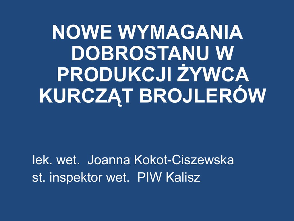 NOWE WYMAGANIA DOBROSTANU W PRODUKCJI ŻYWCA KURCZĄT BROJLERÓW lek. wet. Joanna Kokot-Ciszewska st. inspektor wet. PIW Kalisz JAK UTRZYMAĆ DOTYCHCZASOWĄ WYDAJNOŚĆ FERMY ? Wskazówki dla producentów żywca kurcząt brojler 30 czerwca 2010 r. wejdą w życie nowe przepisy wdrożone do krajowego prawa na podstawie Dyrektywy Rady Nr 2007/43/WE w sprawie ustanowienia minimalnych zasad dotyczących ochrony kurcząt utrzymywanych z przeznaczeniem na produkcję mięsa. Przepisy te wprowadzą ograniczenia w zagęszczeniu obsady kurcząt w kg na 1m2. Wielkość produkcji żywca regulować będą normy obsady : • - maks. 33 kg/m2, • - maks. 39 kg/m2; • - maks. 42 kg/m2. Przestaną obowiązywać obecne krajowe normy maksymalnej obsady kurcząt : - do 3 tygodnia – 35 sztuk - powyżej 3. do 5 tygodnia życia – 22 sztuki - powyżej 5 tygodnia – 17 sztuk Od 30 czerwca 2010 r. obowiązywać będzie rozporządzenie Ministra Rolnictwa i Rozwoju Wsi z dnia 15 lutego 2010 r. w sprawie wymagań i sposobu postępowania przy utrzymaniu gatunków zwierząt gospodarskich, dla których normy ochrony zostały określone w przepisach Unii Europejskiej ( Dz. U. Nr 56, poz. 344). Uchylone zostanie Rozporządzenie Ministra Rolnictwa i Rozwoju Wsi z dnia 2 września 2003 r. w sprawie minimalnych warunków utrzymywania poszczególnych gatunków zwierząt gospodarskich. Akty prawne regulujące nowe wymagania dla producentów: Ustawa z dnia 21 sierpnia 1997 r. o ochronie zwierząt ( tekst jednolity z 21 maja 2003 r. Dz.U. Nr 106, poz. 1002 wraz z późniejszymi zmianami ) : Ustawa z dnia 21 sierpnia 1997 r. o ochronie zwierząt ( tekst jednolity z 21 maja 2003 r. Dz.U. Nr 106, poz. 1002 wraz z późniejszymi zmianami ) : • Art. 12a ustawy - kwalifikacje producentów i obsługi, • Art.12b - wymagania dotyczące szkoleń ( uprawnienia firm, zakres programów szkoleń ), • Art.12c - instrukcje dla pracowników, • Art.12d - warunki zwiększenia obsady powyżej 33 kg/m2 – powiadamianie powiatowego lekarza weterynarii, • Art.12f - dokumentacja fermy/kurników i informacje dla ubojni, • Art.12g - wymagania dla ubojni/oceny poubojowe i programy naprawcze dla ferm. Przepisy wykonawcze do ustawy • Rozporządzenie Ministra Rolnictwa i Rozwoju Wsi z dnia 17 grudnia 2009 r. w sprawie sposobu ustalania poziomu obsady kurcząt brojlerów w kurniku, w którym są utrzymywane ( Dz.U. Nr 223 poz. 1784) • Przepisy wykonawcze do ustawy • Rozporządzenie Ministra Rolnictwa i Rozwoju Wsi z dnia 24 listopada 2009 r. w sprawie warunków kadrowych, organizacyjnych i technicznych, jakie powinien spełniać podmiot upoważniony do prowadzenia szkolenia w zakresie przepisów dotyczących ochrony kurcząt brojlerów, oraz wzoru zaświadczenia o ukończeniu szkolenia ( Dz. U. nr 210 poz. 1620 ). • Przepisy wykonawcze do ustawy • Rozporządzenia Ministra Rolnictwa i Rozwoju Wsi z dnia 15 lutego 2010 r. w sprawie wymagań i sposobu postępowania przy utrzymywaniu gatunków zwierząt gospodarskich, dla których normy ochrony zostały określone w przepisach Unii Europejskiej. (Dz. U. Nr 56, poz. 344) • WYMAGANIA PODSTAWOWE/MINIMALNE DLA PRODUCENTÓW KURCZĄT BROJLERÓW Kwalifikacje uprawniające do prowadzenia produkcji/ sprawowania opieki ( art. 12a ustawy o ochronie zwierząt ) : • • • • • Odbycie szkolenia, zgodnie z nowymi wymaganiami. Zakres szkolenia : - postępowanie przy utrzymywaniu kurcząt, - fizjologia, karmienie i pojenie, behawioryzm, pojęcie stresu, - obchodzenie się z kurczętami podczas wyłapywania, załadunku i transportu, • - procedury uśmiercania lub uboju w nagłych przypadkach, • - profilaktyczne środki bezpieczeństwa biologicznego. • • Szkolenia prowadzić będą podmioty posiadające upoważnienia wydane przez Wojewódzkich Lekarzy Weterynarii. Szkoleniom nie podlegają osoby, które : • - sprawowały opiekę nad kurczętami nieprzerwanie w okresie od 30 czerwca 2009 r. do dnia 30 czerwca 2010 r. • - posiadają udokumentowane ukończenie szkolenia w zakresie warunków utrzymywania zwierząt gospodarskich, przeprowadzonego w okresie od 1 maja 2004 r. do dnia 30 czerwca 2010 r., oraz • - absolwenci zawodowych szkół – zawody związane z chowem i hodowlą zwierząt, wymienione w klasyfikacji zawodów szkolnictwa zawodowego, • - absolwenci szkół wyższych na kierunku weterynaria, zootechnika lub rolnictwo. Instrukcje dla pracowników (art. 12c ustawy o ochronie zwierząt): • Właściciele ferm mają obowiązek przekazania pracownikom odpowiednich instrukcji dotyczących metod utrzymywania/obsługi kurcząt, wyłapywania, załadunku i uśmiercania. Obowiązek dokumentacji w każdym kurniku – podstawowe informacje ( art.12f ustawy o ochronie zwierząt ): • - liczba wstawionych kurcząt, • - powierzchnia użytkowa, • - liczba padłych kurcząt odnotowana wraz z przyczynami śmierci • (podczas każdej kontroli - dwa razy dziennie ), • - liczba kurcząt uśmierconych i przyczyny uśmiercenia, • - liczba kurcząt pozostałych w stadzie, • - nazwa mieszańca kurcząt brojlerów, jeżeli jest znana. PODSTAWOWE WYMAGANIA ŚRODOWISKOWE – Warunki maksymalnego zagęszczenia obsady do 33 kg/m2 (Rozdział 1 i 5 rozporządzenia MRiRW z dnia 15 lutego 2010 r. w sprawie wymagań i sposobu postępowania przy utrzymywaniu gatunków zwierząt gospodarskich, dla których normy ochrony zostały określone w przepisach UE): • • • • • • • • • • • karmienie i pojenie - dostęp do paszy i wody, - zapewniona ściółka, - sprawna wentylacja i ogrzewanie, - minimalizacja hałasu, - oświetlenie ( intensywność co najmniej 20 luksów, mierzone na poziomie oka ptaka, zasięg – przynajmniej na 80 % powierzchni użytkowej ), - kontrola dobrostanu dwa razy dziennie, - leczenie lub eliminacja kurcząt z objawami zaburzeń zdrowotnych, - czyszczenie kurnika, - dopuszczalne zabiegi chirurgiczne (tylko terapeutyczne lub diagnostyczne). ZAGĘSZCZEN