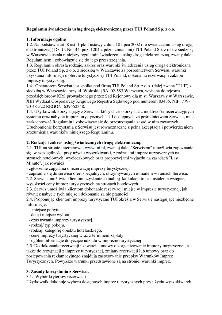 Regulamin świadczenia usług drogą elektroniczną przez TUI Poland Sp. z o.o. 1. Informacje ogólne 1.2. Na podstawie art. 8 ust. 1 pkt 1ustawy z dnia 18 lipca 2002 r. o świadczeniu usług drogą elektroniczną ( Dz. U. Nr 144, poz. 1204 z późn. zmianami) TUI Poland Sp. z o.o. z siedzibą w Warszawie ustala niniejszy regulamin świadczenia usług drogą elektroniczną, zwany dalej Regulaminem i zobowiązuje się do jego przestrzegania. 1.3. Regulamin określa rodzaje, zakres oraz warunki świadczenia usług drogą elektroniczną przez TUI Poland Sp. z o.o. z siedzibą w Warszawie za pośrednictwem Serwisu, warunki uzyskania informacji o ofercie turystycznej TUI Poland, dokonania rezerwacji i zakupu imprezy turystycznej. 1.4. Operatorem Serwisu jest spółka pod firmą TUI Poland Sp. z o.o. (dalej zwana "TUI") z siedzibą w Warszawie, przy ul. Wołoskiej 9A, 02-583 Warszawa, wpisana do rejestru przedsiębiorców KRS prowadzonego przez Sąd Rejonowy dla m.st. Warszawy w Warszawie, XIII Wydział Gospodarczy Krajowego Rejestru Sądowego pod numerem 83435, NIP: 77920-48-522 REGON: 639552348. 1.4. Użytkownik korzystający z Serwisu, który chce skorzystać z możliwości rezerwacyjnych systemu oraz nabycia imprez turystycznych TUI dostępnych za pośrednictwem Serwisu, musi zaakceptować Regulamin i zobowiązać się do przestrzegania zasad w nim zawartych. Uruchomienie korzystania z Serwisu jest równoznaczne z pełną akceptacją i potwierdzeniem zrozumienia warunków niniejszego Regulaminu. 2. Rodzaje i zakres usług świadczonych drogą elektroniczną. 2.1. TUI na stronie internetowej www.tui.pl, zwanej dalej "Serwisem" umożliwia zapoznanie się, w szczególności przy użyciu wyszukiwarki, z rodzajami imprez turystycznych na stronach hotelowych, wycieczkowych oraz propozycjami wyjazdu na zasadach "Last Minute", jak również: - zgłoszenie zapytania o rezerwację imprezy turystycznej, - zapisanie się do serwisu ofert specjalnych, otrzymywanych e-mailem w ramach Serwisu. 2.2. Serwis umożliwia klientom uzyskanie aktualnej kalkulacji to jest ustalenie wstępnej wysokości ceny imprez turystycznych na stronach hotelowych. 2.3. Serwis umożliwia klientom dokonanie rezerwacji miejsc w imprezie turystycznej, jak również nabycie tych miejsc i dokonanie za nie płatności. 2.4. Proponując klientom imprezy turystyczne TUI określa w Serwisie następujące niezbędne informacje: - miejsce pobytu, - datę i miejsce wylotu, - czas trwania imprezy turystycznej, - rodzaj/ typ pokoju, - rodzaj, kategorię obiektu hotelarskiego, - cenę imprezy turystycznej wraz z terminem zapłaty - ogólne informacje dotyczące udziału w imprezie turystycznej 2.5. Do dokonania rezerwacji i zawarcia umowy o zorganizowanie imprezy turystycznej, a także do rezygnacji z imprezy turystycznej, zmiany rezerwacji lub umowy oraz do postępowania reklamacyjnego znajdują zastosowanie przepisy Warunków Imprez Turystycznych. Powyższe warunki przedstawione są na stronie: warunki imprez. 3. Zasady korzystania z Serwisu. 3.1. Wybór kryteriów rezerwacji Użytkownik dokonuje wyboru dostępnych imprez turystycznych przy użyciu wyszukiwarek na stronie głównej: tui.pl, bądź korzystając z zakładek: - Samolotem – wakacje lotnicze z polskich katalogów TUI - Sam przelot - Dojazd własny –wakacje z dojazdem własnym z polskiego katalogu TUI - Last Minute Użytkownik określa: wybór termin wyjazdu, kierunek, miejsce rozpoczęcia się podróży, ilość podróżujących osób i inne parametry. 3.2. Wynik wyszukiwania, prezentacja ofert Serwis prezentuje wszystkie imprezy turystyczne zgodnie z określonymi oczekiwaniami Użytkownika, jak i szczegółowy opis świadczeń i ceny. 3.3. Rezerwacja on-line imprezy turystycznej Użytkownik dokonuje rezerwacji imprezy turystycznej podając przy tym dane osobowe, takie jak: imię i nazwisko osoby zgłaszającej, dane kontaktowe: adres, kontakt telefoniczny i adres mailowy oraz dane pozostałych uczestników, dla których dokonuje rezerwacji miejsc w imprezie. Użytkownik zapoznaje się i akceptuje Regulamin serwisu, Warunki Imprez Turystycznych i Ubezpieczeń On-line, jak również wyraża zgodę na przetwarzanie danych osobowych na potrzeby realizacji rezerwacji. 3.4. Dostępne formy płatności Serwis oferuje możliwość dokonania płatności za imprezę w następujący sposób: - przelew elektroniczny - płatność kartą kredytową realizowana w systemie e-Card - płatność karta kredytową przez telefon - przelew tradycyjny 3.5. Terminy płatności za imprezę turystyczną: Wakacje samolotem: - wpłata całości kwoty w momencie rezerwacji imprezy - w przypadku rezerwacji imprez na 35 dni i mniej przed terminem rozpoczęcia się danej imprezy oraz imprez typu Last Minute (dot. imprez turystycznych samolotem) - wpłata zaliczki 20% w momencie rezerwacji imprezy - w przypadku rezerwacji imprez na 36 dni i więcej przed terminem rozpoczęcia się danej imprezy oraz dokonanie wpłaty pozostałej należności w wysokości 80% w nieprzekraczalnym terminie 35 dni przed wyjazdem (dot. imprez turystycznych samolotem); Dojazd własny: - wpłata całości kwoty w momencie rezerwacji imprezy – w przypadku imprez rezerwowanych na na 50 dni i mniej przed rozpoczęciem się imprezy (dot. imprez turystycznych z dojazdem własnym), - wpłata zaliczki 20% w momencie rezerwacji imprez na 51 dni i więcej przed terminem rozpoczęcia się danej imprezy oraz dokonanie wpłaty pozostałej należności w wysokości 80% w nieprzekraczalnym terminie 50 dni przed wyjazdem (dot. imprez turystycznych z dojazdem własnym). 3.6. Potwierdzenie dokonania rezerwacji i zawarcie umowy Dokonanie rezerwacji i zawarcie umowy z Użytkownikiem Serwisu następuje w trybie: - rezerwacji on-line, - zgłoszenia wstępnej rezerwacji, tzw. zapytania o dostępność miejsc, - poprzez Call Center TUI Poland pod numerem telefonu 801 884 801 Umowa zawierana jest w formie pisemnej i wymaga potwierdzenia dwóch stron