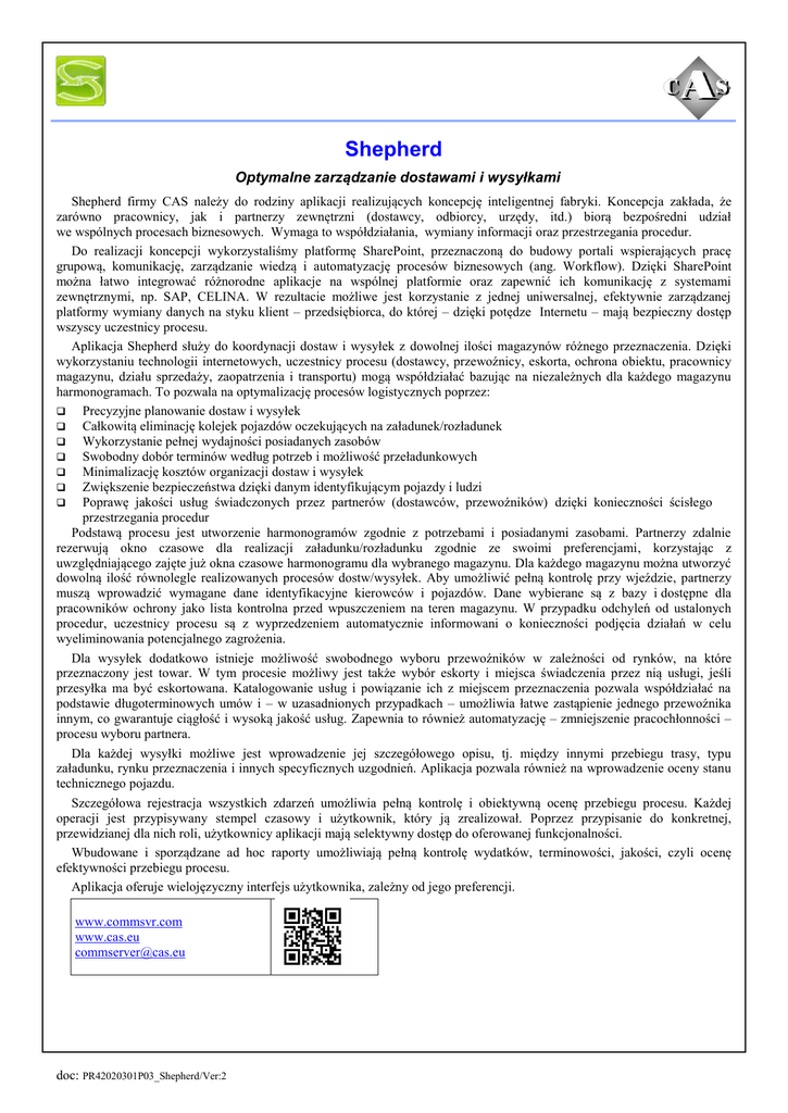 Shepherd Optymalne zarządzanie dostawami i wysyłkami Shepherd firmy CAS należy do rodziny aplikacji realizujących koncepcję inteligentnej fabryki. Koncepcja zakłada, że zarówno pracownicy, jak i partnerzy zewnętrzni (dostawcy, odbiorcy, urzędy, itd.) biorą bezpośredni udział we wspólnych procesach biznesowych. Wymaga to współdziałania, wymiany informacji oraz przestrzegania procedur. Do realizacji koncepcji wykorzystaliśmy platformę SharePoint, przeznaczoną do budowy portali wspierających pracę grupową, komunikację, zarządzanie wiedzą i automatyzację procesów biznesowych (ang. Workflow). Dzięki SharePoint można łatwo integrować różnorodne aplikacje na wspólnej platformie oraz zapewnić ich komunikację z systemami zewnętrznymi, np. SAP, CELINA. W rezultacie możliwe jest korzystanie z jednej uniwersalnej, efektywnie zarządzanej platformy wymiany danych na styku klient – przedsiębiorca, do której – dzięki potędze Internetu – mają bezpieczny dostęp wszyscy uczestnicy procesu. Aplikacja Shepherd służy do koordynacji dostaw i wysyłek z dowolnej ilości magazynów różnego przeznaczenia. Dzięki wykorzystaniu technologii internetowych, uczestnicy procesu (dostawcy, przewoźnicy, eskorta, ochrona obiektu, pracownicy magazynu, działu sprzedaży, zaopatrzenia i transportu) mogą współdziałać bazując na niezależnych dla każdego magazynu harmonogramach. To pozwala na optymalizację procesów logistycznych poprzez: Precyzyjne planowanie dostaw i wysyłek Całkowitą eliminację kolejek pojazdów oczekujących na załadunek/rozładunek Wykorzystanie pełnej wydajności posiadanych zasobów Swobodny dobór terminów według potrzeb i możliwość przeładunkowych Minimalizację kosztów organizacji dostaw i wysyłek Zwiększenie bezpieczeństwa dzięki danym identyfikującym pojazdy i ludzi Poprawę jakości usług świadczonych przez partnerów (dostawców, przewoźników) dzięki konieczności ścisłego przestrzegania procedur Podstawą procesu jest utworzenie harmonogramów zgodnie z potrzebami i posiadanymi zasobami. Partnerzy zdalnie rezerwują okno czasowe dla realizacji załadunku/rozładunku zgodnie ze swoimi preferencjami, korzystając z uwzględniającego zajęte już okna czasowe harmonogramu dla wybranego magazynu. Dla każdego magazynu można utworzyć dowolną ilość równolegle realizowanych procesów dostw/wysyłek. Aby umożliwić pełną kontrolę przy wjeździe, partnerzy muszą wprowadzić wymagane dane identyfikacyjne kierowców i pojazdów. Dane wybierane są z bazy i dostępne dla pracowników ochrony jako lista kontrolna przed wpuszczeniem na teren magazynu. W przypadku odchyleń od ustalonych procedur, uczestnicy procesu są z wyprzedzeniem automatycznie informowani o konieczności podjęcia działań w celu wyeliminowania potencjalnego zagrożenia. Dla wysyłek dodatkowo istnieje możliwość swobodnego wyboru przewoźników w zależności od rynków, na które przeznaczony jest towar. W tym procesie możliwy jest także wybór eskorty i miejsca świadczenia przez nią usługi, jeśli przesyłka ma być eskortowana. Katalogowanie usług i powiązanie ich z miejscem przeznaczenia pozwala współdziałać na podstawie długoterminowych umów i – w uzasadnionych przypadkach – umożliwia łatwe zastąpienie jednego przewoźnika innym, co gwarantuje ciągłość i wysoką jakość usług. Zapewnia to również automatyzację – zmniejszenie pracochłonności – procesu wyboru partnera. Dla każdej wysyłki możliwe jest wprowadzenie jej szczegółowego opisu, tj. między innymi przebiegu trasy, typu załadunku, rynku przeznaczenia i innych specyficznych uzgodnień. Aplikacja pozwala również na wprowadzenie oceny stanu technicznego pojazdu. Szczegółowa rejestracja wszystkich zdarzeń umożliwia pełną kontrolę i obiektywną ocenę przebiegu procesu. Każdej operacji jest przypisywany stempel czasowy i użytkownik, który ją zrealizował. Poprzez przypisanie do konkretnej, przewidzianej dla nich roli, użytkownicy aplikacji mają selektywny dostęp do oferowanej funkcjonalności. Wbudowane i sporządzane ad hoc raporty umożliwiają pełną kontrolę wydatków, terminowości, jakości, czyli ocenę efektywności przebiegu procesu. Aplikacja oferuje wielojęzyczny interfejs użytkownika, zależny od jego preferencji. www.commsvr.com www.cas.eu [email protected] doc: PR42020301P03_Shepherd/Ver:2
