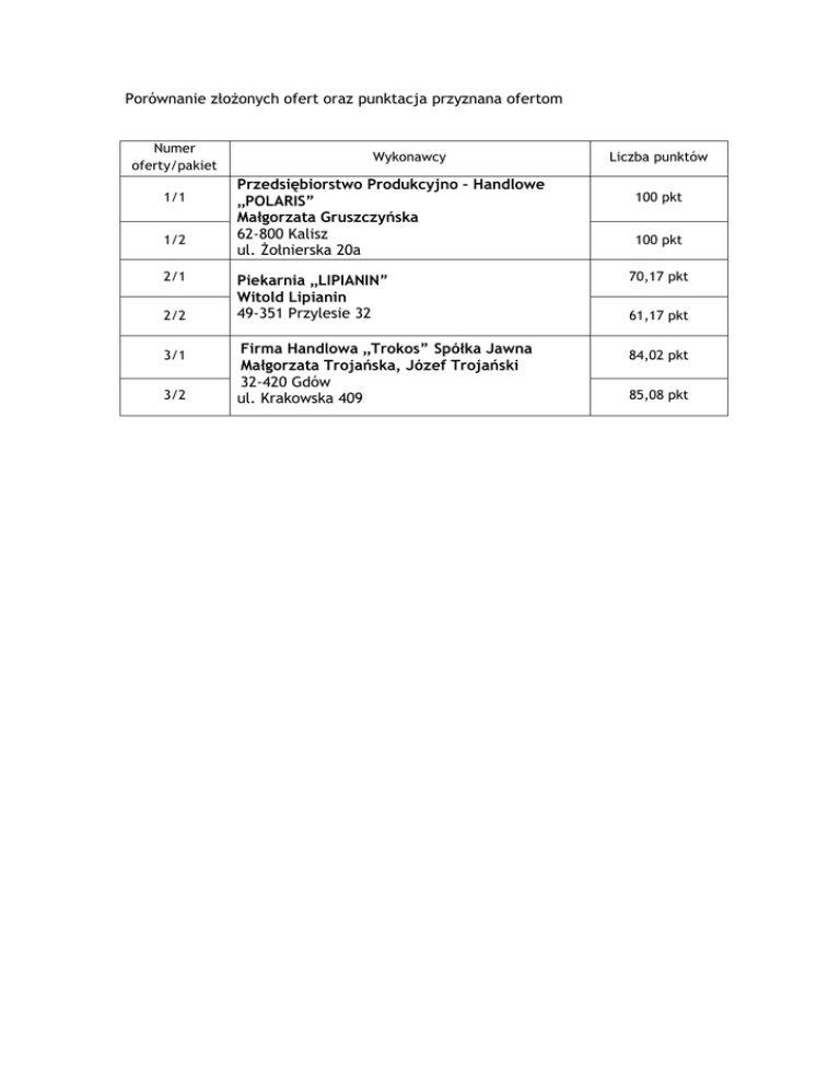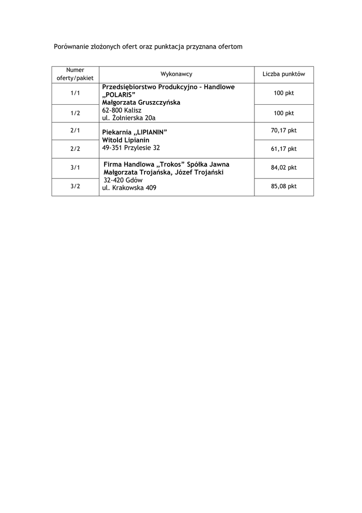 Porównanie złożonych ofert oraz punktacja przyznana ofertom Numer oferty/pakiet 1/1 1/2 2/1 2/2 3/1 3/2 Wykonawcy Przedsiębiorstwo Produkcyjno – Handlowe „POLARIS” Małgorzata Gruszczyńska 62-800 Kalisz ul. Żołnierska 20a Liczba punktów 100 pkt 100 pkt Piekarnia „LIPIANIN” Witold Lipianin 49-351 Przylesie 32 70,17 pkt Firma Handlowa „Trokos” Spółka Jawna Małgorzata Trojańska, Józef Trojański 32-420 Gdów ul. Krakowska 409 84,02 pkt 61,17 pkt 85,08 pkt