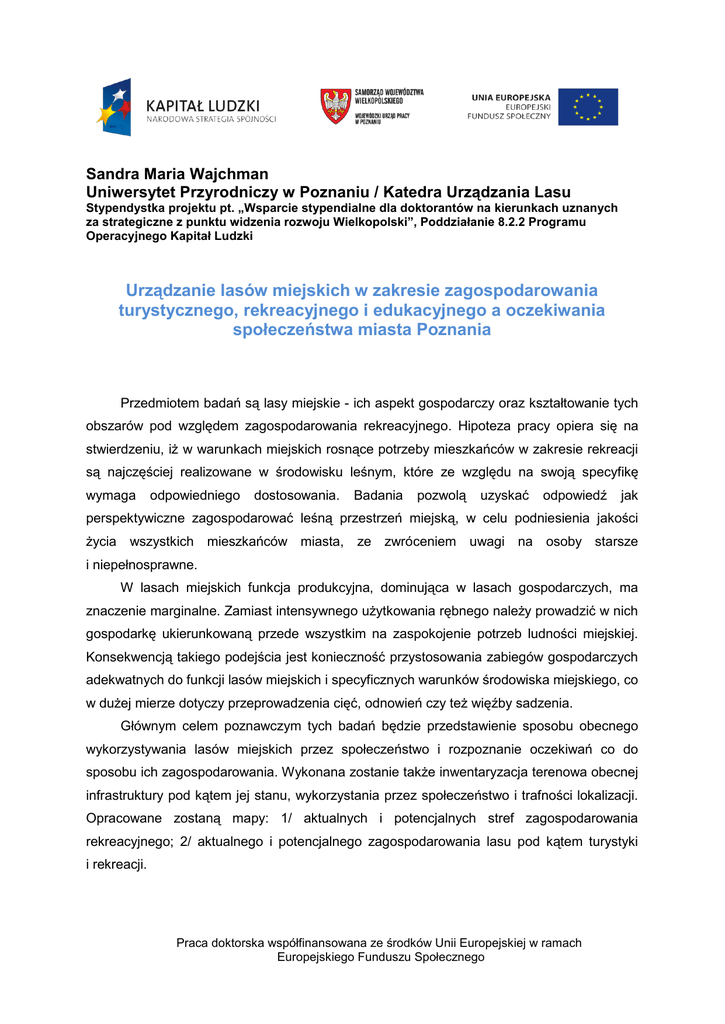 Sandra Maria Wajchman Uniwersytet Przyrodniczy w Poznaniu / Katedra Urządzania Lasu Stypendystka projektu pt. „Wsparcie stypendialne dla doktorantów na kierunkach uznanych za strategiczne z punktu widzenia rozwoju Wielkopolski”, Poddziałanie 8.2.2 Programu Operacyjnego Kapitał Ludzki Urządzanie lasów miejskich w zakresie zagospodarowania turystycznego, rekreacyjnego i edukacyjnego a oczekiwania społeczeństwa miasta Poznania Przedmiotem badań są lasy miejskie - ich aspekt gospodarczy oraz kształtowanie tych obszarów pod względem zagospodarowania rekreacyjnego. Hipoteza pracy opiera się na stwierdzeniu, iż w warunkach miejskich rosnące potrzeby mieszkańców w zakresie rekreacji są najczęściej realizowane w środowisku leśnym, które ze względu na swoją specyfikę wymaga odpowiedniego dostosowania. Badania pozwolą uzyskać odpowiedź jak perspektywiczne zagospodarować leśną przestrzeń miejską, w celu podniesienia jakości życia wszystkich mieszkańców miasta, ze zwróceniem uwagi na osoby starsze i niepełnosprawne. W lasach miejskich funkcja produkcyjna, dominująca w lasach gospodarczych, ma znaczenie marginalne. Zamiast intensywnego użytkowania rębnego należy prowadzić w nich gospodarkę ukierunkowaną przede wszystkim na zaspokojenie potrzeb ludności miejskiej. Konsekwencją takiego podejścia jest konieczność przystosowania zabiegów gospodarczych adekwatnych do funkcji lasów miejskich i specyficznych warunków środowiska miejskiego, co w dużej mierze dotyczy przeprowadzenia cięć, odnowień czy też więźby sadzenia. Głównym celem poznawczym tych badań będzie przedstawienie sposobu obecnego wykorzystywania lasów miejskich przez społeczeństwo i rozpoznanie oczekiwań co do sposobu ich zagospodarowania. Wykonana zostanie także inwentaryzacja terenowa obecnej infrastruktury pod kątem jej stanu, wykorzystania przez społeczeństwo i trafności lokalizacji. Opracowane zostaną mapy: 1/ aktualnych i potencjalnych stref zagospodarowania rekreacyjnego; 2/ aktualnego i potencjalnego zagospodarowania lasu pod kątem turystyki i rekreacji. Praca doktorska współfinansowana ze środków Unii Europejskiej w ramach Europejskiego Funduszu Społecznego Interdyscyplinarna praca porusza często spotykane w badaniach geograficznych problemy udziału w turystyce społeczności reprezentującej dany region oraz posiadającej określone cechy społeczno-demograficzne. Cele szczegółowe pracy to: • Stwierdzenie stanu ilościowego i jakościowego istniejącej na gruncie infrastruktury turystycznej, rekreacyjnej, edukacyjnej w lasach miejskich miasta Poznania na podstawie własnej inwentaryzacji i metod oceny. • Określenie zasięgu oraz zasadności i trafności wyróżnienia stref zagospodarowania rekreacyjnego w lasach miejskich miasta Poznania. • Ustalenie modelu aktywności rekreacyjnej społeczeństwa miasta Poznania na podstawie badań ankietowych wybranych grup społecznych odnośnie oceny istniejącej infrastruktury, rekreacyjnej, edukacyjnej w lasach miejskich i ich oczekiwań w zakresie możliwości pełnienia przez lasy miejskich funkcji turystycznych, rekreacyjnych i edukacyjnych. • Weryfikacja zapisów wytycznych do prowadzenia gospodarki leśnej w lasach miejskich miasta Poznania (2012) pod kątem oczekiwań ludności miasta Poznania. Innowacyjna koncepcja pracy doktorskiej włączająca społeczeństwo w proces planowania zagospodarowania przestrzeni publicznej skutkować będzie długoterminowymi efektami społecznymi dla mieszkańców miasta i całego regionu. Realizowane badania są tym bardziej istotne, że Poznań w skali kraju jest miastem posiadającym jedną z największych powierzchni lasów miejskich, która wynosi 2 463 ha (stan na maj 2013r.) Ponadto łącznie z innymi formami własności miasto posiada ponad 4 tys. ha obszarów leśnych. Efekty pracy przyczynią się do prawidłowego rozwoju miasta w zakresie ładu przestrzennego, przyczynią się także do wzrostu atrakcyjności obszaru metropolitarnego dla nowych inwestycji. Praca ma również znaczenie w ochronie przyrody przyczyniając się do odpowiedniego zachowania walorów środowiska leśnego w mieście. Dzięki uzyskanym wynikom będzie można promować lasy komunalne miasta Poznania w Wielkopolsce, które będą miały szansę stania się obiektem referencyjnym, wyznaczającym kierunki prowadzenia gospodarki leśnej, w lasach niepaństwowych, uwzględniając zdanie i opinie społeczeństwa. Praca doktorska współfinansowana ze środków Unii Europejskiej w ramach Europejskiego Funduszu Społecznego