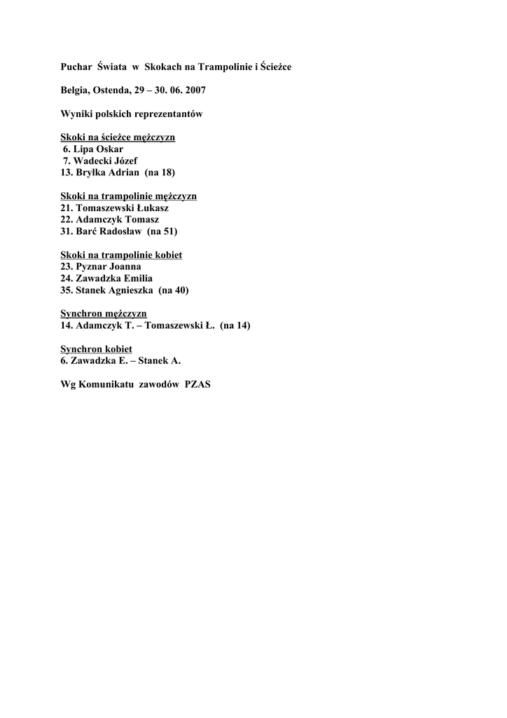 Puchar Świata w Skokach na Trampolinie i Ścieżce Belgia, Ostenda, 29 – 30. 06. 2007 Wyniki polskich reprezentantów Skoki na ścieżce mężczyzn 6. Lipa Oskar 7. Wadecki Józef 13. Bryłka Adrian (na 18) Skoki na trampolinie mężczyzn 21. Tomaszewski Łukasz 22. Adamczyk Tomasz 31. Barć Radosław (na 51) Skoki na trampolinie kobiet 23. Pyznar Joanna 24. Zawadzka Emilia 35. Stanek Agnieszka (na 40) Synchron mężczyzn 14. Adamczyk T. – Tomaszewski Ł. (na 14) Synchron kobiet 6. Zawadzka E. – Stanek A. Wg Komunikatu zawodów PZAS
