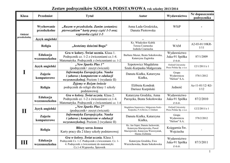 Zestaw podręczników SZKOŁA PODSTAWOWA rok szkolny 2013/2014 Klasa Oddział przedszkolny Przedmiot Tytuł Autor Wydawnictwo Nr dopuszczenia podręcznika Wychowanie przedszkolne „Razem w przedszkolu. Zanim zostaniesz pierwszakiem” karty pracy część 1-5 oraz wyprawka części 1-5 Anna Łada-Grodzicka, Danuta Piotrowska WSiP - Język angielski - - - - „Jesteśmy dziećmi Boga” Ks. Władysław Kubik Teresa Czarnecka Izabela Czarnecka WAM A2-03-01/10KR1/11 Wydawnictwo Juka-91 Spółka z o.o. 87/1/2009 Oxford University Press Polska Sp. z o.o. 12/1/2011/z 1 Grupa Wydawnicza "Helion" S.A. 578/1/2012 Jedność Az-11-01/12/-KI1/12 Wydawnictwo Juka-91 Spółka z o.o. 87/2/2010 Oxford University Press Polska Sp. z o.o. 12/2/2011/z 1 Grupa Wydawnicza "Helion" S.A. 578/2/2012 Religia Gra w kolory. Świat ucznia. Klasa 1. Barbara Mazur, Beata Sokołowska, Podręcznik cz. 1-2 z ćwiczeniami cz.1-4. Katarzyna Zagórska Matematyka. Podręcznik z ćwiczeniami cz. 1-2 Szpotowicz Magdalena „New Sparks Plus 1” Język angielski (podręcznik+ zeszyt ćwiczeń) Szulc-Kurpaska Małgorzata Informatyka Europejczyka. Nauka Danuta Kiałka, Katarzyna Zajęcia i zabawa z komputerem w edukacji Kiałka, komputerowe wczesnoszkolnej. Poziom 1 (wydanie II) Żyjemy w Bożym świecie Elżbieta Kondrak podręcznik do religii dla klasy 1 szkoły Religia Dariusz Kurpiński podstawowej Gra w kolory. Świat ucznia. Klasa 2. Katarzyna Grodzka, Anna Edukacja Podręcznik cz. 1-2 z ćwiczeniami cz.1-4. Parzęcka, Beata Sokołowska wczesnoszkolna Matematyka. Podręcznik z ćwiczeniami cz. 1-4 „New Sparks Plus 2” Magdalena Szpotowicz, Małgorzata SzulcJęzyk angielski Kurpaska, P.A.Davies, C.Graham (podręcznik+ zeszyt ćwiczeń) Informatyka Europejczyka. Nauka Danuta Kiałka, Katarzyna Zajęcia i zabawa z komputerem w edukacji Kiałka, komputerowe wczesnoszkolnej. Poziom 2 (wydanie II) Edukacja wczesnoszkolna I II III Religia Bliscy sercu Jezusa Karty pracy dla 2 klasy szkoły podstawowej Ks. Jan Szpet, Danuta Jackowiak, Katarzyna Maciejewska, Paweł Maciejewski, Katarzyna Wawrzyniak, Hanna Zielińska Księgarnia Św. Wojciecha - Edukacja wczesnoszkolna Gra w kolory. Świat ucznia. Klasa 3. Podręcznik Cz. 1-2. Podręcznik z ćwiczeniami. Cz. 14. Podręcznik z ćwiczeniami do matematyki. Cz.1-4.Wyprawka. Śpiewnik Katarzyna Grodzka, Ewa Wierzchowska, Beata Sokołowska Wydawnictwo Juka-91 Spółka z o.o. 87/3/2011 1 Oxford University Press Polska Sp. z o.o. 12/3/2011/z 1 Danuta Kiałka, Katarzyna Kiałka, Grupa Wydawnicza "Helion" S.A. 578/3/2012 Ks. Jan Szpet, Danuta Jackowiak Księgarnia Św. Wojciecha - J. polski Teraz polski! Podręcznik do kształcenia literackiego, kulturowego i językowego dla klasy 4 szkoły podstawowej + ćwiczenie Anna Klimowicz Nowa Era Spółka z o.o. 538/1/2012 Matematyka Matematyka z plusem Matematyka 4. Podręcznik dla klasy czwartej szkoły podstawowej. +Zeszyty ćwiczeń: Liczby naturalne, Ułamki, Figury geometryczne Małgorzata Dobrowolska, Marta Jucewicz, Piotr Zarzycki GWO M. Dobrowolska Sp.j. 340/1/2011 Przyroda „Tajemnice przyrody” Podręcznik dla klasy IV + zeszyty ćwiczeń cz. 1 i cz.2 Maria Marko-Worłowska, Feliks Szlajfer, Joanna Stawarz Nowa Era Spółka z o.o. 399/1/2011 Historia „Wczoraj i dziś” Historia i społeczeństwo podręcznik dla klasy IV szkoły podstawowej +ćwiczenia + atlas Grzegorz Wojciechowski Nowa Era Spółka z o.o. 443/1/2012 Język angielski „Steps in English 1.Student’s book Podręcznik + ćwiczenia Tim Falla, Paul A.Davies, Sylwia Wheeldon, Paul Shipton, Ewa Palczak Oxford University Press Polska Sp. z o.o 302/1/2010 J. niemiecki „Wir neu 1” podręcznik + ćwiczenie Giorgio Motta, Ewa Wieszczeczyńska, Ewa Książek – Kempa, Aleksandra Kubicka Wydawnictwo Lektorklett 442/1/2012 Muzyka „I gra muzyka” Podręcznik do muzyki dla klas IV-VI szkoły podstawowej Monika Gromek Grażyna Kilbach Nowa Era Spółka z o.o. 569/2012 Plastyka „Do dzieła!”Podręcznik do plastyki dla klas IV – VI szkoły podstawowej Jadwiga Lukas, Krystyna Ornak Nowa Era Spółka z o.o. Wydawnictwo Era Sp. z o.o. 326/2011 Zajęcia komputerowe „Informatyka Europejczyka”. Podręcznik do zajęć komputerowych dla szkoły podstawowej. Klasa 4. Edycja: Windows XP, Linux Ubuntu, MS Office 2003, OpenOffice.org (wydanie II) Danuta Kiałka, Katarzyna Kiałka, Grupa Wydawnicza „Helion” S.A. 396/1/2011 Zajęcia komputerowe Religia IV „New Sparks Plus 3” (podręcznik+ zeszyt ćwiczeń) Informatyka Europejczyka. Nauka i zabawa z komputerem w edukacji wczesnoszkolnej. Poziom 3 (wydanie II) „Jezusowa wspólnota serc” karty pracy (bez podręcznika) Paul A. Davies, C. Graham, Magdalena Szpotowicz, Małgorzata Szulc-Kurpaska Język angielski 2 Zajęcia techniczne Religia J. polski Matematyka V a/b Przyroda Historia Zajęcia komputerowe „Jak to działa?”Podręcznik z ćwiczeniami do zajęć technicznych dla klas 4-6 szkoły podstawowej „Jestem chrześcijaninem” Teraz polski! Podręcznik do kształcenia literackiego, kulturowego i językowego dla klasy piątej szkoły podstawowej+ ćwiczenie (Nowa wersja)Matematyka 5 „Matematyka z plusem” Podręcznik dla klasy 5 szkoły podstawowej. + Zeszyty ćwiczeń: Liczby całkowite i ułamki cz. 1., Liczby całkowite i ułamki cz. 2, Geometria Tajemnice przyrody. Podręcznik dla klasy 5 szkoły podstawowej + zeszyt ćwiczeń nr 1 klasa 5 część1 „Wczoraj i dziś” Podręcznik do historii i społeczeństwa dla klasy V szkoły podstawowej +ćwiczenia „Informatyka Europejczyka”. Podręcznik do zajęć komputerowych dla szkoły podstawowej. Klasa 5. Edycja: Windows XP, Linux Ubuntu, MS Office 2003, OpenOffice.org (wydanie II) 295/2010 Lech Łabecki, Marta Łabecka Nowa Era Sp. z o.o. Wydawnictwo Era Sp. z o.o. Barabara Buk Danuta Jackowiak Katarzyna Maciejewska Św. Wojciecha AZ-21-01/10-PO1/11 Anna Klimowicz Nowa Era Sp. z o.o. 538/2/2013 Małgorzata Dobrowolska, Marta Jucewicz, Marcin Karpiński,