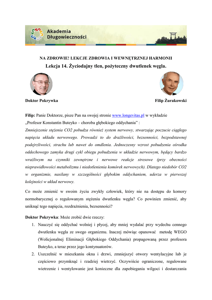 NA ZDROWIE! LEKCJE ZDROWIA I WEWNĘTRZNEJ HARMONII Lekcja 14. Życiodajny tlen, pożyteczny dwutlenek węgla. Doktor Pokrywka Filip Żurakowski Filip: Panie Doktorze, pisze Pan na swojej stronie www.longevitas.pl w wykładzie „Profesor Konstantin Buteyko – choroba głębokiego oddychania” : Zmniejszenie stężenia CO2 pobudza również system nerwowy, stwarzając poczucie ciągłego napięcia układu nerwowego. Prowadzi to do drażliwości, bezsenności, bezpodstawnej podejrzliwości, strachu lub nawet do omdlenia. Jednoczesny wzrost pobudzenia ośrodka oddechowego zamyka drugi cykl obiegu pobudzenia w układzie nerwowym, będący bardzo wrażliwym na czynniki zewnętrzne i nerwowe reakcje stresowe (przy obecności nieprawidłowości metabolizmu i niedotlenienia komórek nerwowych). Dlatego niedobór CO2 w organizmie, nasilany w szczególności głębokim oddychaniem, uderza w pierwszej kolejności w układ nerwowy. Co może zmienić w swoim życiu zwykły człowiek, który nie na dostępu do komory normobarycznej o regulowanym stężeniu dwutlenku węgla? Co powinien zmienić, aby uniknąć tego napięcia, rozdrażnienia, bezsenności? Doktor Pokrywka: Może zrobić dwie rzeczy: 1. Nauczyć się oddychać wolniej i płycej, aby mniej wydalać przy wydechu cennego dwutlenku węgla ze swego organizmu. Inaczej mówiąc opanować metodę WEGO (Wolicjonalnej Eliminacji Głębokiego Oddychania) propagowaną przez profesora Buteyko, a teraz przez jego kontynuatorów. 2. Uszczelnić w mieszkaniu okna i drzwi, zmniejszyć otwory wentylacyjne lub je częściowo przymknąć i rzadziej wietrzyć. Oczywiście ograniczone, regulowane wietrzenie i wentylowanie jest konieczne dla zapobiegania wilgoci i dostarczania tlenu. Ale nadmierne wentylowanie i zbyt częste wietrznie powoduje obniżenie i tak zbyt niskiego poziomu dwutlenku węgla w mieszkaniach i pomieszczeniach pracy. W takich mało wentylowanych pomieszczeniach należy kontrolować czujnikami stężenie tlenu i dwutlenku węgla oraz wilgotność. Zawartość tlenu w powietrzu powinna wynosić powyżej 19%, a dwutlenku węgla od 0,5 do 1,0%. Właściwy poziom wilgotności to wilgotność poniżej 65%. Filip : Teraz już rozumiem, dlaczego Pan mówi, że powinniśmy oddychać powietrzem, które zawiera 15 do 30 razy więcej dwutlenku węgla. Rozumiem też coraz lepiej, dlaczego nie należy głęboko oddychać. Powtórzmy to jeszcze raz: oddychając głęboko człowiek co prawda nabiera do płuc więcej życiodajnego tlenu, ale też więcej przy wydechu wydala cennego dwutlenku węgla. A bez dwutlenku węgla nie nastąpi wspomniany w poprzedniej lekcji efekt Bohra - innymi słowy dwutlenek węgla jest konieczny, aby tlen mógł dostać się do krwi i do komórek. To, że tlen znalazł się w moich płucach wcale nie oznacza, że nie będę niedotleniony na poziomie komórkowym. A teraz proponuję przedstawić naszym czytelnikom najlepsze Pana zdaniem rozwiązanie: komorę normobaryczną, o której pisze Pan we wspomnianym już wykładzie. Doktor Pokrywka: W obecnych czasach człowiek żyje w atmosferze, w której panuje ciśnienie ok. 1000 hPa (hektopaskali), a zawartość dwutlenku węgla wynosi 0,03 %. W komorze normobarycznej odtworzone są warunki zbliżone do tych, w jakich żyli ludzie przed potopem: ciśnienie ok. 1500 hektopaskali i około 0,5% dwutlenku węgla. Ponadto osiągamy tam efekt bardzo pożądany , a trudny do uzyskania jakąkolwiek inną metodą: wysoki poziom dwutlenku węgla i równoczesny wysoki poziom tlenu. Powietrze w komorze normobarycznej zawiera około 32 do 35% przeliczeniowych tlenu, a więc natlenienie jest tam aż o 50% lepsze niż na zewnątrz. Chodzi o to, że gdy sprężymy powietrze do 1500 hPa , dostępność tlenu dla organizmu zwiększa się o 50 procent. Dzięki profesorowi Warburgowi wiemy, że rak i inne choroby przewlekłe spowodowane są niedotleniem komórek. Profesor Buteyko uświadomił nam dobitnie, że przy niedoborze dwutlenku węgla w organizmie dostęp tlenu do komórek organizmu jest utrudniony. W komorze normobarycznej w powietrzu mamy jedno i drugie: dość tlenu i dość dwutlenku węgla. To samo, co mieli ludzie przed potopem, żyjący kilkaset lat, nawet do 900 lat. Przepis polecany przez Filipa Zdjęcie Filip Żurakowski Jednym z moich życiowych zadań jest propagowanie picia zdrowej kawy zamiast kawy szkodliwej dla zdrowia. Dziś zamieszczę przepis na Kawę Kubata. W następnej lekcji wyjaśnię, dlaczego tak ją nazywam i jak doszło do tego, że stałem się kawoszem. Kawa Kubata Składniki: woda, kawa świeżo zmielona, imbir, kardamon, goździki, można dodać wanilię (1 cm laski) i mielony cynamon. Jak ja to robię: Do jednego litra zimnej wody wsypuję 8 małych łyżeczek mielonej kawy. Kawę rozsypuję po powierzchni, nie mieszam. Dodaję 1/3 łyżeczki imbiru w proszku, 3 goździki, ½ łyżeczki mielonego kardamonu. Podgrzewam powoli na małym płomieniu na kuchence gazowej. Gdy na powierzchni pojawią się bańki, wyłączam gaz i nakrywam rondel pokrywką. Czekam, aż opadną fusy, a następnie wlewam do filiżanek, dla siebie i żony. Do ładnych filiżanek, takich jak na zdjęciu, bo z ładnej filiżanki kawa lepiej smakuje. Słodzę dwoma łyżeczkami ksylitolu, bo lubię słodką kawę. Żona nie słodzi. W rondlu zostają jeszcze dwie filiżanki kawy na potem. Według mnie optymalna porcja dzienna to dwie kawy na osobę. Komentarz zdrowotny Doktora Pokrywki Jedyna postać kawy, jaką polecam jej amatorom, to kawa z ekspresu ciśnieniowego lub kawa gotowana, jak w przepisie podanym wyżej. Kawa powinna być świeżo zmielona lub przechowywana po zmieleniu w lodówce najwyżej 1-2 dni. Kawa mielona leżąc tygodniami na pólkach sklepowych ulega zakwaszeniu. Dlatego zalecam kupowanie dobrej kawy ziarnistej i mielenie jej na bieżąco. Z wymienionych dodatków najbardziej pozytywne działanie ma rozgrzewający imbir. Coś dla ducha Powracam do refleksji inspirowan
