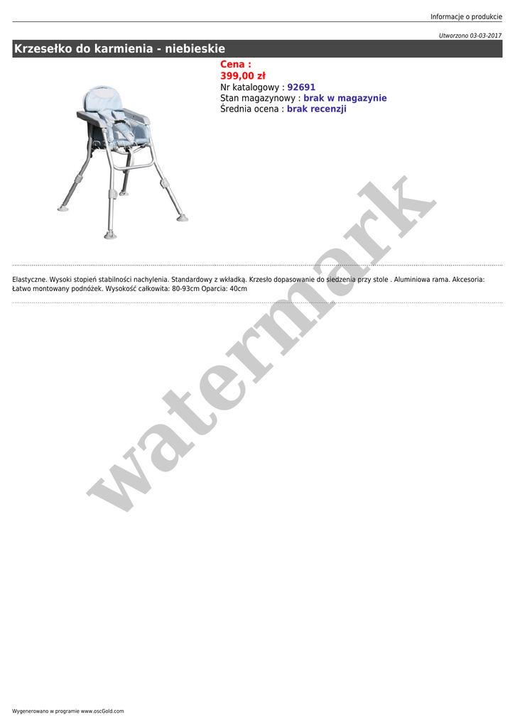 Informacje o produkcie Utworzono 03-03-2017 Krzesełko do karmienia - niebieskie Cena : 399,00 zł er m ar k Nr katalogowy : 92691 Stan magazynowy : brak w magazynie Średnia ocena : brak recenzji w at Elastyczne. Wysoki stopień stabilności nachylenia. Standardowy z wkładką. Krzesło dopasowanie do siedzenia przy stole . Aluminiowa rama. Akcesoria: Łatwo montowany podnóżek. Wysokość całkowita: 80-93cm Oparcia: 40cm Wygenerowano w programie www.oscGold.com