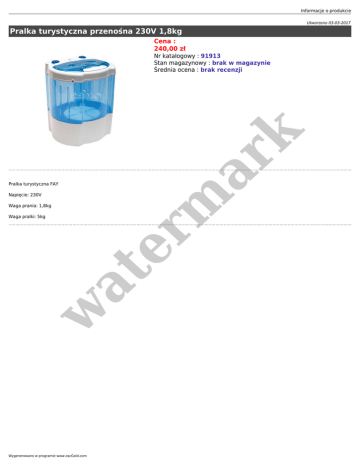Informacje o produkcie Utworzono 03-03-2017 Pralka turystyczna przenośna 230V 1,8kg Cena : 240,00 zł er m ar k Nr katalogowy : 91913 Stan magazynowy : brak w magazynie Średnia ocena : brak recenzji Pralka turystyczna FAY Napięcie: 230V Waga prania: 1,8kg w at Waga pralki: 5kg Wygenerowano w programie www.oscGold.com