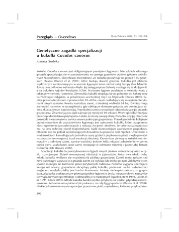 Przeglądy – Overviews Ornis Polonica 2012, 53: 202–208 Genetyczne zagadki specjalizacji u kukułki Cuculus canorus Joanna Sudyka Kukułka Cuculus canorus jest obligatoryjnym pasożytem lęgowym. Nie zakłada własnego gniazda specjalizując się w pasożytowaniu na szeregu gatunków ptaków, głównie wróblowych Passeriformes. Dotychczas stwierdzono, że kukułka pasożytuje na ponad 125 gatunkach ptaków (Honza et al. 2001), które budują otwarte gniazda. Kukułka jest ptakiem wędrownym zamieszkującym w sezonie lęgowym teren niemal całej Europy (bez Islandii), Turcję oraz północne wybrzeża Afryki. Jej zasięg poprzez Syberię rozciąga się aż do Japonii, a na południu Azji do Himalajów i Chin. Na tereny lęgowe przylatuje w kwietniu–maju a odlatuje w sierpniu–wrześniu. Zimowiska kukułki znajdują się na południe od Sahary oraz na Półwyspie Indyjskim, w południowo-wschodniej Azji i na Filipinach (Davies 2000). Samiec posiada terytorium o powierzchni 30–40 ha, często nakładające się zasięgiem z terytoriami innych samców. Rewiry rozrodcze samic, o średniej wielkości 64 ha, również mogą zachodzić na siebie, w szczególności, gdy obfitują w dostępne gniazda, ale dominująca samica składa zawsze najwięcej jaj. Popołudniu samica wyszukuje odpowiadające jej gniazdo gospodarza. Złożenie jaja na ogół zajmuje jej mniej niż 10 sekund. W ten sposób zmniejsza prawdopodobieństwo przyłapania i ataku ze strony swojej ofiary. Ponadto, aby jej obecność pozostała niezauważona, samica usuwa jedno jajo gospodarza. Prawdopodobnie kolejnym przystosowaniem do pasożytnictwa lęgowego jest upierzenie kukułki, które przypomina nieco upierzenie jastrzębiowatych z rodzaju Accipiter. Możliwe, że takie naśladownictwo ma na celu ochronę przed drapieżnikami, bądź skuteczniejsze zastraszenie gospodarzy. Obecnie nie ma jednak wystarczających dowodów na poparcie tych hipotez. Upierzenie o właściwościach kamuflujących (jednolicie szary grzbiet i prążkowana pierś) mogło powstać na zasadzie konwergencji (czyli ewolucji zbieżnej). Dymorfizm płciowy u kukułki jest niewyraźny u odmiany szarej, samicę wyróżnia jedynie lekko rdzawe zabarwienie w górnej części piersi, aczkolwiek część samic występuje w odmianie rdzawej o jasnorudej barwie wierzchu ciała (Davies 2000). Adaptacje kukułki do pasożytowania na lęgach innych ptaków widoczne są także w cyklu rozwojowym. Dzięki wewnętrznej inkubacji w jajowodzie, która trwa około doby, młoda kukułka wykluwa się wcześniej niż pisklęta gospodarzy. Dzięki temu zyskuje nad nimi przewagę i wyrzuca je z gniazda zanim się wyklują lub krótko po tym. Zdobywa w ten sposób monopol na karmienie przez przybranych rodziców. Pomimo wyglądu uderzająco innego niż własny, gospodarze akceptują pisklę kukułki, ponieważ nauka wybiórczości względem wyglądu piskląt jest bardzo kosztowna. Istnieje niebezpieczeństwo, że gospodarz, z kukułką podrzuconą w pierwszej próbie lęgowej w życiu, nieprawidłowo nauczyłby się wyglądu własnego młodego i odrzucałby je w następnych lęgach (Lotem 1993, Lotem et al. 1995, Kilner 2010). Młoda kukułka bardzo szybko przybiera na wadze, gdyż dzięki intensywnemu żebraniu sama pobiera tyle pokarmu, co cały lęg gospodarza (Davies et al. 1998). Niekiedy karmienie wspomagane jest przez inne ptaki z sąsiedztwa, które na przykład stra202 ciły swoje lęgi. W gnieździe przebywa około trzech tygodni, natomiast samodzielność uzyskuje po sześciu (Davies 2000). Samice kukułek składają różne typy jaj imitujące kolor tła oraz układ plamek jaj gospodarza i na tej podstawie dzieli się je na rasy bądź szczepy (w języku angielskim stosuje się pochodzącą z łaciny nazwę gens lub gentes w liczbie mnogiej (Davies 2000)). Taka mimikra (naśladownictwo) ułatwia zadanie kukułce, bowiem gospodarz chętniej akceptuje jajo, które niewiele różni się od jego własnych. Dotychczas udało się wyróżnić 17 typów (ang. morph) jaj (Fossøy et al. 2011). Najbardziej rozpowszechniony jest typ Sylvia (ciemne, dość duże plamki na jasnym tle), który podkładany jest do gniazd aż 20 gatunków gospodarzy, między innymi trzciniaka Acrocephalus arundinaceus oraz gajówki Sylvia borin. Innym szeroko spotykanym typem jest typ Anthus charakteryzujący się na ogół jasnym tłem oraz brązowymi lub rdzawymi plamkami o niewielkich rozmiarach. Jaja tego typu podrzucane są rudzikowi Erithacus rubecula, świstunce leśnej Phylloscopus sibilatrix oraz świergotkowi drzewnemu Anthus trivialis. Jednolite, niebieskie jaja kukułki można znaleźć w gniazdach pleszki Phoenicurus phoenicurus (Honza et al. 2001). Mimo doskonałego w wielu przypadkach dopasowania, niektórzy gospodarze potrafią bardzo dobrze wytypować i pozbyć się podrzuconego jaja. Uważa się, że takie zdolności zależą od stopnia kontradaptacji gospodarza do eksploatacji przez pasożyta lęgowego. Pokrzywnica Prunella modularis potrafi odrzucić jedynie 1,6% kukułczych jaj, natomiast gąsiorek Lanius collurio aż 100% (Avilés & Garamszegi 2007). W ewolucyjnym wyścigu zbrojeń w układzie pasożyt lęgowy – gospodarz, presja selekcyjna jest nierówna i to właśnie kukułka ma „więcej do stracenia”. W związku z tym musi być zawsze o krok przed gospodarzem, żeby móc go skutecznie oszukiwać (Dawkins & Krebs 1979). Zadanie to jest ułatwione dzięki istnieniu wyspecjalizowanych szczepów. Mechanizm powstawania, obecność i utrzymywanie się szczepów u kukułki są jednym z ważniejszych zagadnień w badaniach nad tym gatunkiem. Niniejszy artykuł jest przeglądem aktualnie rozważanych modeli dziedziczenia przynależności do szczepu i dziedziczenia koloru jaja u kukułki. Rola płci w utrzymywaniu się szczepów kukułki Obecność ras kukułki odkryto dzięki różnorodności jaj składanych przez samice. W związku z tym należało sprawdzić czy istn