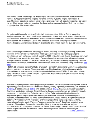 II wojna światowa niedziela, 23 maja 2010 14:23 1 września 1939 r. rozpoczęła się druga wojna światowa atakiem Niemiec hitlerowskich na Polskę. Bywają również inne poglądy na temat terminu wybuchu wojny, wynikające z subiektywnego podejścia państw, które kolejno przystępowały lub zostały wciągnięte do wojny. Na przykład włoscy historycy twierdzą, że druga wojna rozpoczęła się w 1940 r., a rosyjscy przyjmują datę 22 czerwca 1941 r. Do wojny dojść musiało, ponieważ takie były szaleńcze plany Hitlera. Żadne ustępstwa kolejnych państw nie powstrzymałyby go. Stanowisko Hitlera było jasne, czemu dawał wyraz podczas narad z wysokimi dowódcami Wehrmachtu - nie chodziło o sporne ziemie ani dotarcie do określonej linii w Europie. Celem było zdobycie przestrzeni życiowej dla narodu niemieckiego i panowanie nad światem. Granice tej przestrzeni nigdy nie były sprecyzowane. Polska miała sojusze obronne z Francją i z Wielką Brytanią, mimo więc przewagi technicznej i liczebnej armii niemieckiej mogła mieć nadzieję na zwycięstwo. Tę nadzieję pogłębiło przystąpienie tych państw do wojny 3 września 1939 r. Niestety, nie doszło do działań zbrojnych i Polska walczyła samotnie, a rankiem 17 września zaatakowana została od wschodu przez Armię Czerwoną. Została pobita przez dwóch wrogów, nie doczekawszy się pomocy. Jeszcze trwały ostatnie walki (5 października Polacy stoczyli bitwę pod Kockiem), kiedy sojusznicy, Nie mcy i ZSRR, 28 września zawarli "Układ o granicach i przyjaźni". Zmieniono w nim nieco ustalenia z tajnego protokołu do układu Ribbentrop-Mołotow. Ziemie polskie między Bugiem a Wisłą dostały Niemcy, a w zamian zgodziły się na aneksję Litwy przez ZSRR. Polska jako państwo nigdy nie skapitulowała przed żadnym z agresorów, kapitulowały tylko poszczególne punkty oporu. Stan wojny więc trwał. Niezwłocznie po agresji na Polskę dyplomacja sowiecka narzuciła państwom bałtyckim sojusze ograniczające ich suwerenność. Podpisane zostały układy o pomocy wzajemnej - 28 września z Estonią , 5 października z Łotwą i 10 października z Litwą . Państwa te musiały udostępnić Sowietom swoje bazy wojenne. Zaraz też Armia Czerwona rozlokowała się na ich terytoriach. Następnie przyszła kolej na Finlandię, wobec której Związek Sowiecki zgłosił żądania terytorialne: przesunięcie granicy na Przesmyku Karelskim, oddanie północnego portu Petsamo, wydzierżawienie na 30 lat półwyspu Hanko w Zatoce Fińskiej. Rząd fiński odrzucił żądania. Wówczas w ZSRR rozpętano antyfińską napastliwą kampanię propagandową, nazywając członków rządu fińskiego "poszukiwaczami awantur". Doszło do strzelaniny na granicy z Finlandią na Przesmyku Karelskim. Była to prowokacja sowiecka, jednak odpowiedzialność za incydent zrzucono na Finów. Stwierdzając, że rząd fiński "przebrał miarę", ZSRR rozpoczął wojnę 31 listopada 1939 r. Mimo iż grożono Finlandii "miażdżącym uderzeniem", Armia Czerwona 1/9 II wojna światowa niedziela, 23 maja 2010 14:23 została odparta i później z trudem łamała opór słabego przeciwnika, którego wojska dzielnie się broniły przez kilka miesięcy. Europa Zachodnia zareagowała potępieniem agresora, ZSRR został wykluczony z Ligi Narodów. Na pomoc Finlandii planowano wysłanie międzynarodowego korpusu ekspedycyjnego, ale przygotowania szły niemrawo i wcześniej wojna zakończyła się. W końcu lutego wojska sowieckie pod dowództwem generała S. Timoszenki przełamały fińskie linie obronne. 12 marca podpisano układ pokojowy w Moskwie. Finowie zostali zmuszeni do oddania ZSRR większości Przesmyku Karelskiego ze stolicą Karelii - Wyborgiem, ponadto zachodniej Karelii oraz kilku wysp w Zatoce Fińskiej. Półwysep Hanko został wydzierżawiony na 30 lat. Pozostałe państwa skandynawskie poczuły się zagrożone, ponieważ nie tylko ZSRR zagrażał ich niepodległości, ale ze względów strategicznych i ekonomicznych (niemiecki przemysł metalurgiczny oparty był w dużej mierze na szwedzkiej rudzie żelaza) Półwyspem Skandynawskim interesowały się głównie Niemcy , chociaż w przemysł skandynawski był też mocno zaangażowany kapitał brytyjski. Wiel ka Brytania popierała dążenia Norwegii i Szwecji do zachowania neutralności. Po wojnie z Polską, wyczerpana armia niemiecka gromadziła zapasy uzbrojenia, uzupełniała braki, szykując się do kolejnej agresji. Hitler postanowił zapobiec wejściu Anglików do Skandynawii i na Bałtyk. W tym celu opracował plan zajęcia Danii i Norwegii pod kryptonimem "Fali Weserubung". Niemcom zależało na uzyskaniu kontroli nad cieśninami duńskimi, zapewnieniu sobie dostaw rudy szwedzkiej i przygotowaniu dogodnych punktów strategicznych do przyszłej inwazji na Wyspy Brytyjskie. Agresja na Danię i Norwegię rozpoczęła się 9 kwietnia 1940 r. Danię wojska niemieckie opanowały w ciągu jednego dnia, w zasadzie bez rozlewu krwi. Nieco dłużej trwało zdobywanie Norwegii, ponieważ początkowo armia norweska skutecznie odpierała ataki Wehrmachtu. Jednak wystąpienie miejscowych nazistów pod wodzą Vidkuna Quislinga znacznie przyspieszyło upadek Norwegii. Wielka Brytania wystąpiła czynnie przeciwko agresorom, ponieważ poważnie zostało zagrożone jej bezpieczeństwo. Flota angielska wysłana na wody norweskie zadała Niemcom spore straty. Następnie, w wyniku porozumienia angielsko-francuskiego, w połowie kwietnia do Norwegii wysłany został trzydziestotysięczny korpus ekspedycyjny. W skład korpusu wchodziła polska Brygada Strzelców Podhalańskich pod dowództwem generała Zygmunta Szyszki-Bohusza. 2/9 II wojna światowa niedziela, 23 maja 2010 14:23 Korpus nie zdołał przeciwstawić się Niemcom i w pierwszych dniach maja został wycofany. Największe sukcesy miała polska brygada walcząca pod Narwikiem. Ewakuacja nastąpiła związku z atakiem niemieckim na Francję. Kr