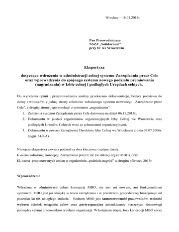 Wrocław – 18.01.2014r. Pan Przewodniczący NSZZ „Solidarność” przy IC we Wrocławiu Ekspertyza dotycząca wdrożenia w administracji celnej systemu Zarządzania przez Cele oraz wprowadzenia do spójnego systemu nowego podziału premiowania (nagradzania) w Izbie celnej i podległych Urzędach celnych. Do wyrażenia opinii i przeprowadzenia analizy przekazano dokumentację, będącą podstawą do oceny i wniosków, z jednej strony celowości wdrażanego systemu nazwanego „Zarządzanie przez Cele", z drugiej strony jego korelacji z systemem „nagradzania”: 1. Założenia systemu Zarządzania przez Cele datowane na dzień 06.11.2013r., 2. Dokumentu w postaci regulaminów organizacyjnych Izby Celnej we Wrocławiu oraz podległych Urzędów Celnych wraz ze schematami organizacyjnymi, 3. Dokumentu w postaci Zarządzenia Dyrektora Izby Celnej we Wrocławiu z dnia 07.07.2006r. (sygn. 64/KA). Niniejsza ekspertyza zawiera podział na dwa kluczowe i spójne działy: I. ocena wdrażanej koncepcji Zarządzania przez Cele (w dalszej części MBO), oraz II. ocena proponowanych zmian w regulaminie „podziału nagród” w drugim półroczu 2013r. Wprowadzenie Wdrażana w administracji celnej koncepcja MBO, nie jest ani nowym, ani funkcjonalnym systemem. MBO jest już klasyką w teorii zarządzania i w przestrzeni gospodarczej funkcjonuje od początku lat 60. ubiegłego stulecia. Sednem MBO jest samosterowność pracowników, wolność wyboru ścieżek osiągania celów oraz partycypacyjne poszukiwanie płaszczyzn równowagi pomiędzy celami pracowników a celami organizacji. W kolejnym etapie, losy koncepcji MBO coraz bardziej skazywały ją na dryf w kierunku inżynierskim. Kolejne profesjonalne prace MBO precyzowały jak definiować i parametryzować cele. Praktyka gospodarcza wykorzystuje ją obecnie do tworzenia bardziej złożonych systemów motywowania i zarządzania, koncentrując uwagę zarządów przede wszystkim na stale toczącym się w organizacji, tworzącym ją wciąż na nowo dialogu strategicznym. Zastrzeżenia dotyczące wdrażanej koncepcji I. Poddając szczegółowej analizie dokument źródłowy wraz z załącznikami nr 1 i 2, należy wykazać niektóre wątpliwości i zastrzeżenia wysuwanych wobec tej koncepcji i praktykę jej realizacji. I tak: 1.1. Zaletą metody sumarycznej jest prostota, możliwość szybkiego przeprowadzenia przy jednoczesnym niskim koszcie. Uzyskane wyniki nie są jednak precyzyjne, są obarczone dużą dozą subiektywizmu i trudne do racjonalnego uzasadnienia. Można postawić pytanie: na jakiej podstawie zadania "koncepcyjne" i analityczne zostało potraktowane równorzędnie ? 1.2. Występuje sprzeczność w interpretowaniu celowości MBO, bowiem różni się od tradycyjnego zarządzania zadaniowego tym, że z jednej strony próbuje określić stan docelowy, równocześnie niedookreślając sposobu dojścia do niego. Kluczem do zrozumienia koncepcji MBO jest samo pojęcie celu. Zarówno w powszechnym rozumieniu, jak i w przestrzeni gospodarczej – do której niewątpliwie należy administracja celna - cel jest rozumiany jako coś, do czego dążymy, a więc związany jest ze zmianą, z tworzeniem nowej wartości dla organizacji, którą są bezsprzecznie Izby Celne i/lub Urzędy Celne. Administrowanie zarządzanym obszarem należy do podstawowych obowiązków Kierowników i nie polega na zarządzaniu przez cele. Konsekwentnie więc, wskaźniki ekonomiczne, określone między innymi miarą ilościową, nie są celami. Stanowią one jedynie miarę funkcjonalnej skuteczności. Cele nie mogą się do nich ograniczać, muszą wykraczać ponad te wskaźniki. 1.3. Wskazane w dokumentacji wszystkie cele MBO nie są rozwojowe, a równocześnie, dzięki przypisanym do nich wskaźnikom, słabo mierzalne. Stosowany przez kierowników wyższego szczebla Służby Celnej podział na cele ilościowe (mierzalne) i cele jakościowe (niemierzalne) jest fikcyjny i wynika z nierozumienia idei MBO i pojęcia celu jak też mechanistyczne pojmowanie organizacji. 1.4. Krytyką należy objąć istotę wskazanych założeń: - MBO przeszacowuje ważność celów. Kierownicy wyższego i niższego szczebla, dążąc do ich realizacji za wszelką cenę, mogą zaniedbać inne ważne aspekty, takie jak jakość czy relacje w organizacji. - ocenianie przez zarządzających na bazie poziomu realizacji celów powoduje koncentrację na krótkoterminowej efektywności kosztem długoterminowego rozwoju organizacji. - MBO nie doszacowuje znaczenia innych niż cele aspektów zarządzania w tworzeniu wartości dla samej organizacji - Izby Celnej i Urzędów Celnych. Stąd, wdrożenie MBO nie może się ograniczyć do napisania procedury i - ewentualnieprzeszkolenia ludzi. 1.5. Jak pokazuje praktyka gospodarcza najbardziej rozwiniętych krajów UE, MBO to nie zarządzanie przez wyniki. W prawidłowym systemie MBO, zarządzający ma definiowane takie cele, które wymagają od niego wprowadzenia trwałej zmiany w organizacji lub otoczeniu organizacyjnym, w którym zarządza. Trwałą zmianą są usprawnienia procesu, nowy proces, nowa usługa. Zarządzający jest mobilizowany do innowacji, do upraszczania i usprawniania procesów pracy, podnoszenia jakości i wartości dla klienta zewnętrznego oraz klienta wewnętrznego. Tego w analizowanym dokumencie brak. 1.6. Za pomocą tego dokumentu MBO, będzie się pogłębiać zjawisko zwane w przestrzeni gospodarczej „silosowością”. Polega ona na podziale organizacji na izolowane lub nawet zwalczające się „centra kosztów” i „centra zysków”, które są podległe i skupione wokół kierowników pionów. „Silosowość” jest zjawiskiem bardzo negatywnym z punktu widzenia efektywności i kosztów pracy. Aby temu przeciwdziałać należy posłużyć się techniką zwana „rynkiem celów”. W opisywanych założeniach tego brak. Analizowany dokument potwierdza natomiast, mogące wystąpić negatywne skutki, w ten sposób, ż