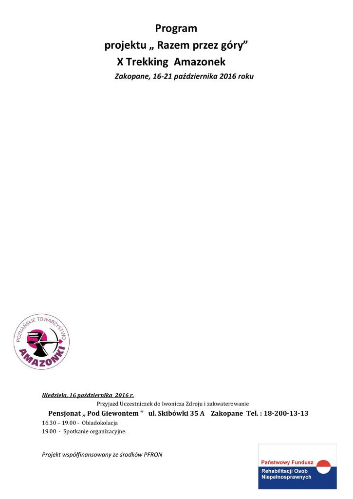 Program projektu „ Razem przez góry” X Trekking Amazonek Zakopane, 16-21 października 2016 roku Niedziela, 16 października 2016 r. Przyjazd Uczestniczek do Iwonicza Zdroju i zakwaterowanie Pensjonat ,, Pod Giewontem ‘’ ul. Skibówki 35 A Zakopane Tel. : 18-200-13-13 16.30 – 19.00 - Obiadokolacja 19.00 - Spotkanie organizacyjne. Projekt współfinansowany ze środków PFRON Poniedziałek, 17 października 2016 r. 8.00-9.00- Śniadanie ( plus suchy prowiant) 10.00 - Wyjście na trekking w bliskiej okolicy Zakopanego 16.00 - Powrót do hotelu 17.00 - Obiadokolacja 19.00 – Spotkanie integracyjne. Wtorek, 18 października 2016 r. 8.00-9.00 -Śniadanie ( plus suchy prowiant) 9.30 - Spotkanie z przewodnikiem i wyjście na trekking szlakiem górskim 16.00 – Powrót do hotelu 17.00 -Obiadokolacja Środa, 19 października 2016 r. 8.00-9.00-Śniadanie ( plus suchy prowiant) 9.30 - Spotkanie z przewodnikiem i wyjście na trekking szlakiem górskim 16.30 - Powrót do hotelu 17.00 - Obiadokolacja Czwartek, 20 października 2016 r. 8.00-9.00- Śniadanie ( plus suchy prowiant) 9.30 - Spotkanie z przewodnikiem i wyjście na trekking szlakiem górskim 16.30 - Powrót do hotelu 17.00 - Obiadokolacja Piątek, 21 października 2016 r. 8.00-9.00 - Śniadanie ( plus suchy prowiant) Spacer po Zakopanem Wyjazd Uczestniczek Szczegółowe trasy trekkingów będą ustalane na miejscu. PRZYPOMINAMY O KONIECZNYM ZAOPATRZENIU SIĘ W BUTY TREKKINGOWE, KIJKI, CIEPŁE KURTKI PRZECIWDESZCZOWE, CZAPKĘ, RĘKAWICZKI,…