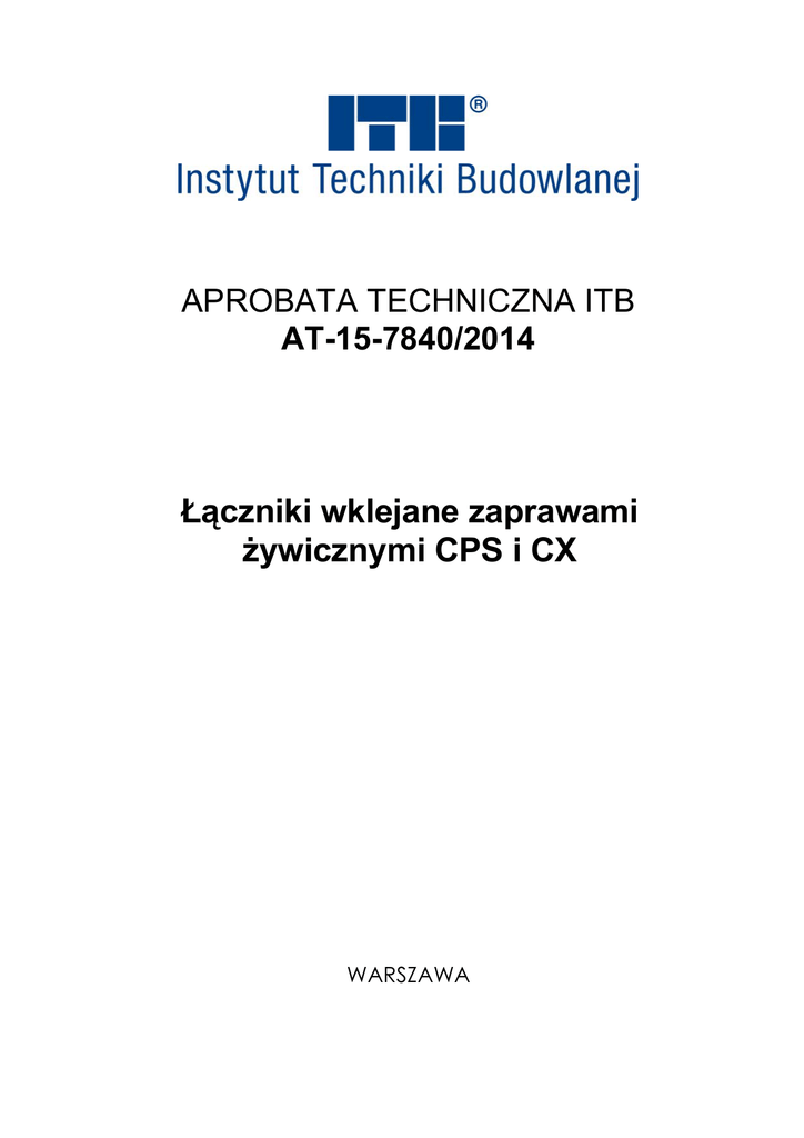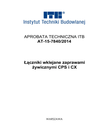 APROBATA TECHNICZNA ITB AT-15-7840/2014 Łączniki wklejane zaprawami żywicznymi CPS i CX WARSZAWA Aprobata techniczna została opracowana w Zakładzie Aprobat Technicznych przez dr inż. Witolda MAKULSKIEGO Projekt okładki: Ewa Kossakowska GW I Kopiowanie aprobaty technicznej jest dozwolone jedynie w całości Wykonano z oryginałów bez opracowania wydawniczego © Copyright by Instytut Techniki Budowlanej Warszawa 2015 ISBN 978-83-249-8274-5 Dział Upowszechniania Wiedzy 02-656 Warszawa, ul. Ksawerów 21, tel.: 22 843 35 19 Format pdf Wydano w lipcu 2015 r. zam. 232/2015 Seria: APROBATY TECHNICZNE APROBATA TECHNICZNA ITB AT-15-7840/2014 Na podstawie rozporządzenia Ministra Infrastruktury z dnia 8 listopada 2004 r. w sprawie aprobat technicznych oraz jednostek organizacyjnych upoważnionych do ich wydawania (tekst jednolity: Dz. U. z 2014 r., poz. 1040), w wyniku postępowania aprobacyjnego dokonanego w Instytucie Techniki Budowlanej w Warszawie na wniosek firmy: ARVEX GROBELNY Sp. z o.o. ul. Makuszyńskiego 4, 30-969 Kraków stwierdza się przydatność do stosowania w budownictwie wyrobów pod nazwą: Łączniki wklejane zaprawami żywicznymi CPS i CX w zakresie i na zasadach określonych w Załączniku, który stanowi integralną część niniejszej Aprobaty Technicznej ITB. KIEROWNIK Instytutu Techniki Budowlanej Termin ważności: 29 grudnia 2019 r. Michał Wójtowicz Załącznik: Postanowienia ogólne i techniczne Warszawa, 29 grudnia 2014 r. Aprobata Techniczna ITB AT-15-7840/2014 jest nowelizacją Aprobaty Technicznej ITB AT-15-7840/2008. Dokument Aprobaty Technicznej ITB AT-15-7840/2014 zawiera 26 stron. Tekst tego dokumentu można kopiować tylko w całości. Publikowanie lub upowszechnianie w każdej innej formie fragmentów tekstu Aprobaty Technicznej wymaga pisemnego uzgodnienia z Instytutem Techniki Budowlanej. ® AT-15-7840/2014 str. 2/26 ZAŁĄCZNIK POSTANOWIENIA OGÓLNE I TECHNICZNE SPIS TREŚCI 1. PRZEDMIOT APROBATY.................................................................................................... 3 2. PRZEZNACZENIE, ZAKRES I WARUNKI STOSOWANIA .................................................. 3 3. WŁAŚCIWOŚCI TECHNICZNE. WYMAGANIA ................................................................... 5 3.1. Materiały ....................................................................................................................... 5 3.2. Łączniki ......................................................................................................................... 6 4. PAKOWANIE, PRZECHOWYWANIE I TRANSPORT ......................................................... 6 5. OCENA ZGODNOŚCI .......................................................................................................... 6 5.1. System oceny zgodności .............................................................................................. 6 5.2. Wstępne badanie typu .................................................................................................. 7 5.3. Zakładowa kontrola produkcji ....................................................................................... 7 5.4. Badania gotowych wyrobów ......................................................................................... 8 5.5. Częstotliwość badań ..................................................................................................... 8 5.6. Metody badań ............................................................................................................... 8 5.7. Pobieranie próbek do badań......................................................................................... 9 5.8. Ocena wyników badań.................................................................................................. 9 6. USTALENIA FORMALNO-PRAWNE ................................................................................... 9 7. TERMIN WAŻNOŚCI ......................................................................................................... 10 INFORMACJE DODATKOWE ............................................................................................... 10 RYSUNKI i TABLICE.............................................................................................................. 12 ® AT-15-7840/2014 str. 3/26 1. PRZEDMIOT APROBATY Przedmiotem Aprobaty Technicznej są łączniki wklejane zaprawami żywicznymi CPS i CX, produkcji firmy ARVEX GROBELNY Sp. z o.o. Łączniki wklejane zaprawą żywiczną CPS są stosowane w zestawach zawierających nagwintowane pręty stalowe z końcówką zaostrzoną lub zwykłą (rysunki 1 i 2) oraz tworzywowe pojemniki z zaprawą żywiczną. Łączniki wklejane zaprawą żywiczną CX są stosowane w zestawach zawierających nagwintowane pręty stalowe z końcówką zaostrzoną lub zwykłą albo żebrowane pręty zbrojeniowe (rysunki 1, 2 i 3) oraz tworzywowe pojemniki z zaprawą żywiczną. Wymiary nagwintowanych prętów stalowych i żebrowanych prętów zbrojeniowych łączników wklejanych zaprawami żywicznymi CPS i CX podano w tablicach 1 i 2. Nagwintowane pręty stalowe są wykonywane ze stali zwykłej, węglowej i ocynkowane warstwą cynku o grubości nie mniejszej niż 5 µm lub są wykonywane ze stali nierdzewnej, a żebrowane pręty zbrojeniowe są wykonywane ze stali zwykłej, węglowej i ocynkowane warstwą cynku o grubości nie mniejszej niż 5 µm. Pręty stalowe łączników są wprowadzane w otwory w podłożu, wypełnione zaprawą żywiczną. Po stwardnieniu zaprawy następuje ich trwałe zakotwienie (rysunek 4). Wymagane właściwości techniczne łączników wklejanych zaprawami żywicznymi CPS i CX podano w p. 3. 2. PRZEZNACZENIE, ZAKRES I WARUNKI STOSOWANIA Łączniki wklejane zaprawami żywicznymi CPS i CX są przeznaczone do wykonywania zamocowań statycznie obciążonych elementów konstrukcji budowlanych w betonie zwykłym, niezarysowanym klasy nie niższej niż C20/25 według normy PN-