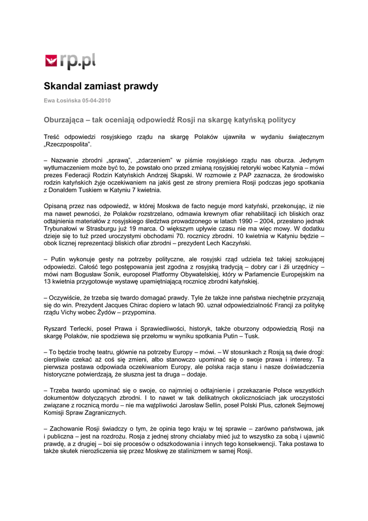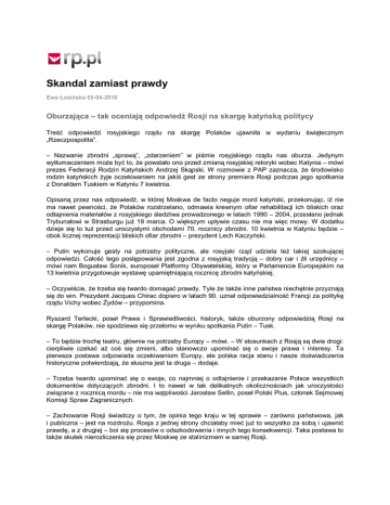 Skandal zamiast prawdy Ewa Łosińska 05-04-2010 Oburzająca – tak oceniają odpowiedź Rosji na skargę katyńską politycy Treść odpowiedzi rosyjskiego rządu na skargę Polaków ujawniła w wydaniu świątecznym „Rzeczpospolita”. – Nazwanie zbrodni „sprawą”, „zdarzeniem” w piśmie rosyjskiego rządu nas oburza. Jedynym wytłumaczeniem może być to, że powstało ono przed zmianą rosyjskiej retoryki wobec Katynia – mówi prezes Federacji Rodzin Katyńskich Andrzej Skąpski. W rozmowie z PAP zaznacza, że środowisko rodzin katyńskich żyje oczekiwaniem na jakiś gest ze strony premiera Rosji podczas jego spotkania z Donaldem Tuskiem w Katyniu 7 kwietnia. Opisaną przez nas odpowiedź, w której Moskwa de facto neguje mord katyński, przekonując, iż nie ma nawet pewności, że Polaków rozstrzelano, odmawia krewnym ofiar rehabilitacji ich bliskich oraz odtajnienia materiałów z rosyjskiego śledztwa prowadzonego w latach 1990 – 2004, przesłano jednak Trybunałowi w Strasburgu już 19 marca. O większym upływie czasu nie ma więc mowy. W dodatku dzieje się to tuż przed uroczystymi obchodami 70. rocznicy zbrodni. 10 kwietnia w Katyniu będzie – obok licznej reprezentacji bliskich ofiar zbrodni – prezydent Lech Kaczyński. – Putin wykonuje gesty na potrzeby polityczne, ale rosyjski rząd udziela też takiej szokującej odpowiedzi. Całość tego postępowania jest zgodna z rosyjską tradycją – dobry car i źli urzędnicy – mówi nam Bogusław Sonik, europoseł Platformy Obywatelskiej, który w Parlamencie Europejskim na 13 kwietnia przygotowuje wystawę upamiętniającą rocznicę zbrodni katyńskiej. – Oczywiście, że trzeba się twardo domagać prawdy. Tyle że także inne państwa niechętnie przyznają się do win. Prezydent Jacques Chirac dopiero w latach 90. uznał odpowiedzialność Francji za politykę rządu Vichy wobec Żydów – przypomina. Ryszard Terlecki, poseł Prawa i Sprawiedliwości, historyk, także oburzony odpowiedzią Rosji na skargę Polaków, nie spodziewa się przełomu w wyniku spotkania Putin – Tusk. – To będzie trochę teatru, głównie na potrzeby Europy – mówi. – W stosunkach z Rosją są dwie drogi: cierpliwie czekać aż coś się zmieni, albo stanowczo upominać się o swoje prawa i interesy. Ta pierwsza postawa odpowiada oczekiwaniom Europy, ale polska racja stanu i nasze doświadczenia historyczne potwierdzają, że słuszna jest ta druga – dodaje. – Trzeba twardo upominać się o swoje, co najmniej o odtajnienie i przekazanie Polsce wszystkich dokumentów dotyczących zbrodni. I to nawet w tak delikatnych okolicznościach jak uroczystości związane z rocznicą mordu – nie ma wątpliwości Jarosław Sellin, poseł Polski Plus, członek Sejmowej Komisji Spraw Zagranicznych. – Zachowanie Rosji świadczy o tym, że opinia tego kraju w tej sprawie – zarówno państwowa, jak i publiczna – jest na rozdrożu. Rosja z jednej strony chciałaby mieć już to wszystko za sobą i ujawnić prawdę, a z drugiej – boi się procesów o odszkodowania i innych tego konsekwencji. Taka postawa to także skutek nierozliczenia się przez Moskwę ze stalinizmem w samej Rosji. – Rosja będzie bronić się w nieskończoność przed trybunałami międzynarodowymi, bo obawia się, że będzie to oznaczać postawienie Rosji jako takiej przed trybunałem, a to może zachwiać jej mocarstwowością. Poza tym boi się milionowych roszczeń – mówił w TVN 24 Jan Malicki, dyrektor Studium Europy Wschodniej Uniwersytetu Warszawskiego. Witomiła Wołk-Jezierska, występująca ze skargą przeciwko Rosji do Strasburga, uważa rosyjską odpowiedź za wyjątkowo arogancką. Jak mówi, od premiera Władimira Putina w Katyniu nie oczekuje niczego. Także dlatego, że nie reagował, kiedy podczas batalii krewnych ofiar NKWD przed moskiewskimi sądami rozstrzelanych Polaków nazywano „sabotażystami i szpiegami”. Premier Rosji ani razu nie potępił takich wypowiedzi.