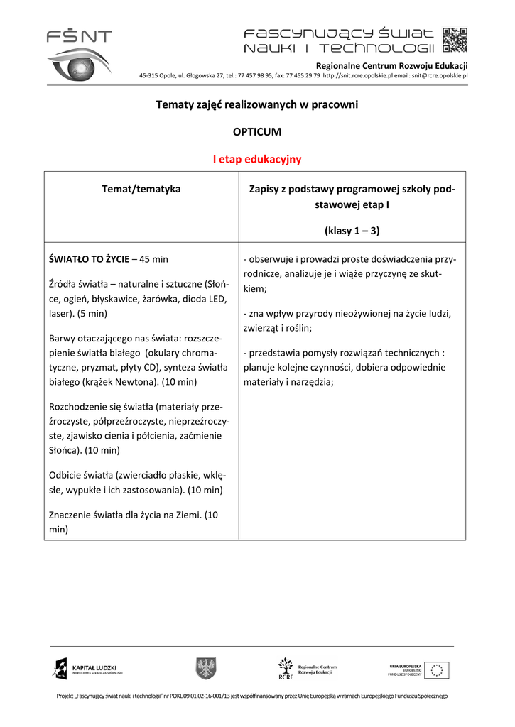 Regionalne Centrum Rozwoju Edukacji 45-315 Opole, ul. Głogowska 27, tel.: 77 457 98 95, fax: 77 455 29 79 http://snit.rcre.opolskie.pl email: [email protected] Tematy zajęć realizowanych w pracowni OPTICUM I etap edukacyjny Temat/tematyka Zapisy z podstawy programowej szkoły podstawowej etap I (klasy 1 – 3) ŚWIATŁO TO ŻYCIE – 45 min Źródła światła – naturalne i sztuczne (Słońce, ogień, błyskawice, żarówka, dioda LED, laser). (5 min) Barwy otaczającego nas świata: rozszczepienie światła białego (okulary chromatyczne, pryzmat, płyty CD), synteza światła białego (krążek Newtona). (10 min) - obserwuje i prowadzi proste doświadczenia przyrodnicze, analizuje je i wiąże przyczynę ze skutkiem; - zna wpływ przyrody nieożywionej na życie ludzi, zwierząt i roślin; - przedstawia pomysły rozwiązań technicznych : planuje kolejne czynności, dobiera odpowiednie materiały i narzędzia; Rozchodzenie się światła (materiały przeźroczyste, półprzeźroczyste, nieprzeźroczyste, zjawisko cienia i półcienia, zaćmienie Słońca). (10 min) Odbicie światła (zwierciadło płaskie, wklęsłe, wypukłe i ich zastosowania). (10 min) Znaczenie światła dla życia na Ziemi. (10 min) Projekt „Fascynujący świat nauki i technologii” nr POKL.09.01.02-16-001/13 jest współfinansowany przez Unię Europejską w ramach Europejskiego Funduszu Społecznego Regionalne Centrum Rozwoju Edukacji 45-315 Opole, ul. Głogowska 27, tel.: 77 457 98 95, fax: 77 455 29 79 http://snit.rcre.opolskie.pl email: [email protected] II etap edukacyjny Temat/tematyka Zapisy z podstawy programowej szkoły podstawowej etap II (klasy 4 – 6) ŚWIATŁO W SŁUŻBIE CZŁOWIEKA – 45 min Odbicie światła. Zwierciadła i ich zastosowania. (10 min) Załamanie światła. Soczewki. (10 min) Oko – powstawanie obrazu, oko krótkowidza i dalekowidza, korekcja wad. (10 min) Niewidzialne zakresy promieniowania – podczerwień i ultrafiolet (detekcja i wykorzystanie). (10 min) Lasery i ich wykorzystanie. (5 min) - uczeń przewiduje przebieg niektórych zjawisk i procesów przyrodniczych, wyjaśnia proste zależności między zjawiskami; przeprowadza obserwacje i doświadczenia według instrukcji, rejestruje ich wyniki w różnej formie oraz je objaśnia używając prawidłowej terminologii; - podaje przykłady przyrządów ułatwiających obserwację przyrody (lupa, mikroskop, lornetka), opisuje ich zastosowanie, posługuje się nimi podczas prowadzonych obserwacji; - bada zjawisko odbicia światła: od zwierciadeł, powierzchni rozpraszających, elementów odblaskowych Str. 2 Projekt „Fascynujący świat nauki i technologii” nr POKL.09.01.02-16-001/13 jest współfinansowany przez Unię Europejską w ramach Europejskiego Funduszu Społecznego