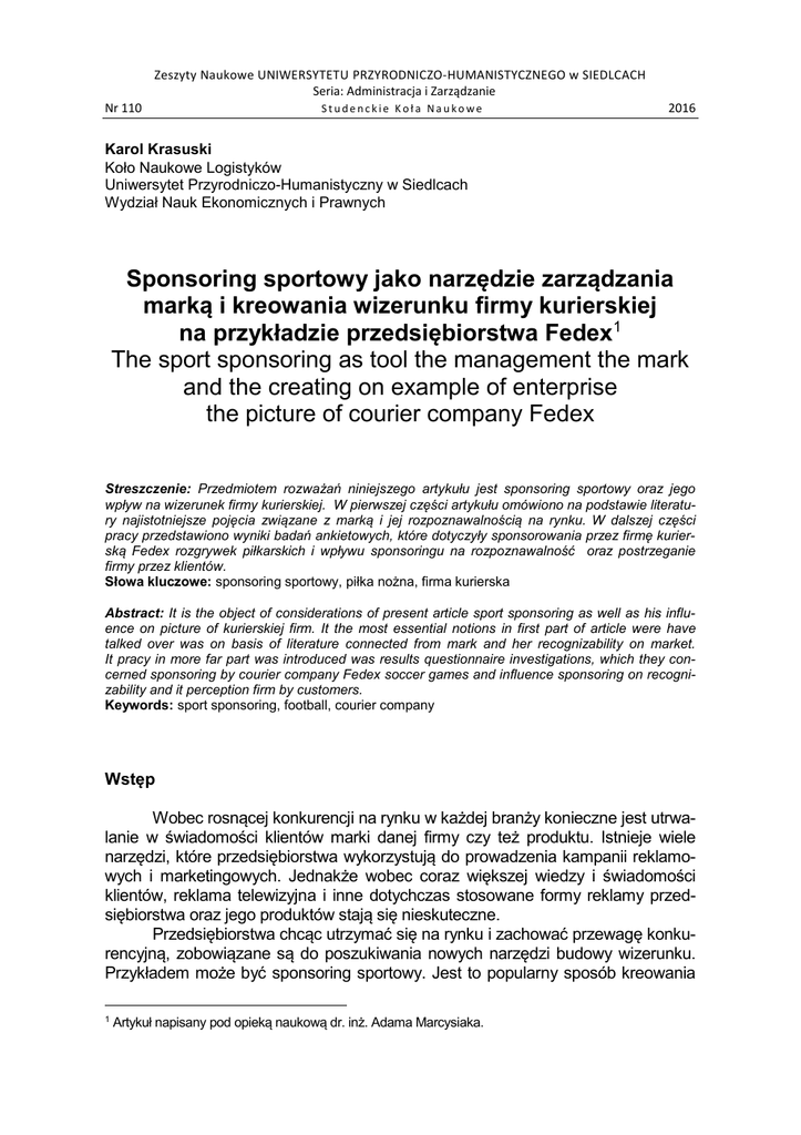 Zeszyty Naukowe UNIWERSYTETU PRZYRODNICZO-HUMANISTYCZNEGO w SIEDLCACH Seria: Administracja i Zarządzanie Nr 110 Studenckie Koła Naukowe 2016 Karol Krasuski Koło Naukowe Logistyków Uniwersytet Przyrodniczo-Humanistyczny w Siedlcach Wydział Nauk Ekonomicznych i Prawnych Sponsoring sportowy jako narzędzie zarządzania marką i kreowania wizerunku firmy kurierskiej na przykładzie przedsiębiorstwa Fedex1 The sport sponsoring as tool the management the mark and the creating on example of enterprise the picture of courier company Fedex Streszczenie: Przedmiotem rozważań niniejszego artykułu jest sponsoring sportowy oraz jego wpływ na wizerunek firmy kurierskiej. W pierwszej części artykułu omówiono na podstawie literatury najistotniejsze pojęcia związane z marką i jej rozpoznawalnością na rynku. W dalszej części pracy przedstawiono wyniki badań ankietowych, które dotyczyły sponsorowania przez firmę kurierską Fedex rozgrywek piłkarskich i wpływu sponsoringu na rozpoznawalność oraz postrzeganie firmy przez klientów. Słowa kluczowe: sponsoring sportowy, piłka nożna, firma kurierska Abstract: It is the object of considerations of present article sport sponsoring as well as his influence on picture of kurierskiej firm. It the most essential notions in first part of article were have talked over was on basis of literature connected from mark and her recognizability on market. It pracy in more far part was introduced was results questionnaire investigations, which they concerned sponsoring by courier company Fedex soccer games and influence sponsoring on recognizability and it perception firm by customers. Keywords: sport sponsoring, football, courier company Wstęp Wobec rosnącej konkurencji na rynku w każdej branży konieczne jest utrwalanie w świadomości klientów marki danej firmy czy też produktu. Istnieje wiele narzędzi, które przedsiębiorstwa wykorzystują do prowadzenia kampanii reklamowych i marketingowych. Jednakże wobec coraz większej wiedzy i świadomości klientów, reklama telewizyjna i inne dotychczas stosowane formy reklamy przedsiębiorstwa oraz jego produktów stają się nieskuteczne. Przedsiębiorstwa chcąc utrzymać się na rynku i zachować przewagę konkurencyjną, zobowiązane są do poszukiwania nowych narzędzi budowy wizerunku. Przykładem może być sponsoring sportowy. Jest to popularny sposób kreowania 1 Artykuł napisany pod opieką naukową dr. inż. Adama Marcysiaka. 308 K. Krasuski wizerunku i utrwalania marki w świadomości klientów. Dzieje się tak, dlatego że społeczeństwo na całym świecie w mniejszym lub większym stopniu interesuje się sportem. Sport kojarzy się ze zdrowiem, sprawnością, rywalizacją, zwycięstwami i wieloma emocjami. Celem artykułu jest ukazanie sponsoringu sportowego jako narzędzia wykorzystywanego do budowy wizerunku i marki firmy kurierskiej. W pracy przedstawiono wyniki badań ankietowych dotyczących firmy Fedex, która jest jednym ze sponsorów piłkarskich rozgrywek Ligi Europy. Pojęcia marki, firmy kurierskiej i sponsoringu sportowego W literaturze istnieje wiele różnych definicji marki. Najprościej można wyjaśnić, że jest to nazwa, znak, termin, symbol, rysunek oraz inne cechy, dzięki którym produkty czy usługi danej firmy wyróżniają się na rynku2. Wobec wysokiej konkurencji na rynku i rosnących oczekiwań klientów konieczne jest, aby dana marka zaistniała w świadomości klientów i pozostała w ich pamięci. Dotyczy to wszystkich firm działających na rynku, bez względu na branżę. Szczególnie widoczne jest to wśród firm kurierskich. Według polskich przepisów prawnych firmy kurierskie to przedsiębiorstwa świadczące usługi, które nie mają charakteru powszechnego. Usługi te polegają na zarobkowym i przyspieszonym przewozie oraz dostarczeniu w gwarantowanym terminie przesyłek3. Do przesyłek, które należy dostarczyć do adresata bezpiecznie i w krótkim czasie zalicza się: dokumenty, nośniki informacji, próbki handlowe, komputery czy też inne niewielkie urządzenia elektroniczne. Ponadto firmy kurierskie mogą wykonywać przewozy ładunków, które wymagają odpowiednich warunków podczas transportu np. zwierząt, roślin czy lekarstw4. Firmy kurierskie zalicza się do przedsiębiorstw z sektora transportu, spedycji i logistyki. Jest to jedna z tych części rynku, które rozwijają się najbardziej dynamicznie. Jednym z elementów, które wspomagają rozwój firmy są działania marketingowe. Wśród firm obserwuje się coraz większe zainteresowanie marketingiem sportowym. Można go zdefiniować jako wciąż rozwijającą się odmianę marketingu, która zawiera takie elementy jak: promocja, reklama, public relations i sponsoring. Jeśli chodzi o definicję sponsoringu to można go określić jako przedsięwzięcie marketingowe, które polega na tym, że sponsor przekazuje na rzecz sponsorowanego określone środki pieniężne, rzeczowe, bądź medialne. Natomiast sponsorowany ma obowiązek odwzajemnić się na rzecz sponsora oczekiwanymi przez niego świadczeniami5. Ponadto sponsor może udzielać wsparcia sponsorowanemu w zamian za tzw. namings right. Najprościej mówiąc jest to prawo marketingowe do nazwy obiektu sportowego. Dzięki temu sponsor udzielający wsparcia finansowego, może umieścić nazwę swojej firmy lub marki w nazwie obiektu sportowego. Przykładem Żurawik B., Żurawik W., Zarządzanie marketingiem w przedsiębiorstwie, PWE, Warszawa 1996, s. 260. Dz.U. z 2003 r. nr 330, poz. 1188. 4 Pliszka M., Rynek usług kurierskich w Polsce, Słupskie Prace Geograficzne 5, Słupsk 2008, s.119. 5 Misiołowski R., Marketing w sporcie, Promotor Wydanie drugie, Warszawa 2008, s. 7. 2 3 Seria: Administracja i Zarządzanie (38) 2016 ZN nr 111 Sponsoring sportowy jako narzędzie zarządzania marką i kreowania wizerunku… 309 takiej formy sponsoringu może być kupienie przez firmę PGE prawa do nazwy stadionu piłkarskiego w Gda