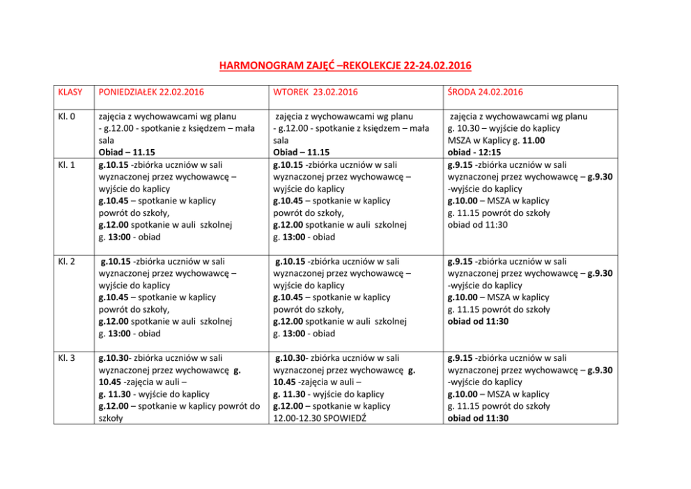 HARMONOGRAM ZAJĘĆ –REKOLEKCJE 22-24.02.2016 KLASY PONIEDZIAŁEK 22.02.2016 WTOREK 23.02.2016 ŚRODA 24.02.2016 Kl. 0 zajęcia z wychowawcami wg planu - g.12.00 - spotkanie z księdzem – mała sala Obiad – 11.15 g.10.15 -zbiórka uczniów w sali wyznaczonej przez wychowawcę – wyjście do kaplicy g.10.45 – spotkanie w kaplicy powrót do szkoły, g.12.00 spotkanie w auli szkolnej g. 13:00 - obiad zajęcia z wychowawcami wg planu - g.12.00 - spotkanie z księdzem – mała sala Obiad – 11.15 g.10.15 -zbiórka uczniów w sali wyznaczonej przez wychowawcę – wyjście do kaplicy g.10.45 – spotkanie w kaplicy powrót do szkoły, g.12.00 spotkanie w auli szkolnej g. 13:00 - obiad zajęcia z wychowawcami wg planu g. 10.30 – wyjście do kaplicy MSZA w Kaplicy g. 11.00 obiad - 12:15 g.9.15 -zbiórka uczniów w sali wyznaczonej przez wychowawcę – g.9.30 -wyjście do kaplicy g.10.00 – MSZA w kaplicy g. 11.15 powrót do szkoły obiad od 11:30 Kl. 2 g.10.15 -zbiórka uczniów w sali wyznaczonej przez wychowawcę – wyjście do kaplicy g.10.45 – spotkanie w kaplicy powrót do szkoły, g.12.00 spotkanie w auli szkolnej g. 13:00 - obiad g.10.15 -zbiórka uczniów w sali wyznaczonej przez wychowawcę – wyjście do kaplicy g.10.45 – spotkanie w kaplicy powrót do szkoły, g.12.00 spotkanie w auli szkolnej g. 13:00 - obiad g.9.15 -zbiórka uczniów w sali wyznaczonej przez wychowawcę – g.9.30 -wyjście do kaplicy g.10.00 – MSZA w kaplicy g. 11.15 powrót do szkoły obiad od 11:30 Kl. 3 g.10.30- zbiórka uczniów w sali wyznaczonej przez wychowawcę g. 10.45 -zajęcia w auli – g. 11.30 - wyjście do kaplicy g.12.00 – spotkanie w kaplicy powrót do szkoły g.10.30- zbiórka uczniów w sali wyznaczonej przez wychowawcę g. 10.45 -zajęcia w auli – g. 11.30 - wyjście do kaplicy g.12.00 – spotkanie w kaplicy 12.00-12.30 SPOWIEDŹ g.9.15 -zbiórka uczniów w sali wyznaczonej przez wychowawcę – g.9.30 -wyjście do kaplicy g.10.00 – MSZA w kaplicy g. 11.15 powrót do szkoły obiad od 11:30 Kl. 1 g.13.00 - obiad Kl. 4 g.10.30- zbiórka uczniów w sali wyznaczonej przez wychowawcę g. 10.45 -zajęcia w auli – g. 11.30 - wyjście do kaplicy g.12.00 – spotkanie w kaplicy powrót do szkoły g.13.00 - obiad Kl. 5 g.12.30 -obiad g.12.45 - zbiórka uczniów w sali wyznaczonej przez wychowawcę – g.13.00 -zajęcia w auli g. 13.40 - wyjście do kaplicy g. 14.00 - spotkanie w kaplicy powrót do szkoły ok.15.00 Kl. 6 g.12.30 -obiad g.12.45 - zbiórka uczniów w sali wyznaczonej przez wychowawcę – g.13.00 -zajęcia w auli g. 13.40 - wyjście do kaplicy g. 14.00 - spotkanie w kaplicy powrót do szkoły ok.15.00 powrót do szkoły g.13.00 - obiad g.10.30- zbiórka uczniów w sali wyznaczonej przez wychowawcę g. 10.45 -zajęcia w auli – g. 11.30 - wyjście do kaplicy g.12.00 – spotkanie w kaplicy 12.00-12.30 SPOWIEDŹ powrót do szkoły g.13.00 - obiad g.12.30 -obiad g.12.45 - zbiórka uczniów w sali wyznaczonej przez wychowawcę – g.13.00 -zajęcia w auli g. 13.40 - wyjście do kaplicy g. 14.00 - spotkanie w kaplicy 14.15-14.45 -SPOWIEDŹ powrót do szkoły ok.15.00 g.12.30 -obiad g.12.45 - zbiórka uczniów w sali wyznaczonej przez wychowawcę – g.13.00 -zajęcia w auli g. 13.40 - wyjście do kaplicy g. 14.00 - spotkanie w kaplicy 14.15-14.45 - SPOWIEDŹ powrót do szkoły ok.15.00 g.9.15 -zbiórka uczniów w sali wyznaczonej przez wychowawcę – g.9.30 -wyjście do kaplicy g.10.00 – MSZA w kaplicy g. 11.15 powrót do szkoły obiad od 11:30 g. 12.00 - obiad g.12.30 -zbiórka uczniów w sali wyznaczonej przez wychowawcę – g.12.30 -wyjście do kaplicy g.13.00 – MSZA w kaplicy powrót do szkoły ok.15.00 obiad od 11:30 g. 12.00 - obiad g.12.30 -zbiórka uczniów w sali wyznaczonej przez wychowawcę – g.12.30 -wyjście do kaplicy g.13.00 – MSZA w kaplicy powrót do szkoły ok.15.00 obiad od 11:30 HARMONOGRAM ZAJĘĆ W DNIACH 22-24.02.2016R. ( DLA UCZNIÓW , KTÓRZY NIE UCZESTNICZĄ W LEKCJACH RELIGII) KLASY 0 1-2 3-4 5-6 GODZINY 12.00 10.00-11.30 11.30- 13.00 10.00-11.30 11.30-13.00 11.00-12.30 12.30-14.00 RODZAJ ZAJĘĆ ZAJĘCIA ŚWIETLICOWE ZAJĘCIA PLASTYCZNE ZAJĘCIA REKREACYJNO-RUCHOWE ZAJĘCIA KOMPUTEROWE ZAJĘCIA REKREACYJNO-RUCHOWE ZAJĘCIA KOMPUTEROWE ZAJĘCIA REKREACYJNO-RUCHOWE MIEJSCE ŚWIETLICA s.40 HALA s.118 HALA s.109 HALA NAUCZYCIEL PROWADZĄCY Nauczyciele świetlicy p. Małgorzata Mularczyk p. Danuta Koczorowska p. Maciej Sekuła p. Artur Klamann p. Janusz Szpejnowski p. Krzysztof Gawłowicz