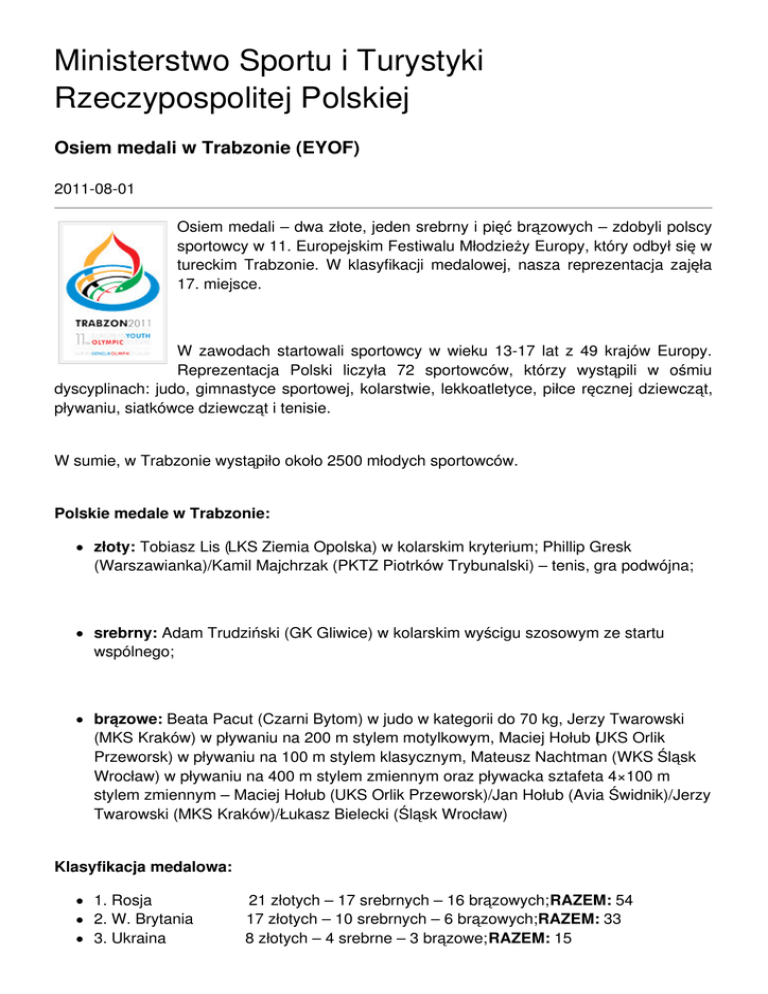 Ministerstwo Sportu i Turystyki Rzeczypospolitej Polskiej Osiem medali w Trabzonie (EYOF) 2011-08-01 Osiem medali – dwa złote, jeden srebrny i pięć brązowych – zdobyli polscy sportowcy w 11. Europejskim Festiwalu Młodzieży Europy, który odbył się w tureckim Trabzonie. W klasyfikacji medalowej, nasza reprezentacja zajęła 17. miejsce. W zawodach startowali sportowcy w wieku 13-17 lat z 49 krajów Europy. Reprezentacja Polski liczyła 72 sportowców, którzy wystąpili w ośmiu dyscyplinach: judo, gimnastyce sportowej, kolarstwie, lekkoatletyce, piłce ręcznej dziewcząt, pływaniu, siatkówce dziewcząt i tenisie. W sumie, w Trabzonie wystąpiło około 2500 młodych sportowców. Polskie medale w Trabzonie: złoty: Tobiasz Lis (LKS Ziemia Opolska) w kolarskim kryterium; Phillip Gresk (Warszawianka)/Kamil Majchrzak (PKTZ Piotrków Trybunalski) – tenis, gra podwójna; srebrny: Adam Trudziński (GK Gliwice) w kolarskim wyścigu szosowym ze startu wspólnego; brązowe: Beata Pacut (Czarni Bytom) w judo w kategorii do 70 kg, Jerzy Twarowski (MKS Kraków) w pływaniu na 200 m stylem motylkowym, Maciej Hołub (UKS Orlik Przeworsk) w pływaniu na 100 m stylem klasycznym, Mateusz Nachtman (WKS Śląsk Wrocław) w pływaniu na 400 m stylem zmiennym oraz pływacka sztafeta 4×100 m stylem zmiennym – Maciej Hołub (UKS Orlik Przeworsk)/Jan Hołub (Avia Świdnik)/Jerzy Twarowski (MKS Kraków)/Łukasz Bielecki (Śląsk Wrocław) Klasyfikacja medalowa: 1. Rosja 2. W. Brytania 3. Ukraina 21 złotych – 17 srebrnych – 16 brązowych; RAZEM: 54 17 złotych – 10 srebrnych – 6 brązowych;RAZEM: 33 8 złotych – 4 srebrne – 3 brązowe; RAZEM: 15 7 złotych – 12 srebrnych – 12 brązowych;RAZEM: 31 6 złotych – 7 srebrnych – 1 brązowy;RAZEM: 14 5 złotych – 3 srebrne – 5 brązowych; RAZEM: 13 4 złote – 12 srebrnych – 8 brązowych;RAZEM: 24 4 złote – 7 srebrnych – 5 brązowych;RAZEM: 16 4 złote – 1 srebrny – 4 brązowe;RAZEM: 9 3 złote – 4 srebrne – 3 brązowe; RAZEM: 10 4. Włochy 5. Rumunia 6. Węgry 7. Niemcy 8. Francja 9. Białoruś 10. Litwa 11. Słowenia 12. Hiszpania 13. Belgia 14. Czechy 15. Szwajcaria 16. Holandia 17. POLSKA 18. Irlandia 19. Szwecja 20. Turcja 3 złote – 3 srebrne – 3 brązowe; RAZEM: 9 3 złote – 0 srebrnych – 2 brązowe;RAZEM: 5 2 złote – 5 srebrnych – 8 brązowych;RAZEM: 15 2 złote – 2 srebrne – 5 brązowych;RAZEM: 9 2 złote – 2 srebrne – 2 brązowe; RAZEM: 6 2 złote – 1 srebrny – 6 brązowych; RAZEM: 9 2 złoty – 1 srebrny – 5 brązowych;RAZEM: 8 2 złote – 1 srebrny – 4 brązowe;RAZEM: 7 2 złote – 1 srebrny – 0 brązowych;RAZEM: 3 2 złote – 0 srebrnych – 7 brązowych;RAZEM: 9 Sklasyfikowano 35 krajów. W historii Europejskich Festiwali Młodzieży Europy, które rozgrywane są od 1991 roku, reprezentanci Polski wywalczyli 96 medali – 25 złotych – 31 srebrnych i 40 brązowych. Kolejna, 12. edycja European Youth Olympic Festival odbędzie się w 2013 roku w Utrechcie.