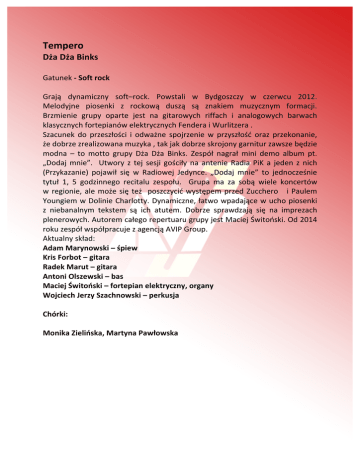 Tempero Dża Dża Binks Gatunek -‐ Soft rock Grają dynamiczny soft–rock. Powstali w Bydgoszczy w czerwcu 2012. Melodyjne piosenki z rockową duszą są znakiem muzycznym formacji. Brzmienie grupy oparte jest na gitarowych riffach i analogowych barwach klasycznych fortepianów elektrycznych Fendera i Wurlitzera . Szacunek do przeszłości i odważne spojrzenie w przyszłość oraz przekonanie, że dobrze zrealizowana muzyka , tak jak dobrze skrojony garnitur zawsze będzie modna – to motto grupy Dża Dża Binks. Zespół nagrał mini demo album pt. „Dodaj mnie”. Utwory z tej sesji gościły na antenie Radia PiK a jeden z nich (Przykazanie) pojawił się w Radiowej Jedynce. „Dodaj mnie” to jednocześnie tytuł 1, 5 godzinnego recitalu zespołu. Grupa ma za sobą wiele koncertów w regionie, ale może się też poszczycić występem przed Zucchero i Paulem Youngiem w Dolinie Charlotty. Dynamiczne, łatwo wpadające w ucho piosenki z niebanalnym tekstem są ich atutem. Dobrze sprawdzają się na imprezach plenerowych. Autorem całego repertuaru grupy jest Maciej Świtoński. Od 2014 roku zespół współpracuje z agencją AVIP Group. Aktualny skład: Adam Marynowski – śpiew Kris Forbot – gitara Radek Marut – gitara Antoni Olszewski – bas Maciej Świtoński – fortepian elektryczny, organy Wojciech Jerzy Szachnowski – perkusja Chórki: Monika Zielińska, Martyna Pawłowska Niektóre koncerty 2013 Klub Eljazz Bydgoszcz – 22.02.2013 Stage Bar Estrada Bydgoszcz – 07.03.2013 Stary Anioł Toruń – 25.04.2013 Estrada Bydgoskiej Starówki – 25.05.2013 Lizard King Toruń -‐ 13.06.2013 Dolina Charlotty (Zucchero) -‐ 14.06.2013 Otwieracz 2013 Różopole Bydgoszcz – 30.06.2013 Otwarcie Mistrzostw Europy w Hokeju na Trawie Gąsawa – 11.07.2013 Dni Piotrkowa Kujawskiego – 28.07.2013 Przyłęki – 15.08.2013 Klub Centrum Bydgoszcz – 16.08.2013 Pożegnanie Lata Różopole – 31.08.2013 Marina Bydgoszcz – 14.09.2013 Demo mini album „Dodaj mnie” 1. Widziałem młode drzewo 2. Zwierciadło 3. Dodaj mnie 4. Porządek uczuć 5. Kołysz mnie 6. Przykazanie 7. Serce i Pięść Kontakt: AVIP Group, www.avip.pl , email: [email protected] tel. +48-‐600 384750 / 743