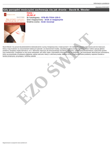Informacje o produkcie Utworzono 03-03-2017 Gdy porządni meżczyźni zachowują się jak dranie - David B. Wexler Cena : 29,90 zł IA T Nr katalogowy : 978-83-7554-159-5 Stan magazynowy : brak w magazynie Średnia ocena : brak recenzji EZ O ŚW David Wexler ma ponad dwudziestoletnie doświadczenie w pracy terapeutycznej z mężczyznami i ich rodzinami. Książka skierowana jest do mężczyzn, którzy mają trudności ze zrozumieniem kobiecych potrzeb i ze stworzeniem trwałej, satysfakcjonującej erotycznej relacji. Autor trafnie opisuje główne problemy związków męsko-damskich, m.in. skłonność mężczyzn do emocjonalnego wycofania, sarkazmu, upokarzania, onieśmielania, wybuchów gniewu oraz niewierności. Znajdziesz w niej cenne wskazówki, jak radzić sobie z potrzebami emocjonalnymi w związkach i jak kontrolować destrukcyjne zachowania, które są przeszkodą w budowaniu głębokiej, pełnej szacunku relacji z ukochaną osobą. Książka mimo, iż porusza trudne problemy napisana została w bardzo przejrzysty, przystępny i wnikliwy sposób Wygenerowano w programie www.oscGold.com