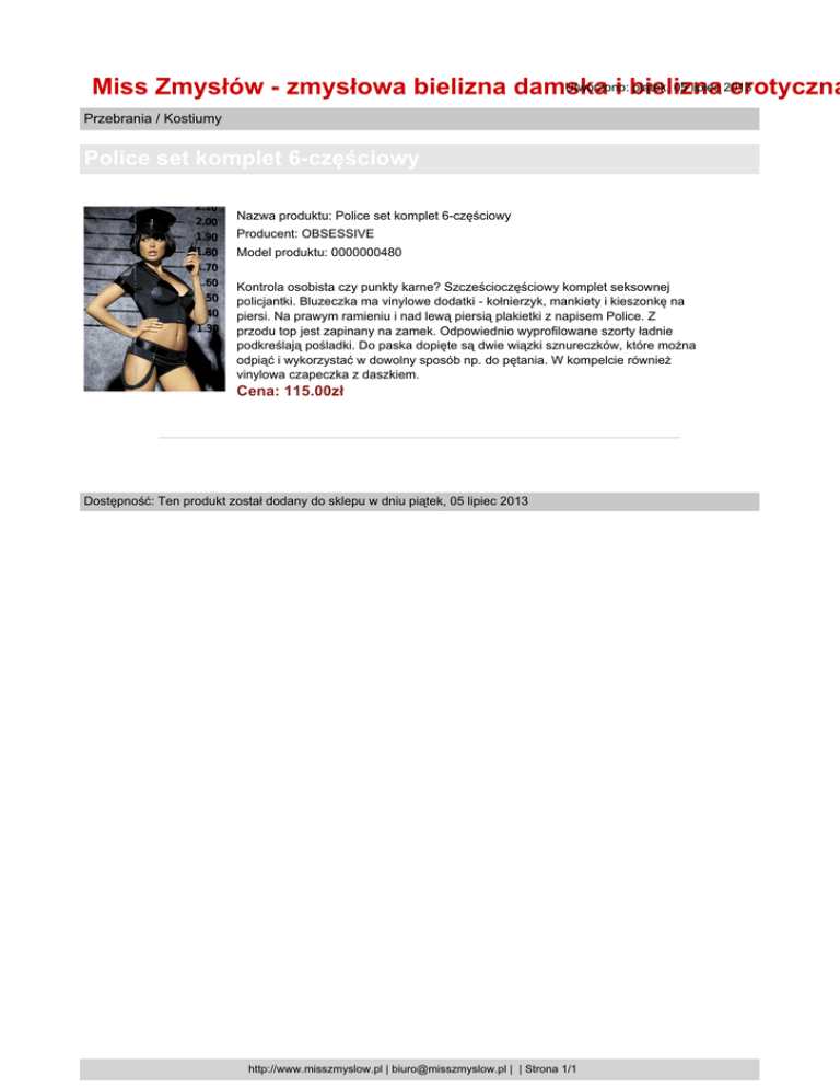 Utworzono: piątek, 05 lipiec 2013 Miss Zmysłów - zmysłowa bielizna damska i bielizna erotyczna Przebrania / Kostiumy Police set komplet 6-częściowy Nazwa produktu: Police set komplet 6-częściowy Producent: OBSESSIVE Model produktu: 0000000480 Kontrola osobista czy punkty karne? Szcześcioczęściowy komplet seksownej policjantki. Bluzeczka ma vinylowe dodatki - kołnierzyk, mankiety i kieszonkę na piersi. Na prawym ramieniu i nad lewą piersią plakietki z napisem Police. Z przodu top jest zapinany na zamek. Odpowiednio wyprofilowane szorty ładnie podkreślają pośladki. Do paska dopięte są dwie wiązki sznureczków, które można odpiąć i wykorzystać w dowolny sposób np. do pętania. W kompelcie również vinylowa czapeczka z daszkiem. Cena: 115.00zł Dostępność: Ten produkt został dodany do sklepu w dniu piątek, 05 lipiec 2013 http://www.misszmyslow.pl | [email protected] | | Strona 1/1