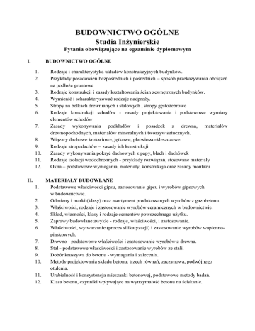 BUDOWNICTWO OGÓLNE Studia Inżynierskie Pytania obowiązujące na egzaminie dyplomowym I. BUDOWNICTWO OGÓLNE 1. 2. 3. 4. 5. 6. 7. 8. 9. 10. 11. 12. II. Rodzaje i charakterystyka układów konstrukcyjnych budynków. Przykłady posadowień bezpośrednich i pośrednich – sposób przekazywania obciążeń na podłoże gruntowe Rodzaje konstrukcji i zasady kształtowania ścian zewnętrznych budynków. Wymienić i scharakteryzować rodzaje nadproży. Stropy na belkach drewnianych i stalowych , stropy gęstożebrowe Rodzaje konstrukcji schodów - zasady projektowania i podstawowe wymiary elementów schodów Zasady wykonywania podkładów i posadzek z drewna, materiałów drewnopochodnych, materiałów mineralnych i tworzyw sztucznych. Wiązary dachowe krokwiowe, jętkowe, płatwiowo-kleszczowe. Rodzaje stropodachów – zasady ich konstrukcji Zasady wykonywania pokryć dachowych z papy, blach i dachówek Rodzaje izolacji wodochronnych - przykłady rozwiązań, stosowane materiały Okna – podstawowe wymagania, materiały, konstrukcja oraz zasady montażu MATERIAŁY BUDOWLANE 1. Podstawowe właściwości gipsu, zastosowanie gipsu i wyrobów gipsowych w budownictwie. 2. Odmiany i marki (klasy) oraz asortyment produkowanych wyrobów z gazobetonu. 3. Właściwości, rodzaje i zastosowanie wyrobów ceramicznych w budownictwie. 4. Skład, własności, klasy i rodzaje cementów powszechnego użytku. 5. Zaprawy budowlane zwykłe - rodzaje, właściwości, i zastosowanie. 6. Właściwości, wytwarzanie (proces silikatyzacji) i zastosowanie wyrobów wapiennopiaskowych. 7. Drewno - podstawowe właściwości i zastosowanie wyrobów z drewna. 8. Stal - podstawowe właściwości i zastosowanie wyrobów ze stali. 9. Dobór kruszywa do betonu - wymagania i zalecenia. 10. Metody projektowania składu betonu: trzech równań, zaczynowa, podwójnego otulenia. 11. Urabialność i konsystencja mieszanki betonowej, podstawowe metody badań. 12. Klasa betonu, czynniki wpływające na wytrzymałość betonu na ściskanie. III. DROGI 1. 2. 3. 4. 5. 6. 7. 8. 9. 10. 11. 12. IV. Podział dróg publicznych na kategorie i odpowiadające im klasy technicznoużytkowe. Wymienić sposoby powierzchniowego odwodnienia dróg (w tym ulic) i placów. Narysować schematy różnych przekrojów poprzecznych rowów drogowych i ścieków. Sposoby odwodnienia wgłębnego korpusu drogi. Narysować schematy drenażu głębokiego korony drogi, drenażu odcinającego, drenażu skarp i podstawy nasypu. Narysować schemat sił działających na pojazd na łuku poziomym drogi i uzasadnić potrzebę stosowania jednostronnych pochyleń poprzecznych jezdni. Wymienić grupy nośności podłoża gruntowego i opisać ich zależność od warunków gruntowo-wodnych. Dopuszczalne naciski osi pojazdów na drogach klasy A i S oraz G, Z, L, D i stanowiskach postojowych Jak ocenić można przekroczenie stanu granicznego nawierzchni drogowej. Narysować schemat konstrukcji nawierzchni asfaltowej na nasypie i wymienić nazwy poszczególnych warstw. Opisać przybliżony skład mieszanki betonu asfaltowego (procentowa zawartość asfaltu i kruszywa o wymiarze < D) do wykonania warstwy podbudowy o grubościach (od,do) w zależności od KRi. Wykorzystywane w warstwach ścieralnych mieszanki SMA o górnym wymiarze grysów D = 5 mm (dla KR 1 ÷ KR 2), D = 8 mm lub D = 11 mm mogą być oznaczane następująco: SMA 11 50/70 Jak można opisać to oznaczenie? Jakie stabilizatory dodawane są do SMA? Długość przerw technologicznych pomiędzy wykonaniem podbudowy, warstwy wiążącej i ścieralnej z betonu asfaltowego Charakterystyczne wytrzymałości na ściskanie osiowe próbek z kruszyw stabilizowanych cementem wg PN-EN 1422-1 KONSTRUKCJE BETONOWE 1. 2. 3. Wytrzymałość na ściskanie i klasy wytrzymałości betonu. Zależność naprężenie-odkształcenie betonu przy ściskaniu stosowana do obliczania nośności granicznej przekroju. Podstawowe założenia do obliczania nośności przekrojów obciążonych momentem zginającym. 4. 5. 6. 7. 8. 9. 10. 11. 12. V. Minimalne i maksymalne zbrojenie podłużne w belkach i płytach żelbetowych. Nośność na ścinanie elementów żelbetowych. Podać ogólne zasady sprawdzania stanu granicznego zarysowania w konstrukcjach żelbetowych. Podać ogólne zasady sprawdzania stanu granicznego ugięć w konstrukcjach żelbetowych. Zasady rozmieszczania zbrojenia w prostokątnych płytach krzyżowo zbrojonych przy swobodnie podpartych i zamocowanych krawędziach. Zbrojenie podłużne i zbrojenie poprzeczne w słupie. Wymiarowanie stopy fundamentowej obciążonej osiowo na zginanie i przebicie. Rozkład sił wewnętrznych w słupie ściskanym na małym mimośrodzie w SGN. Rozkład sił wewnętrznych w słupie ściskanym na dużym mimośrodzie w SGN. MECHANIKA BUDOWLI 1. 2. 3. 4. 5. 6. 7. 8. 9. Podać zasady obliczania przemieszczeń w układach prętowych liniowo-sprężystych w przypadku oddziaływań statycznych (wzór Maxwella-Mohra). Podać zasady obliczania przemieszczeń w układach prętowych liniowo-sprężystych w przypadku oddziaływań geometrycznych (wzór Maxwella-Mohra). Podać zasady obliczania przemieszczeń w układach prętowych liniowo-sprężystych w przypadku obciążenia temperaturą (wzór Maxwella-Mohra). Podać podstawowe założenia i tok postępowania przy obliczeniach układów prętowych metodą sił w przypadku oddziaływań statycznych (zilustrować to odpowiednimi rysunkami). Podać podstawowe założenia i tok postępowania przy obliczeniach układów prętowych metodą sił w przypadku oddziaływań geometrycznych i obciążenia temperaturą (zilustrować to odpowiednimi rysunkami). Podać podstawowe założenia i tok postępowania przy obliczeniach układów prętowych metodą przemieszczeń w przypadku oddziaływań statycznych (zilustrować to odpowiednimi rysunkami). Podać podstawowe założenia i tok postępowania przy obliczeniach układów prętowych metodą przemieszczeń w przypadk