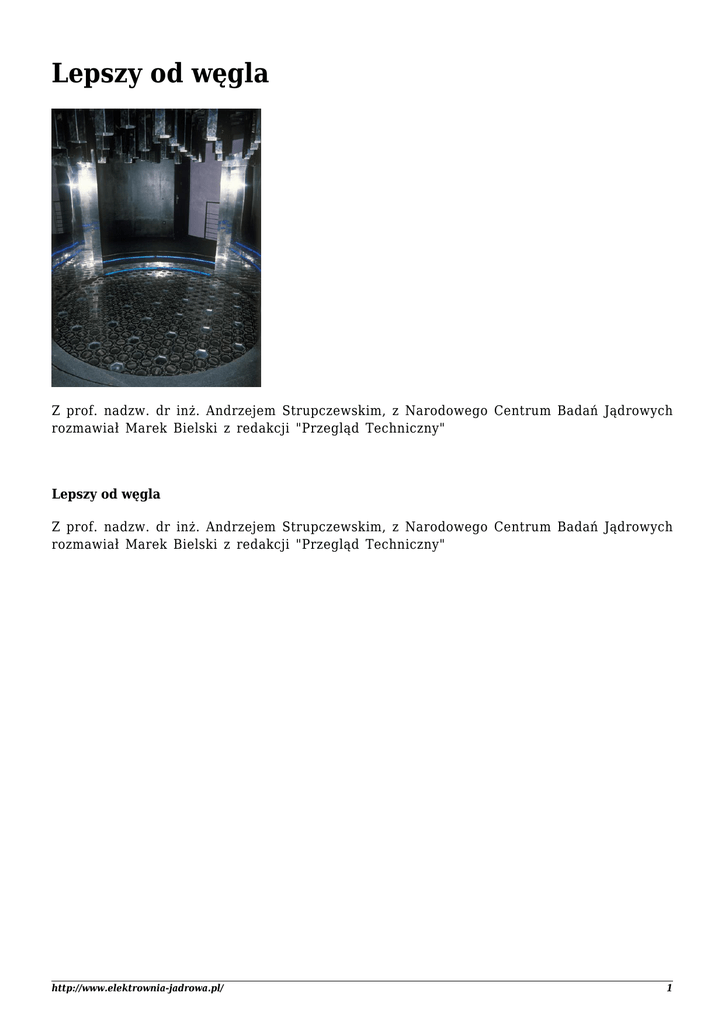 Lepszy od węgla Z prof. nadzw. dr inż. Andrzejem Strupczewskim, z Narodowego Centrum Badań Jądrowych rozmawiał Marek Bielski z redakcji "Przegląd Techniczny" Lepszy od węgla Z prof. nadzw. dr inż. Andrzejem Strupczewskim, z Narodowego Centrum Badań Jądrowych rozmawiał Marek Bielski z redakcji "Przegląd Techniczny" http://www.elektrownia-jadrowa.pl/ 1 Głównym argumentem przeciwko budowie elektrowni jądrowych w Polsce są wysokie nakłady inwestycyjne, przytaczane w dyskusjach przez organizacje antynuklearne, które chcą udowodnić, że „energetyka jądrowa jest nieopłacalna”. Tymczasem zalety gospodarcze wprowadzania energetyki jądrowej są niepodważalne. Sytuacja ekonomiczna energetyki jądrowej jest sprawą złożoną i nie ogranicza się do samej wysokości nakładów inwestycyjnych. Chociaż są one znaczne, energetyka jądrowa jest opłacalna dla społeczeństwa, bo koszty paliwowe są bardzo niskie. Ci, których stać na wysiłek finansowy, by zbudować elektrownie jądrowe, cieszą się potem tanią energią elektryczną przez wiele dziesiątków lat, w przypadku reaktorów II generacji – od 40 do 60 lat, w przypadku generacji III – przez 60 lat i dłużej. Argument z portfela Dzięki elektrowniom jądrowym opłaty za energię elektryczną we Francji należą do najniższych w Unii Europejskiej, podczas gdy w krajach bez energetyki jądrowej, jak Dania czy Włochy, ceny są najwyższe. W Polsce podawane w euro ceny są niewiele wyższe niż we Francji, ale po uwzględnieniu siły nabywczej, okazują się jednak bardzo wysokie. A wobec perspektywy wprowadzenia dodatkowego podatku od emisji CO2, prognozy dla Polski są złe – gdy ponad 90% produkcji energii elektrycznej pochodzić będzie ze spalania węgla, wpływ podatku od CO2 będzie u nas znacznie większy niż w innych krajach europejskich. Wszyscy wiemy, że Polska „na węglu stoi”, ale fakt, że w UE dominującym źródłem elektryczności jest energia jądrowa, nie jest już powszechnie znany. Jeśli nie chcemy ponosić strat przy kolejnych decyzjach UE korzystnych dla krajów o małej emisji CO2, musimy przestawić krajową energetykę i na miejsce części spalanego do tej pory węgla kamiennego i brunatnego wprowadzić moce z elektrowni jądrowych. Oszczędzajmy Czarne Złoto Dodatkowym powodem wprowadzania energetyki jądrowej jest potrzeba dywersyfikacji źródeł http://www.elektrownia-jadrowa.pl/ 2 dostaw paliwa. Już obecnie Polska stała się importerem węgla netto, a w perspektywie 30 lat grozi nam jego brak. Jak stwierdza E. Sobczyk z Instytutu Gospodarki Surowcami Mineralnymi i Energią PAN – zasoby przemysłowe węgla kamiennego wg stanu na koniec 2006 r. wynosiły 5 mld t. Zasoby operatywne, czyli zasoby przemysłowe pomniejszone o przewidywane straty, są jednak mniejsze. Wielkość zasobów operatywnych węgla energetycznego i koksowego w kopalniach czynnych na koniec 2006 r. wynosiła 3 mld t. Przy założeniu wydobycia na poziomie 100 mln t rocznie, wystarczalność zasobów węgla wynosi ok. 30 lat. Podobnie jak ropa naftowa i gaz ziemny, jest to cenny surowiec dla chemii. Dlatego spalanie węgla jest grzechem popełnianym wobec naszych wnuków – skąd będą brać podstawowy materiał dla wszystkich procesów chemii organicznej? Węgiel jest częścią dziedzictwa, które otrzymaliśmy w spadku od poprzednich pokoleń i które powinniśmy pozostawić naszym prawnukom. Natomiast uran jest nieprzydatny do niczego, poza rozszczepieniem i wytwarzaniem w ten sposób energii. Wykorzystując go w reaktorach jądrowych, robimy to samo, co zrobią z nim nasze wnuki i prawnuki. Mamy więc moralne prawo zużywać uran, zwłaszcza że jego zasoby, przy efektywnym wykorzystaniu wystarczą o wiele dłużej niż paliwa kopalne. Reasumując, można skonstatować, że głównym powodem, dla którego powinniśmy w Polsce wprowadzić energetykę jądrową, jest jej konkurencyjność ekonomiczna i ekologiczna. Opiera się ona na wysokim współczynniku wykorzystania mocy zainstalowanej przekraczającym 90%, na braku emisji CO2 z elektrowni jądrowej oraz na niskich i stabilnych kosztach paliwa. Konsekwentnie do końca Rozwój energetyki jądrowej w naszym kraju jest konieczny, inaczej będziemy cierpieć na braki energii i odczuwać boleśnie zwyżki jej ceny. Ale najgorsze, co mogłoby nas spotkać, to zbudowanie elektrowni jądrowej, uwięzienie w niej kapitału, od którego trzeba spłacać odsetki, a potem długotrwały przestój w jej uruchomieniu, spowodowany sporami z organizacjami antynuklearnymi. Zgodnie z doświadczeniem światowym, wszelkie dyskusje trzeba przeprowadzać przed podjęciem decyzji rządowych i rozpoczęciem budowy, a prawodawstwo ustalić takie, by zezwolenia udzielane w chwili rozpoczęcia budowy dawały gwarancję pomyślnego uruchomienia elektrowni zbudowanej zgodnie z warunkami licencji. Jesteśmy w szczęśliwym położeniu, ponieważ reaktory III generacji, jakie zamierzamy budować, są naprawdę czyste i bezpieczne. Ale musimy być konsekwentni: gdy już zaangażujemy miliardy euro, trzeba doprowadzić budowę do końca. Jest to możliwe – wystarczy wziąć przykład z Czechów lub Słowaków. Dzisiaj elektrownie jądrowe w Czechach lub na Słowacji dają energię taniej niż inne źródła nie brudzą okolicy, a ich bezpieczeństwo zostało udowodnione. Polacy potrafią pracować skutecznie w przemyśle nuklearnym w innych krajach, miejmy nadzieję, że w następnej dekadzie będziemy mogli powiedzieć, że potrafimy też dobrze pracować i u siebie. Opłacalność energetyki jądrowej potwierdzają wyniki studium ekonomicznego wykonanego przez Massachusettes Institute of Technology. Przyjęto w nim konserwatywne założenia: czas pracy elektrowni jądrowej 40 lat (w rzeczywistości pracują 60 lat) i współczynnik obciążenia 0,85 (dla reaktora EPR przewiduje się 92%), sprawność cieplną 0,33 (dla reaktora EPR wynosi on 36%), bezpośrednie nakł