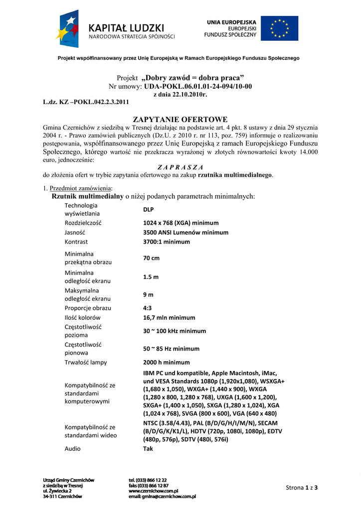 Projekt „Dobry zawód = dobra praca” Nr umowy: UDA-POKL.06.01.01-24-094/10-00 z dnia 22.10.2010r. L.dz. KZ –POKL.042.2.3.2011 ZAPYTANIE OFERTOWE Gmina Czernichów z siedzibą w Tresnej działając na podstawie art. 4 pkt. 8 ustawy z dnia 29 stycznia 2004 r. - Prawo zamówień publicznych (Dz.U. z 2010 r. nr 113, poz. 759) informuje o realizowaniu postępowania, współfinansowanego przez Unię Europejską z ramach Europejskiego Funduszu Społecznego, którego wartość nie przekracza wyrażonej w złotych równowartości kwoty 14.000 euro, jednocześnie: ZAPRASZA do złożenia ofert w trybie zapytania ofertowego na zakup rzutnika multimedialnego. 1. Przedmiot zamówienia: Rzutnik multimedialny o niżej podanych parametrach minimalnych: Technologia wyświetlania Rozdzielczość Jasność Kontrast Minimalna przekątna obrazu Minimalna odległość ekranu Maksymalna odległość ekranu Proporcje obrazu Ilość kolorów Częstotliwość pozioma Częstotliwość pionowa Trwałość lampy Kompatybilność ze standardami komputerowymi Kompatybilność ze standardami wideo Audio DLP 1024 x 768 (XGA) minimum 3500 ANSI Lumenów minimum 3700:1 minimum 70 cm 1.5 m 9 m 4:3 16,7 mln minimum 30 ~ 100 kHz minimum 50 ~ 85 Hz minimum 2000 h minimum IBM PC und kompatible, Apple Macintosh, iMac, und VESA Standards 1080p (1,920x1,080), WSXGA+ (1,680 x 1,050), WXGA+ (1,440 x 900), WXGA (1,280 x 800, 1,280 x 768), UXGA (1,600 x 1,200), SXGA+ (1,400 x 1,050), SXGA (1,280 x 1,024), XGA (1,024 x 768), SVGA (800 x 600), VGA (640 x 480) NTSC (3.58/4.43), PAL (B/D/G/H/I/M/N), SECAM (B/D/G/K/K1/L), HDTV (720p, 1080i, 1080p), EDTV (480p, 576p), SDTV (480i, 576i) Tak Strona 1 z 3 Złącza wejścia / wyjścia HDMI DVI‐I D‐SUB 15pin in (VGA) D‐SUB 15pin out (VGA) Cinch‐Video S‐Video RS232 USB Typ B 3,5 mm Mini Jack Waga 5 kg maximum Wspólny Słownik Zamówień (CPV): 38652100-1 – projektor multimedialny Kryterium oceny ofert: najniższa cena 2. Miejsce i termin realizacji zamówienia: dostawa na koszt Zamawiającego. 3. Dokumenty wymagane od Wykonawcy: formularz ofertowy stanowiący załącznik nr 1 do niniejszego zapytania, 4. Miejsce i termin składania ofert: Ofertę należy złożyć do dnia 25 lutego 2011 r. do godz.15,30 w zamkniętej kopercie z opisem: „Oferta – rzutnik multimedialny”. Ofertę można przesłać pocztą lub złożyć osobiście w Urzędzie Gminy Czernichów z siedzibą w Tresnej ul. Żywiecka 2, 34-311 Czernichów. Ofertę można również przesłać w formie elektronicznej na adres: [email protected] lub faksem na nr 33/866-12-87. 5. Osoba uprawniona do kontaktów: Katarzyna Dudziak – koordynator projektu, tel. 33/866-12-94 wew.117 lub 606 366 606 Wójt Gminy Czernichów Adam Kos Strona 2 z 3 Załącznik nr 1 do zapytania ofertowego ……………………………… Nazwa i adres oferenta ……………………, dnia …………… Gmina Czernichów z siedziba w Tresnej ul. Żywiecka 2 34-311 Czernichów FORMULARZ OFERTOWY W odpowiedzi na zaproszenie do złożenia oferty na zakup rzutnika multimedialnego, w ramach realizacji projektu „Dobry zawód = dobra praca”, współfinansowanego przez Unię Europejską z ramach Europejskiego Funduszu Społecznego, oferuję rzutnik multimedialny ……………………………………. za kwotę: netto: …………………. zł + VAT ……………. = brutto ……………….….. zł. Oświadczam, że oferowany rzutnik spełnia wszystkie wymogi zawarte w zapytaniu ofertowym. …………………………………… (podpis oferenta) Strona 3 z 3