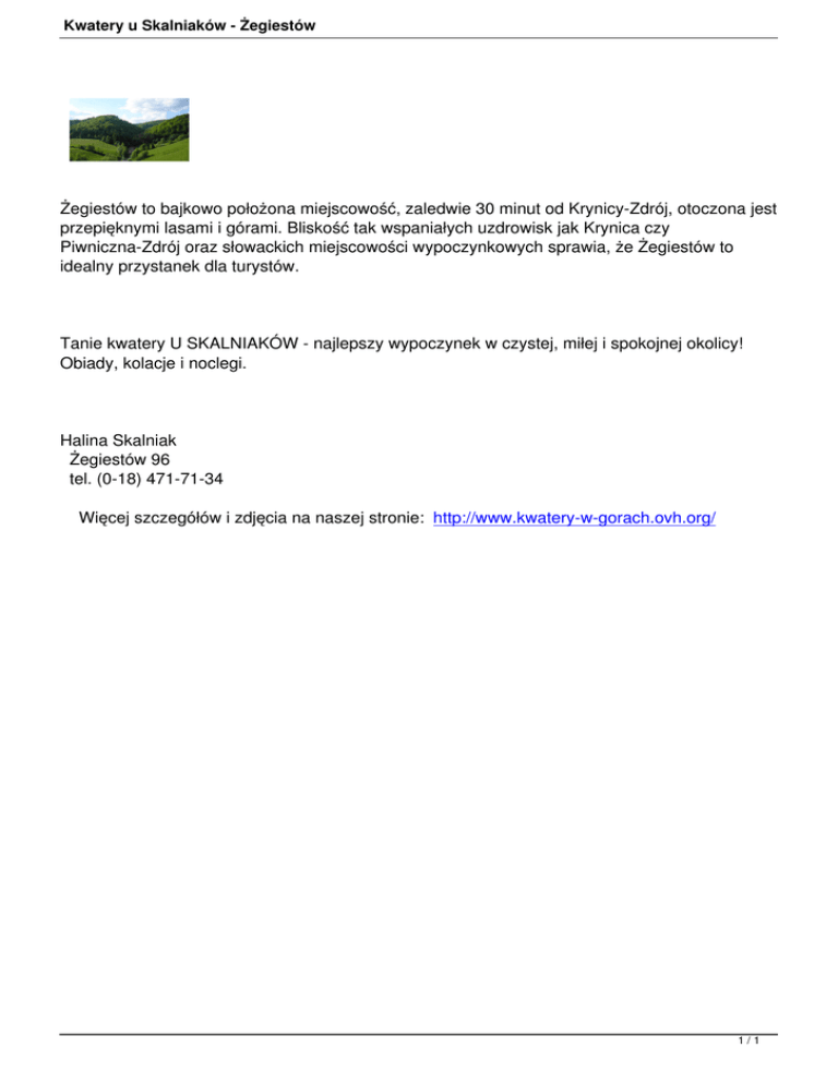 Kwatery u Skalniaków - Żegiestów Żegiestów to bajkowo położona miejscowość, zaledwie 30 minut od Krynicy-Zdrój, otoczona jest przepięknymi lasami i górami. Bliskość tak wspaniałych uzdrowisk jak Krynica czy Piwniczna-Zdrój oraz słowackich miejscowości wypoczynkowych sprawia, że Żegiestów to idealny przystanek dla turystów. Tanie kwatery U SKALNIAKÓW - najlepszy wypoczynek w czystej, miłej i spokojnej okolicy! Obiady, kolacje i noclegi. Halina Skalniak Żegiestów 96 tel. (0-18) 471-71-34 Więcej szczegółów i zdjęcia na naszej stronie: http://www.kwatery-w-gorach.ovh.org/ 1/1
