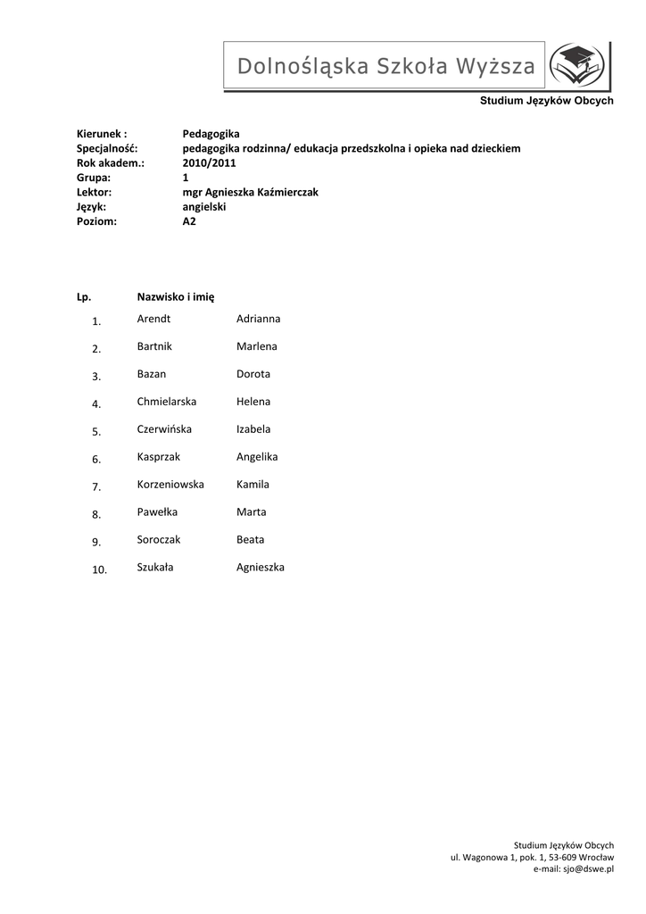 Studium Języków Obcych Kierunek : Specjalność: Rok akadem.: Grupa: Lektor: Język: Poziom: Lp. Pedagogika pedagogika rodzinna/ edukacja przedszkolna i opieka nad dzieckiem 2010/2011 1 mgr Agnieszka Kaźmierczak angielski A2 Nazwisko i imię 1. Arendt Adrianna 2. Bartnik Marlena 3. Bazan Dorota 4. Chmielarska Helena 5. Czerwińska Izabela 6. Kasprzak Angelika 7. Korzeniowska Kamila 8. Pawełka Marta 9. Soroczak Beata 10. Szukała Agnieszka Studium Języków Obcych ul. Wagonowa 1, pok. 1, 53-609 Wrocław e-mail: [email protected] Studium Języków Obcych Kierunek : Specjalność: Rok akadem.: Grupa: Lektor: Język: Poziom: Lp. Pedagogika pedagogika rodzinna/ edukacja przedszkolna i opieka nad dzieckiem 2010/2011 2 mgr Anna Jarocha angielski A2/B1 Nazwisko i imię 1. Bogdał Anna 2. Boniek Paula 3. Chabior Magdalena 4. Duda Klaudia 5. Kępka Monika 6. Kulmatycka Justyna 7. Kuriata Maria 8. Łozińska Magdalena 9. Markiewicz Paula 10. Nowicka Natalia 11. Tarasiuk Sabina 12. Walenczak Ewelina 13. Weremkowicz Patrycja Studium Języków Obcych ul. Wagonowa 1, pok. 1, 53-609 Wrocław e-mail: [email protected] Studium Języków Obcych Kierunek : Specjalność: Rok akadem.: Grupa: Lektor: Język: Poziom: Lp. Pedagogika pedagogika rodzinna/ edukacja przedszkolna i opieka nad dzieckiem 2010/2011 4 mgr Beata Janczewska niemiecki A2 Nazwisko i imię 1. Barnaś Daria 2. Borowska Julianna 3. Chrzanowska Karolina 4. Czuba Anna 5. Góralska Renata 6. Hofman Katarzyna 7. Laska Anna 8. Nowakowska Klaudia 9. Poss Agnieszka 10. Śmichura Marzena 11. Witaszczyk Paulina 12. Wójcik Katarzyna Studium Języków Obcych ul. Wagonowa 1, pok. 1, 53-609 Wrocław e-mail: [email protected] Studium Języków Obcych Kierunek : Specjalność: Rok akadem.: Grupa: Lektor: Język: Poziom: Lp. Pedagogika pedagogika rodzinna/ edukacja przedszkolna i opieka nad dzieckiem 2010/2011 3 mgr Paulina Rogulska angielski B1 Nazwisko i imię 1. Chwałek Edyta 2. Hejduk Roksana 3. Juszczak Marta 4. Kalinowska Patrycja 5. Kucharczyk Agata 6. Łukowska Joanna 7. Matujza Dominika 8. Perkowska Iwona 9. Waloch Marzena Studium Języków Obcych ul. Wagonowa 1, pok. 1, 53-609 Wrocław e-mail: [email protected] Studium Języków Obcych Uwaga Osoby, które pisały test poziomujący z języka rosyjskiego, proszone są o dopisanie się do grupy języka angielskiego lub niemieckiego (na podstawie rozmowy przeprowadzonej z lektorem, prowadzącym daną grupę) Studium Języków Obcych ul. Wagonowa 1, pok. 1, 53-609 Wrocław e-mail: [email protected]