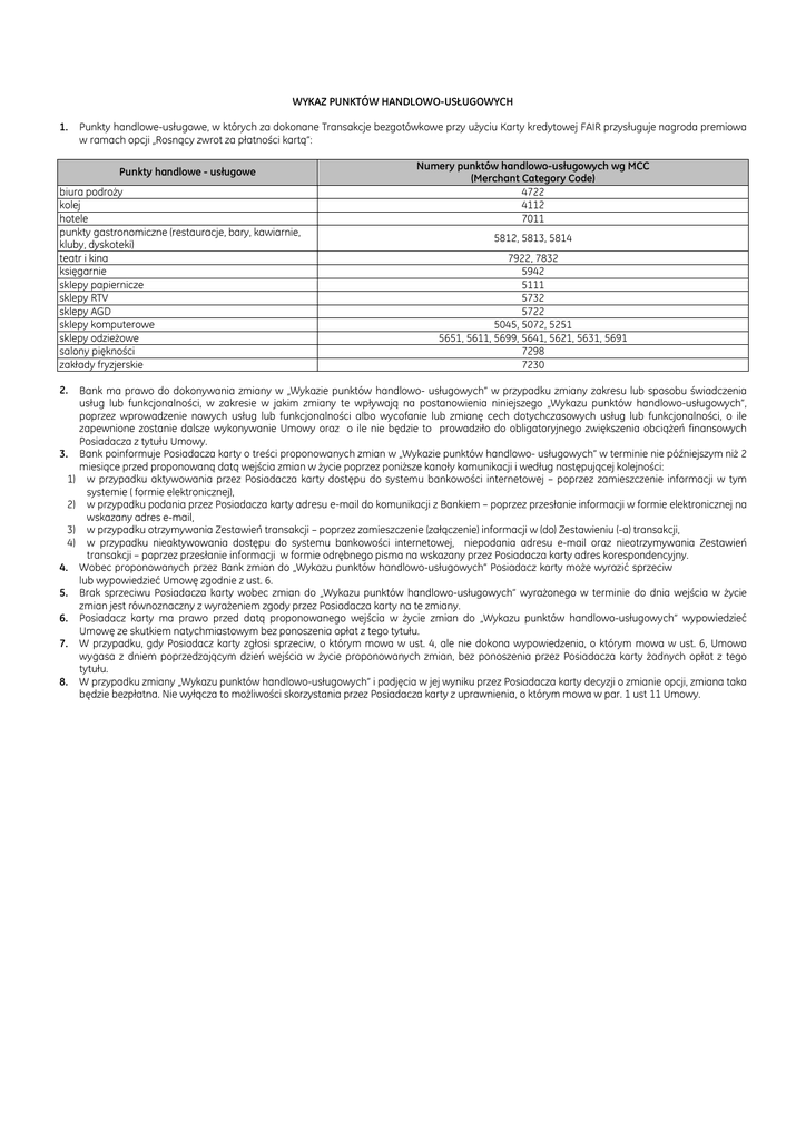 WYKAZ PUNKTÓW HANDLOWO-USŁUGOWYCH 1. Punkty handlowe-usługowe, w których za dokonane Transakcje bezgotówkowe przy użyciu Karty kredytowej FAIR przysługuje nagroda premiowa w ramach opcji „Rosnący zwrot za płatności kartą”: Punkty handlowe - usługowe biura podroży kolej hotele punkty gastronomiczne (restauracje, bary, kawiarnie, kluby, dyskoteki) teatr i kina księgarnie sklepy papiernicze sklepy RTV sklepy AGD sklepy komputerowe sklepy odzieżowe salony piękności zakłady fryzjerskie 2. 3. 1) 2) 3) 4) 4. 5. 6. 7. 8. Numery punktów handlowo-usługowych wg MCC (Merchant Category Code) 4722 4112 7011 5812, 5813, 5814 7922, 7832 5942 5111 5732 5722 5045, 5072, 5251 5651, 5611, 5699, 5641, 5621, 5631, 5691 7298 7230 Bank ma prawo do dokonywania zmiany w „Wykazie punktów handlowo- usługowych” w przypadku zmiany zakresu lub sposobu świadczenia usług lub funkcjonalności, w zakresie w jakim zmiany te wpływają na postanowienia niniejszego „Wykazu punktów handlowo-usługowych”, poprzez wprowadzenie nowych usług lub funkcjonalności albo wycofanie lub zmianę cech dotychczasowych usług lub funkcjonalności, o ile zapewnione zostanie dalsze wykonywanie Umowy oraz o ile nie będzie to prowadziło do obligatoryjnego zwiększenia obciążeń finansowych Posiadacza z tytułu Umowy. Bank poinformuje Posiadacza karty o treści proponowanych zmian w „Wykazie punktów handlowo- usługowych” w terminie nie późniejszym niż 2 miesiące przed proponowaną datą wejścia zmian w życie poprzez poniższe kanały komunikacji i według następującej kolejności: w przypadku aktywowania przez Posiadacza karty dostępu do systemu bankowości internetowej – poprzez zamieszczenie informacji w tym systemie ( formie elektronicznej), w przypadku podania przez Posiadacza karty adresu e-mail do komunikacji z Bankiem – poprzez przesłanie informacji w formie elektronicznej na wskazany adres e-mail, w przypadku otrzymywania Zestawień transakcji – poprzez zamieszczenie (załączenie) informacji w (do) Zestawieniu (-a) transakcji, w przypadku nieaktywowania dostępu do systemu bankowości internetowej, niepodania adresu e-mail oraz nieotrzymywania Zestawień transakcji – poprzez przesłanie informacji w formie odrębnego pisma na wskazany przez Posiadacza karty adres korespondencyjny. Wobec proponowanych przez Bank zmian do „Wykazu punktów handlowo-usługowych” Posiadacz karty może wyrazić sprzeciw lub wypowiedzieć Umowę zgodnie z ust. 6. Brak sprzeciwu Posiadacza karty wobec zmian do „Wykazu punktów handlowo-usługowych” wyrażonego w terminie do dnia wejścia w życie zmian jest równoznaczny z wyrażeniem zgody przez Posiadacza karty na te zmiany. Posiadacz karty ma prawo przed datą proponowanego wejścia w życie zmian do „Wykazu punktów handlowo-usługowych” wypowiedzieć Umowę ze skutkiem natychmiastowym bez ponoszenia opłat z tego tytułu. W przypadku, gdy Posiadacz karty zgłosi sprzeciw, o którym mowa w ust. 4, ale nie dokona wypowiedzenia, o którym mowa w ust. 6, Umowa wygasa z dniem poprzedzającym dzień wejścia w życie proponowanych zmian, bez ponoszenia przez Posiadacza karty żadnych opłat z tego tytułu. W przypadku zmiany „Wykazu punktów handlowo-usługowych” i podjęcia w jej wyniku przez Posiadacza karty decyzji o zmianie opcji, zmiana taka będzie bezpłatna. Nie wyłącza to możliwości skorzystania przez Posiadacza karty z uprawnienia, o którym mowa w par. 1 ust 11 Umowy.