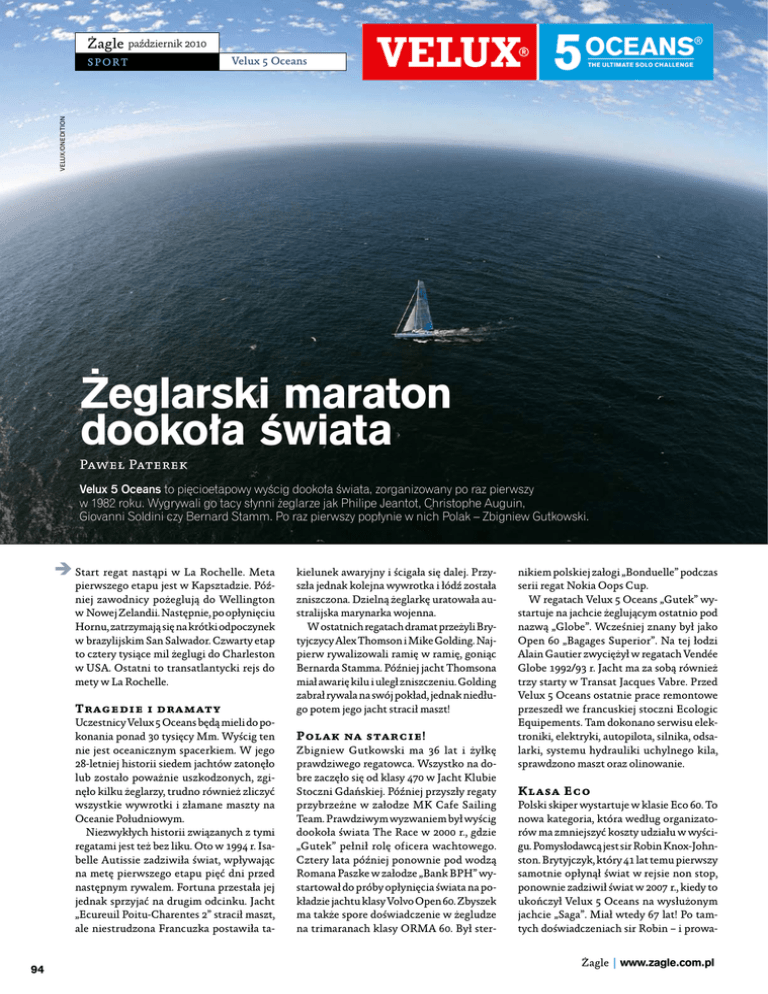 Żagle październik 2010 Velux 5 Oceans velux/onEdition sport Żeglarski maraton dookoła świata Paweł Paterek Velux 5 Oceans to pięcioetapowy wyścig dookoła świata, zorganizowany po raz pierwszy w 1982 roku. Wygrywali go tacy słynni żeglarze jak Philipe Jeantot, Christophe Auguin, Giovanni Soldini czy Bernard Stamm. Po raz pierwszy popłynie w nich Polak – Zbigniew Gutkowski. Start regat nastąpi w La Rochelle. Meta pierwszego etapu jest w Kapsztadzie. Później zawodnicy pożeglują do Wellington w Nowej Zelandii. Następnie, po opłynięciu Hornu, zatrzymają się na krótki odpoczynek w brazylijskim San Salwador. Czwarty etap to cztery tysiące mil żeglugi do Charleston w USA. Ostatni to transatlantycki rejs do mety w La Rochelle. Tragedie i dramaty Uczestnicy Velux 5 Oceans będą mieli do pokonania ponad 30 tysięcy Mm. Wyścig ten nie jest oceanicznym spacerkiem. W jego 28-letniej historii siedem jachtów zatonęło lub zostało poważnie uszkodzonych, zginęło kilku żeglarzy, trudno również zliczyć wszystkie wywrotki i złamane maszty na Oceanie Południowym. Niezwykłych historii związanych z tymi regatami jest też bez liku. Oto w 1994 r. Isabelle Autissie zadziwiła świat, wpływając na metę pierwszego etapu pięć dni przed następnym rywalem. Fortuna przestała jej jednak sprzyjać na drugim odcinku. Jacht „Ecureuil Poitu-Charentes 2” stracił maszt, ale niestrudzona Francuzka postawiła ta94 kielunek awaryjny i ścigała się dalej. Przyszła jednak kolejna wywrotka i łódź została zniszczona. Dzielną żeglarkę uratowała australijska marynarka wojenna. W ostatnich regatach dramat przeżyli Brytyjczycy Alex Thomson i Mike Golding. Najpierw rywalizowali ramię w ramię, goniąc Bernarda Stamma. Później jacht Thomsona miał awarię kilu i uległ zniszczeniu. Golding zabrał rywala na swój pokład, jednak niedługo potem jego jacht stracił maszt! Polak na starcie! Zbigniew Gutkowski ma 36 lat i żyłkę prawdziwego regatowca. Wszystko na dobre zaczęło się od klasy 470 w Jacht Klubie Stoczni Gdańskiej. Później przyszły regaty przybrzeżne w załodze MK Cafe Sailing Team. Prawdziwym wyzwaniem był wyścig dookoła świata The Race w 2000 r., gdzie „Gutek” pełnił rolę oficera wachtowego. Cztery lata później ponownie pod wodzą Romana Paszke w załodze „Bank BPH” wystartował do próby opłynięcia świata na pokładzie jachtu klasy Volvo Open 60. Zbyszek ma także spore doświadczenie w żegludze na trimaranach klasy ORMA 60. Był ster- nikiem polskiej załogi „Bonduelle” podczas serii regat Nokia Oops Cup. W regatach Velux 5 Oceans „Gutek” wystartuje na jachcie żeglującym ostatnio pod nazwą „Globe”. Wcześniej znany był jako Open 60 „Bagages Superior”. Na tej łodzi Alain Gautier zwyciężył w regatach Vendée Globe 1992/93 r. Jacht ma za sobą również trzy starty w Transat Jacques Vabre. Przed Velux 5 Oceans ostatnie prace remontowe przeszedł we francuskiej stoczni Ecologic Equipements. Tam dokonano serwisu elektroniki, elektryki, autopilota, silnika, odsalarki, systemu hydrauliki uchylnego kila, sprawdzono maszt oraz olinowanie. Klasa Eco Polski skiper wystartuje w klasie Eco 60. To nowa kategoria, która według organizatorów ma zmniejszyć koszty udziału w wyścigu. Pomysłodawcą jest sir Robin Knox-Johnston. Brytyjczyk, który 41 lat temu pierwszy samotnie opłynął świat w rejsie non stop, ponownie zadziwił świat w 2007 r., kiedy to ukończył Velux 5 Oceans na wysłużonym jachcie „Saga”. Miał wtedy 67 lat! Po tamtych doświadczeniach sir Robin – i prowaŻagle | www.zagle.com.pl