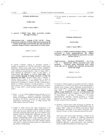 C 132/8 Dziennik Urzędowy Unii Europejskiej PL WYROK TRYBUNAŁU 28.5.2005 3) Nie ma podstaw do ograniczenia w czasie skutków niniejszego wyroku. (wielka izba) (1) Dz.U. C 171 z 19.7.2003. z dnia 15 marca 2005 r. w sprawie C-209/03 Dany Bidar przeciwko London Borough of Ealing (1) WYROK TRYBUNAŁU (Obywatelstwo Unii — Artykuły 12 WE i 18 WE — Pomoc przyznawana studentom w formie dofinansowywanej pożyczki — Przepis ograniczający przyznawanie tego typu pożyczki do studentów mających miejsce zamieszkania na terenie kraju) (trzecia izba) z dnia 17 marca 2005 r. (2005/C 132/14) (Język postępowania: angielski) W sprawie C-209/03, mającej za przedmiot wniosek o wydanie, na podstawie art. 234 WE, orzeczenia w trybie prejudycjalnym, złożony przez High Court of Justice (England & Wales), Queen's Bench Division (Administrative Court) (Zjednoczone Królestwo) postanowieniem z dnia 12 lutego 2003 r., które wpłynęło do Trybunału w dniu 15 maja 2003 r., w postępowaniu: The Queen, na wniosek: Dany Bidar, przeciwko London Borough of Ealing, Secretary of State for Education and Skills, Trybunał (wielka izba), w składzie: V. Skouris, Prezes, P. Jann, C. W. A. Timmermans, A. Rosas, K. Lenaerts (sprawozdawca) i A. Borg Barthet, prezesi izb, J. P. Puissochet, R. Schintgen, N. Colneric, M. Ilešič, J. Malenovský, J. Klučka i U. Lõhmus, sędziowie, rzecznik generalny: L. A. Geelhoed, sekretarz: H. von Holstein, zastępca sekretarza, wydał w dniu 15 marca 2005 r. wyrok, którego sentencja brzmi następująco: 1) Pomoc — czy to w formie dofinansowywanej pożyczki, czy też w formie stypendium — przyznana studentom przebywającym legalnie w przyjmującym Państwie Członkowskim i przeznaczona na pokrycie ich kosztów utrzymania jest dla potrzeb zakazu dyskryminacji ustanowionego w art. 12 akapit pierwszy WE objęta zakresem stosowania Traktatu. 2) Artykuł 12 akapit pierwszy WE należy interpretować w ten sposób, iż stoi on na przeszkodzie takiemu uregulowaniu krajowemu, które przyznaje studentom prawo do pomocy na pokrycie ich kosztów utrzymania jedynie wtedy, gdy są oni osiedleni w przyjmującym Państwie Członkowskim, wykluczając przy tym możliwość uzyskania przez będącego studentem obywatela innego Państwa Członkowskiego statusu osoby osiedlonej, nawet jeśli obywatel ten legalnie przebywa w przyjmującym Państwie Członkowskim, gdzie zdobył znaczną część swego średniego wykształcenia, przez co w sposób rzeczywisty związał się ze społeczeństwem tego Państwa Członkowskiego. w sprawie C-228/03 (wniosek Korkein oikeus o wydanie orzeczenia w trybie prejudycjalnym): The Gillette Company, Gillette Group Finland Oy przeciwko LA-Laboratories Ltd Oy (1) (Znaki towarowe — Dyrektywa 89/104/EWG — Art. 6 ust. 1 lit. c) — Ograniczenia ochrony przyznanej przez znak towarowy — Używanie znaku towarowego przez stronę trzecią gdy jest to niezbędne dla wskazania przeznaczenia towaru lub usługi) (2005/C 132/15) (Język postępowania: fiński) W sprawie C-228/03 mającej za przedmiot wniosek o wydanie, na podstawie art. 234 WE, orzeczenia w trybie prejudycjalnym, złożony przez Korkein oikeus (Finlandia) postanowieniem z dnia 23 maja 2003 r., które wpłynęło do Trybunału w dniu 26 maja 2003 r., w postępowaniu The Gillette Company, Gillette Group Finland Oy przeciwko LA-Laboratories Ltd Oy, Trybunał (trzecia izba), w składzie: A. Rosas, prezes izby, A. Borg Barthet, S. von Bahr, U. Lõhmus i A. Ó Caoimh (sprawozdawca), sędziowie, rzecznik generalny: A. Tizzano, sekretarz: R. Grass, wydał w dniu 17 marca 2005 r. wyrok, którego sentencja brzmi następująco: 1) Zgodność z prawem użycia znaku towarowego na podstawie art. 6 ust. 1 lit. c) pierwszej dyrektywy Rady 89/104/EWG z dnia 21 grudnia 1988 r. mającej na celu zbliżenie ustawodawstw Państw Członkowskich odnoszących się do znaków towarowych uzależniona jest od tego, czy służy to wskazaniu przeznaczenia towaru. Użycie przez stronę trzecią znaku towarowego, z którego nie jest ona uprawniona, jest niezbędne do wskazania przeznaczenia towaru sprzedawanego przez tę stronę trzecią, jeżeli stanowi to w praktyce jedyny sposób podania odbiorcom zrozumiałej i kompletnej informacji o jego przeznaczeniu, celem zachowania systemu niezakłóconej konkurencji na rynku tego towaru.