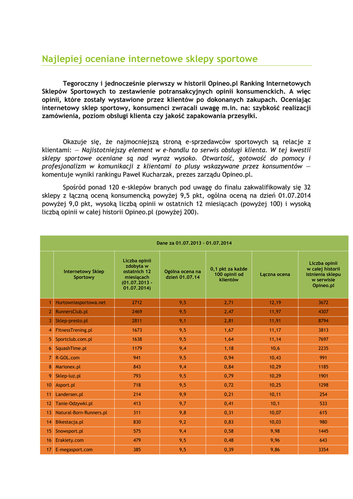 Najlepiej oceniane internetowe sklepy sportowe Tegoroczny i jednocześnie pierwszy w historii Opineo.pl Ranking Internetowych Sklepów Sportowych to zestawienie potransakcyjnych opinii konsumenckich. A więc opinii, które zostały wystawione przez klientów po dokonanych zakupach. Oceniając internetowy sklep sportowy, konsumenci zwracali uwagę m.in. na: szybkość realizacji zamówienia, poziom obsługi klienta czy jakość zapakowania przesyłki. Okazuje się, że najmocniejszą stroną e-sprzedawców sportowych są relacje z klientami: ― Najistotniejszy element w e-handlu to serwis obsługi klienta. W tej kwestii sklepy sportowe oceniane są nad wyraz wysoko. Otwartość, gotowość do pomocy i profesjonalizm w komunikacji z klientami to plusy wskazywane przez konsumentów ― komentuje wyniki rankingu Paweł Kucharzak, prezes zarządu Opineo.pl. Spośród ponad 120 e-sklepów branych pod uwagę do finału zakwalifikowały się 32 sklepy z łączną oceną konsumencką powyżej 9,5 pkt, ogólna oceną na dzień 01.07.2014 powyżej 9,0 pkt, wysoką liczbą opinii w ostatnich 12 miesiącach (powyżej 100) i wysoką liczbą opinii w całej historii Opineo.pl (powyżej 200). Dane za 01.07.2013 - 01.07.2014 Liczba opinii zdobyta w ostatnich 12 miesiącach (01.07.2013 01.07.2014) 1 Hurtowniasportowa.net Ogólna ocena na dzień 01.07.14 0,1 pkt za każde 100 opinii od klientów Łączna ocena Liczba opinii w całej historii istnienia sklepu w serwisie Opineo.pl 2712 9,5 2,71 12,19 3672 2 RunnersClub.pl 2469 9,5 2,47 11,97 4307 3 Sklep-presto.pl 2811 9,1 2,81 11,91 8794 4 FitnessTrening.pl 1673 9,5 1,67 11,17 3813 5 Sportclub.com.pl 1638 9,5 1,64 11,14 7697 6 SquashTime.pl 1179 9,4 1,18 10,6 2235 7 R-GOL.com 941 9,5 0,94 10,43 991 8 Marionex.pl 843 9,4 0,84 10,29 1185 9 Sklep-luz.pl 793 9,5 0,79 10,29 1901 10 Asport.pl 718 9,5 0,72 10,25 1298 11 Landersen.pl 214 9,9 0,21 10,11 254 12 Tanie-Odzywki.pl 413 9,7 0,41 10,1 533 13 Natural-Born-Runners.pl 311 9,8 0,31 10,07 615 14 Bikestacja.pl 830 9,2 0,83 10,03 980 15 Snowsport.pl 575 9,4 0,58 9,98 1445 16 Erakiety.com 479 9,5 0,48 9,96 643 17 E-megasport.com 385 9,5 0,39 9,86 3354 Internetowy Sklep Sportowy 18 Outdoorzy.pl 646 9,2 0,65 9,84 1734 19 Podstadionem.pl 426 9,4 0,43 9,83 1344 20 E-futbol.pl 164 9,7 0,16 9,83 1526 21 Badmin.pl 397 9,4 0,4 9,77 472 22 Athletic24.pl 211 9,6 0,21 9,77 309 23 Sportsales.pl 248 9,5 0,25 9,75 677 24 Sklep.sport-max.pl 509 9,2 0,51 9,73 743 25 Rowerzysta.pl 509 9,2 0,51 9,71 2519 26 CenterSport.pl 185 9,5 0,19 9,69 1682 27 PilkiFitness.pl 174 9,5 0,17 9,67 255 28 Megaoutdoor.pl 178 9,4 0,18 9,61 373 29 Sporti.pl 375 9,2 0,38 9,58 2098 30 SklepBiegacza.pl 373 9,2 0,37 9,57 438 31 Fitness.shop.pl 171 9,4 0,17 9,57 528 32 Arkus.sklep.pl 209 9,4 0,21 9,56 309 Najlepsi z najlepszych Pierwszą trójkę najlepiej ocenianych internetowych sprzedawców sportowych stanowią: Hurtowniasportowa.net, RunnersClub.pl i Sklep-presto.pl. Kim są liderzy opinii? Zielonogórska Hurtowniasportowa.net opinie konsumenckie gromadzi od 2012 r. Obecnie nie ma na swoim koncie żadnych negatywnych ocen. Klienci chwalą ją m.in. za szybką wysyłkę, darmową dostawę, profesjonalną obsługę i świetny kontakt. RunnersClub.pl podtrzymał pozycję wicelidera z lutowej edycji Rankingu Sklepów Internetowych. Choć dołączył do Opineo.pl dopiero w 2013 r., to pod względem dynamiki gromadzenia opinii i poziomu obsługi klienta trudno mu dorównać. Sklep-Presto.pl, dotychczasowy lider kategorii sportowej w całościowym Rankingu Internetowych Sklepów Sportowych z lutego br., w tym roku świętuje dziesięciolecie swojej działalności. Mimo trzeciej lokaty, wiedzie prym pod względem liczby opinii w historii Opineo.pl i liczby opinii w ostatnich 12 miesiącach. Dane za 01.07.2013 - 01.07.2014 Liczba opinii zdobyta w ostatnich 12 miesiącach (01.07.2013 01.07.2014) Ogólna ocena na dzień 01.07.14 0,1 pkt za każde 100 opinii od klientów Łączna ocena Liczba opinii w całej historii istnienia sklepu w serwisie Opineo.pl 1 Hurtowniasportowa.net 2712 9,5 2,71 12,19 3672 2 RunnersClub.pl 2469 9,5 2,47 11,97 4307 3 Sklep-presto.pl 2811 9,1 2,81 11,91 8794 Internetowy Sklep Sportowy W całym rankingu zauważalny jest awans sklepów: Hurtowniasportowa.net (absolutny lider pod względem łącznej oceny konsumenckiej), FitnessTrening.pl, R- GOL.com, Marionex.pl i Asport.pl ― w stosunku do całościowego Rankingu Internetowych Sklepów Sportowych z lutego. Najwyższą ogólną ocenę na dzień 01.07.2014 uzyskał Landersen.pl ― 9,9 pkt. ― sklep oferujący sprzęt i akcesoria turystyczne dla miłośników górskich wycieczek, trekkingu i aktywnego wypoczynku. Pod względem liczby opinii zdobytej w ostatnich 12 miesiącach (01.07.2013 ― 01.07.2014) prym wiedzie pierwsza trójka: Sklep-Presto.pl, Hurtowniasportowa.net i RunnersClub.pl. Wyraźnie odcinają się od pozostałych sklepów, notując liczbę opinii grubo powyżej 2000. Mówiąc o liczbie opinii w całej historii istnienia sklepu w serwisie Opineo.pl, nie można wspomnieć o Sportclub.com.pl, FitnessTrening.pl i E-megasport.com, które wraz ze złotą trójką sklepów sportowych wysuwają się na czoło rankingu. Notują ponad 3000 opinii. Jak oceniamy internetowe sklepy sportowe? Klienci chwalą internetowe sklepy sportowe za kulturalną obsługę i profesjonalne podejście oraz doradztwo przy wyborze produktu. Na plus wskazują też błyskawiczną realizację zamówienia, możliwość śledzenia statusu zamówienia, łatwość w wyszukiwaniu produktów na stronie internetowej sklepu. Jeśli zaś się skarżą, to przede wszystkim na fakt, że sprzedawcy mylą kolory zamówionych przedmiotów, a towar mógłby być lepiej zapakowany. W paczce z zamówionym towarem (np. w przypadku sprzętu do ćwiczeń) oczekują instrukcji w języku polskim, gwarancji oraz narzędzi umożliwiających skręcenie czy samodzielne złożenie sprzętu. Przykładowe opinie: Ekstra sklep, zwła