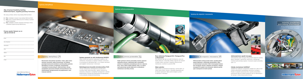 Systemy identyfikacji Systemy ochrony przewodów Aby otrzymać bezpłatny katalog HellermannTyton, wypełnij poniższy formularz. Systemy do wiązania i mocowania Nie szukaj już dłużej. Zamów nowy katalog HellermannTyton. Tak, chciał(a)bym otrzymać nowy katalog HellermannTyton Tak, proszę o kontakt telefoniczny lub e-mailowy w sprawie waszych produktów Tak, chciał(a)bym otrzymać najnowsze informacje o firmie i produktach poprzez pocztę elektroniczną Łatwiej znajdziesz potrzebną informację! Nowy katalog HellermannTyton z wygodnym systemem nawigacji. Proszę wysłać faksem na nr: +48 22 673 89 54 Firma: Imię i Nazwisko: Stanowisko: Ulica: Telefon: Faks: Systemy identyfikacji E-Mail: www.HellermannTyton.pl Niesamowita różnorodność sposobów i miejsc, gdzie można stosować oznaczniki, szyldy oznaczeniowe, czy etykiety powoduje konieczność posiadania szerokiej palety systemów identyfikacji. Do druku na etykietach, przywieszkach i koszulkach termokurczliwych, HellermannTyton oferuje samodzielnie opracowane drukarki termotransferowe oraz wielofunkcyjne oprogramowanie do projektowania i automatyzacji wydruku. System oznaczeń ze stali nierdzewnej M-BOSS System M-BOSS jest systemem wytłaczanych szyldów ze stali nierdzewnej, mocowanych na opaskach stalowych. Oznaczenia te są stosowane do identyfikacji kabli i rur w trudnych warunkach pod względem mechanicznym i chemicznym. Bezhalogenowa koszulka termokurczliwa TLFX TLFX jest cienkościenną, bezhalogenową koszulką termokurczliwą. Dzięki niskiej emisji dymu i gazów, może być ona stosowana w obszarach o szczególnych wymaganiach w zakresie bezpieczeństwa. Koszulka jest przystosowana do wykonywania na niej nadruków metodą termotransferową. Systemy ochrony przewodów Dzięki systemom ochrony przewodów możemy zapewnić optymalną ochronę i organizację kabli i przewodów zarówno w środowisku przemysłowym jak też w obszarze biura i domu. Różne rodzaje oplotów, węży i rur osłonowych gwarantują wysoką odporność na uszkodzenia mechaniczne oraz łatwy montaż. Rury osłonowe Flexiguard NS i Flexiguard Plus z akcesoriami Rury osłonowe tego typu są w pełni hermetyczne, a przy tym bardzo elastyczne i wytrzymałe. Dlatego mogą być one używane w bardzo ciężkich warunkach. Flexiguard oferują ochronę mechaniczną i szczelność na poziomie IP68. Węże spiralne Węże spiralne są stosowane do organizacji i ochrony kabli i rur. Szeroki zakres średnic, kolorów i materiałów dopasowany jest do różnych zastosowań. Węże spiralne dostępne są także w odcinkach 5 metrowych. Systemy do wiązania i mocowania HellermannTyton oferuję szeroki zakres, wysokiej jakości opasek kablowych o doskonałej wytrzymałości, także w ekstremalnych warunkach. Zbiór innowacyjnych elementów mocujących, łącznie z opaskami mocującymi, cokołami mocującymi do opasek oraz uchwytami, zapewnia perfekcyjne rozwiązanie do twoich potrzeb. Jednoczęściowe opaski mocujące Jednoczęściowe opaski mocujące oferują idealne połączenie wysokiej jakości materiałów z wyśmienitym wykonaniem, udostępniając możliwość jednoczesnego wiązania i mocowania wiązek przewodów, osłon i rur. Cokoły montażowe SolidTack® SolidTack®jest najlepszym rozwiązaniem wszędzie tam, gdzie nie jest możliwe zastosowanie standardowych elementów mocujących. Posiada on specjalnie opracowany klej o wysokiej wytrzymałości, przeznaczony także do trudnych powierzchni jak np. lakierowanych i do tworzyw o niskiej energii powierzchniowej. Narzędzia montażowe Technika elektroinstalacyjna Produkty izolacyjne Nawigacja produktowa Nie potrzebujesz szukać już dłużej Z pomocą praktycznego systemu nawigacji w katalogu HellermannTyton znajdziesz szybko, całkiem prosto właściwy produkt odpowiedni do twoich potrzeb. Dobrze opracowane oznaczenia kolorystyczne, łatwo zrozumiałe piktogramy i rozszerzony przegląd produktów poprowadzą cię szybko do oczekiwanego produktu. Zamów swój bezpłatny egzemplarz! Każda grupa produktów jest oznaczona swoim indywidualnym kolorem, pozwalając zawsze na określenie gdzie się znajdujesz w danym momencie. Jeśli wiesz dokładnie czego szukasz, nasze nowe piktogramy pomogą ci dotrzeć bezpośrednio do produktu, który potrzebujesz. Produkty izolacyjne Szczególnie przydatny jest rozszerzony wykaz produktów umieszczony na rozkładanej karcie tylnej okładki. Jedno spojrzenie pozwala odnaleźć konkretny produkt. Rury i kształtki termokurczliwe są stosowane ogólnie do izolacji elektrycznej i ochrony mechanicznej przewodów i kabli. Szeroki wybór materiałów, zakresów skurczu, rozmiarów, kolorów i długości umożliwia stosowanie w wielu różnych aplikacjach. Rury termokurczliwe TFE TFE są rurami termokurczliwymi o bardzo cienkiej ściance oraz o wysokiej odporności mechanicznej i chemicznej. Ze względu na wyśmienitą wytrzymałość na wysokie temperatury, mogą być one używane w różnych obszarach zastosowań. Rury termokurczliwe TR27 TR27 są cienkościennymi, bezhalogenowymi i samogasnącymi rurami termokurczliwymi. Dzięki swojej wyśmienitej odporności na płomień i niskiej emisji dymu podczas spalania, rury tego typu mogą być stosowane w budynkach użyteczności publicznej lub w obszarach o wysokim poziomie bezpieczeństwa. Technika elektroinstalacyjna Także w obszarze techniki instalacyjnej możliwe jest ułatwienie pracy. Seria HelaCon składająca się z innowacyjnych złączek instalacyjnych zapewnia proste i bezpieczne łączenie kabli i przewodów, także elastycznych. Seria HelaCon oferuje szeroką paletę złączek do różnych średnic i typów przewodów, odpowiadającą większości spotykanych zastosowań. HelaCon Plus HelaCon Plus jest innowacyjną złączką instalacyjną do profesjonalnego łączenia obwodów elektrycznych w obszarze instalacji budynkowych. Podwójna sprężyna ułatwia wprowadzenie przewodów, a przezroczysta obudowa pozwala na