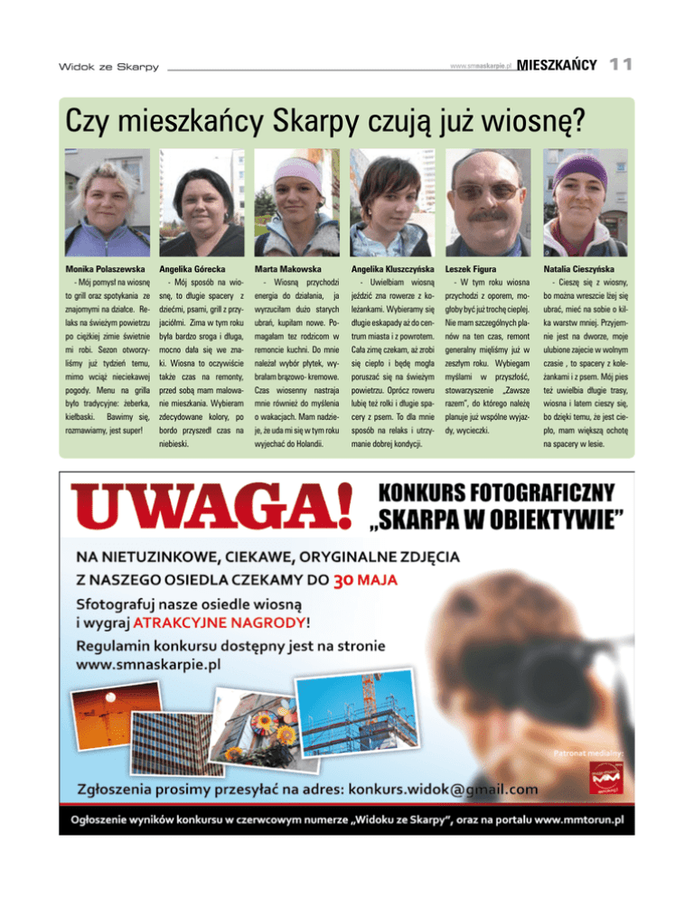 Widok ze Skarpy www.smnaskarpie.pl mieszkańcy 11 Czy mieszkańcy Skarpy czują już wiosnę? Monika Polaszewska - Mój pomysł na wiosnę to grill oraz spotykania ze znajomymi na działce. Relaks na świeżym powietrzu po ciężkiej zimie świetnie mi robi. Sezon otworzyliśmy już tydzień temu, mimo wciąż nieciekawej pogody. Menu na grilla było tradycyjne: żeberka, kiełbaski. Bawimy się, rozmawiamy, jest super! Angelika Górecka - Mój sposób na wiosnę, to długie spacery z dziećmi, psami, grill z przyjaciółmi. Zima w tym roku była bardzo sroga i długa, mocno dała się we znaki. Wiosna to oczywiście także czas na remonty, przed sobą mam malowanie mieszkania. Wybieram zdecydowane kolory, po bordo przyszedł czas na niebieski. Marta Makowska - Wiosną przychodzi energia do działania, ja wyrzuciłam dużo starych ubrań, kupiłam nowe. Pomagałam tez rodzicom w remoncie kuchni. Do mnie należał wybór płytek, wybrałam brązowo- kremowe. Czas wiosenny nastraja mnie również do myślenia o wakacjach. Mam nadzieje, że uda mi się w tym roku wyjechać do Holandii. Angelika Kluszczyńska - Uwielbiam wiosną jeździć zna rowerze z koleżankami. Wybieramy się długie eskapady aż do centrum miasta i z powrotem. Cała zimę czekam, aż zrobi się ciepło i będę mogła poruszać się na świeżym powietrzu. Oprócz roweru lubię też rolki i długie spacery z psem. To dla mnie sposób na relaks i utrzymanie dobrej kondycji. Leszek Figura - W tym roku wiosna przychodzi z oporem, mogłoby być już trochę cieplej. Nie mam szczególnych planów na ten czas, remont generalny mięliśmy już w zeszłym roku. Wybiegam myślami w przyszłość, stowarzyszenie „Zawsze razem”, do którego należę planuje już wspólne wyjazdy, wycieczki. Natalia Cieszyńska - Cieszę się z wiosny, bo można wreszcie lżej się ubrać, mieć na sobie o kilka warstw mniej. Przyjemnie jest na dworze, moje ulubione zajecie w wolnym czasie , to spacery z koleżankami i z psem. Mój pies też uwielbia długie trasy, wiosna i latem cieszy się, bo dzięki temu, że jest ciepło, mam większą ochotę na spacery w lesie.